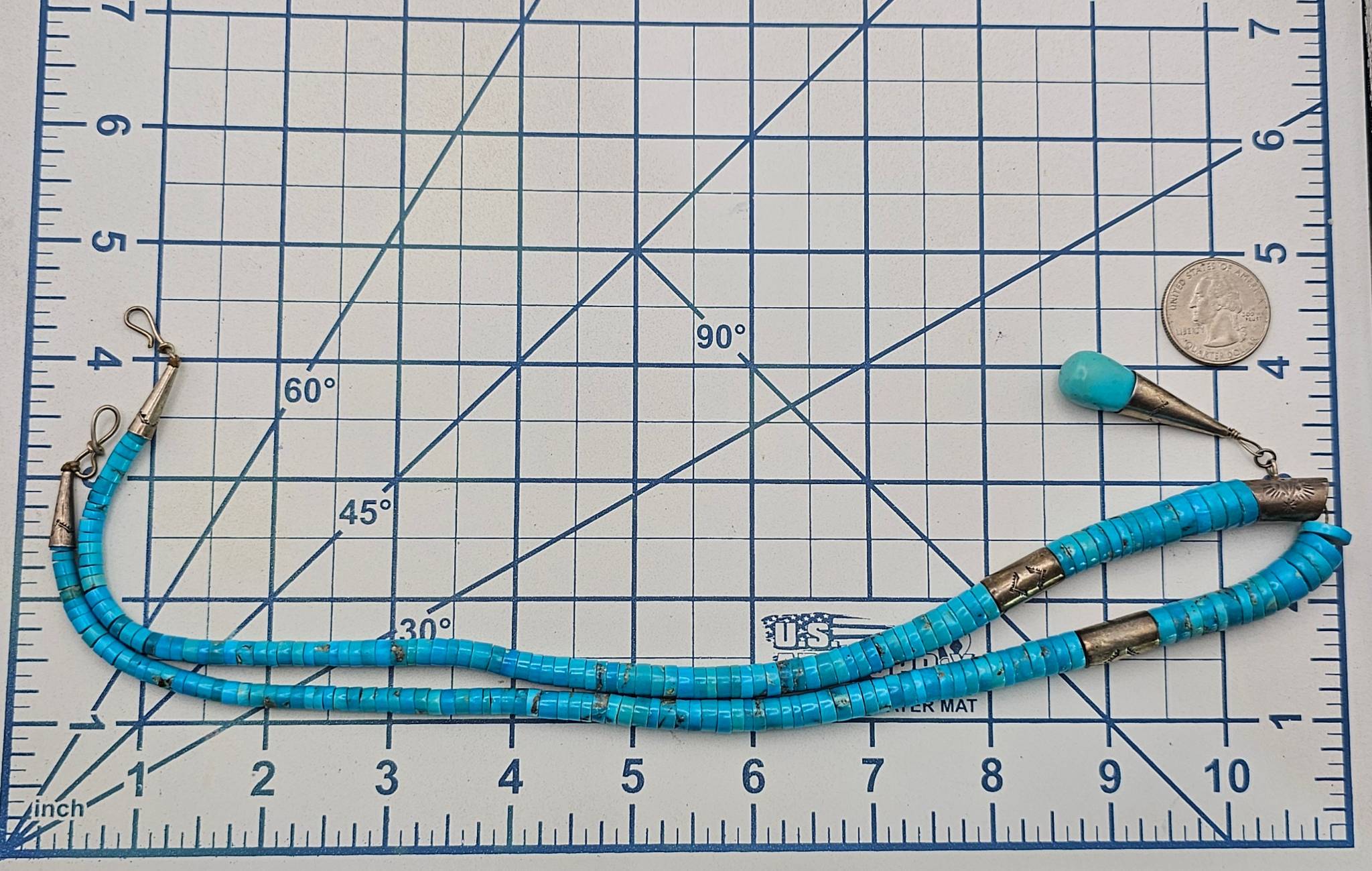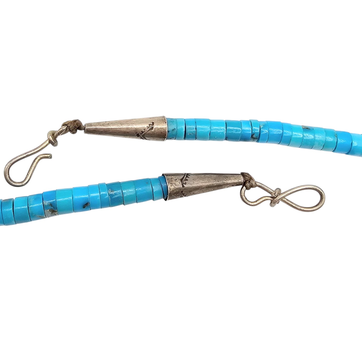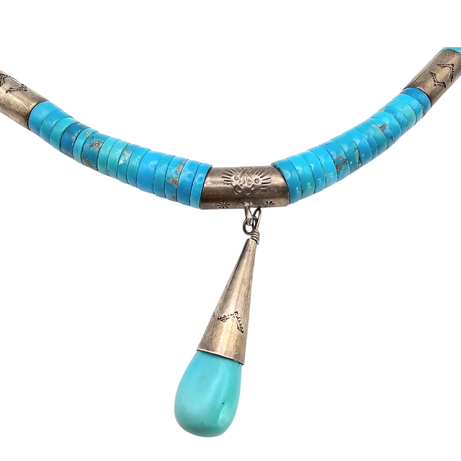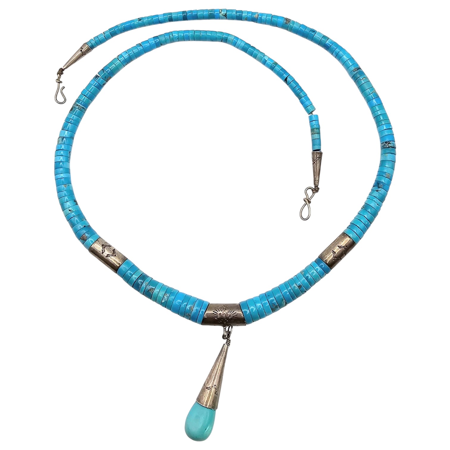 Santo Domingo sterling silver necklace featuring turquoise heishi beads and a drop pendant. The necklace showcases intricate silverwork on the connectors and the tapered pendant spike. Weighing 59.6 grams, the necklace includes a hook clasp for secure fastening. The design emphasizes traditional Navajo craftsmanship and aesthetics.
