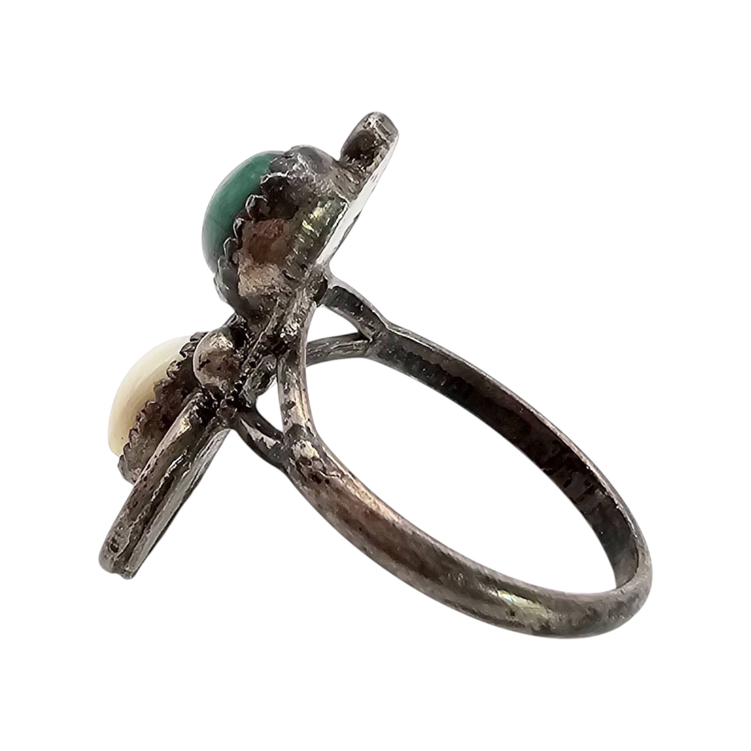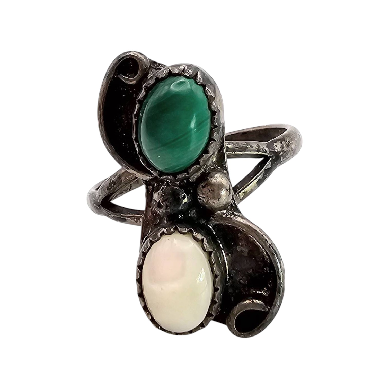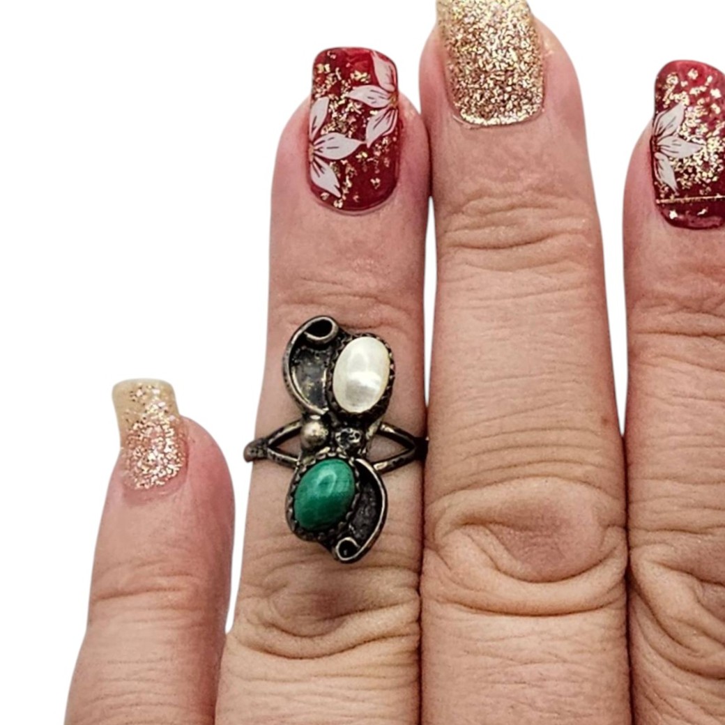 Navajo ring crafted in sterling silver, featuring malachite and mother of pearl cabochon accents. Ring size is 5.5, and the piece weighs approximately 2.8 grams. The design includes a curved band with ornate details around the stones.