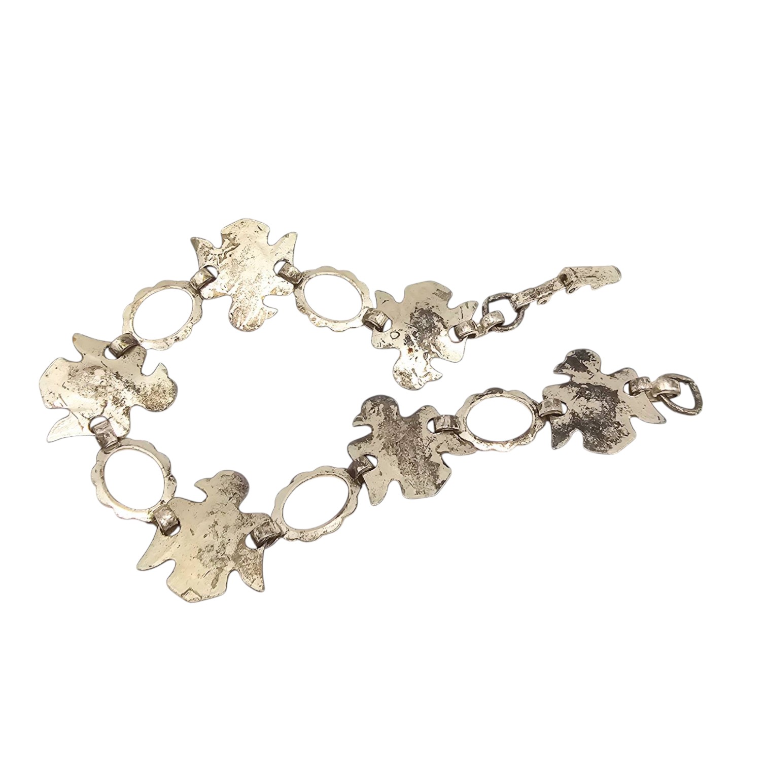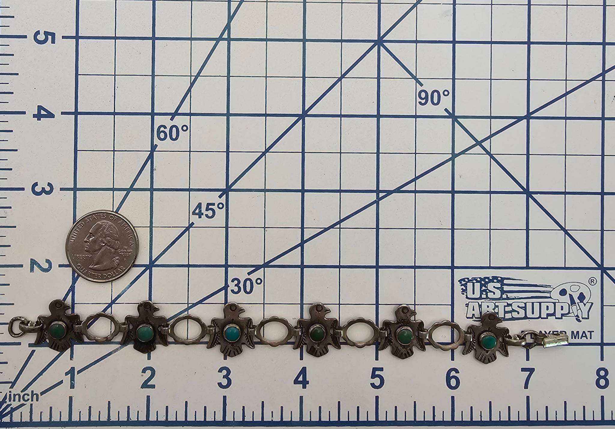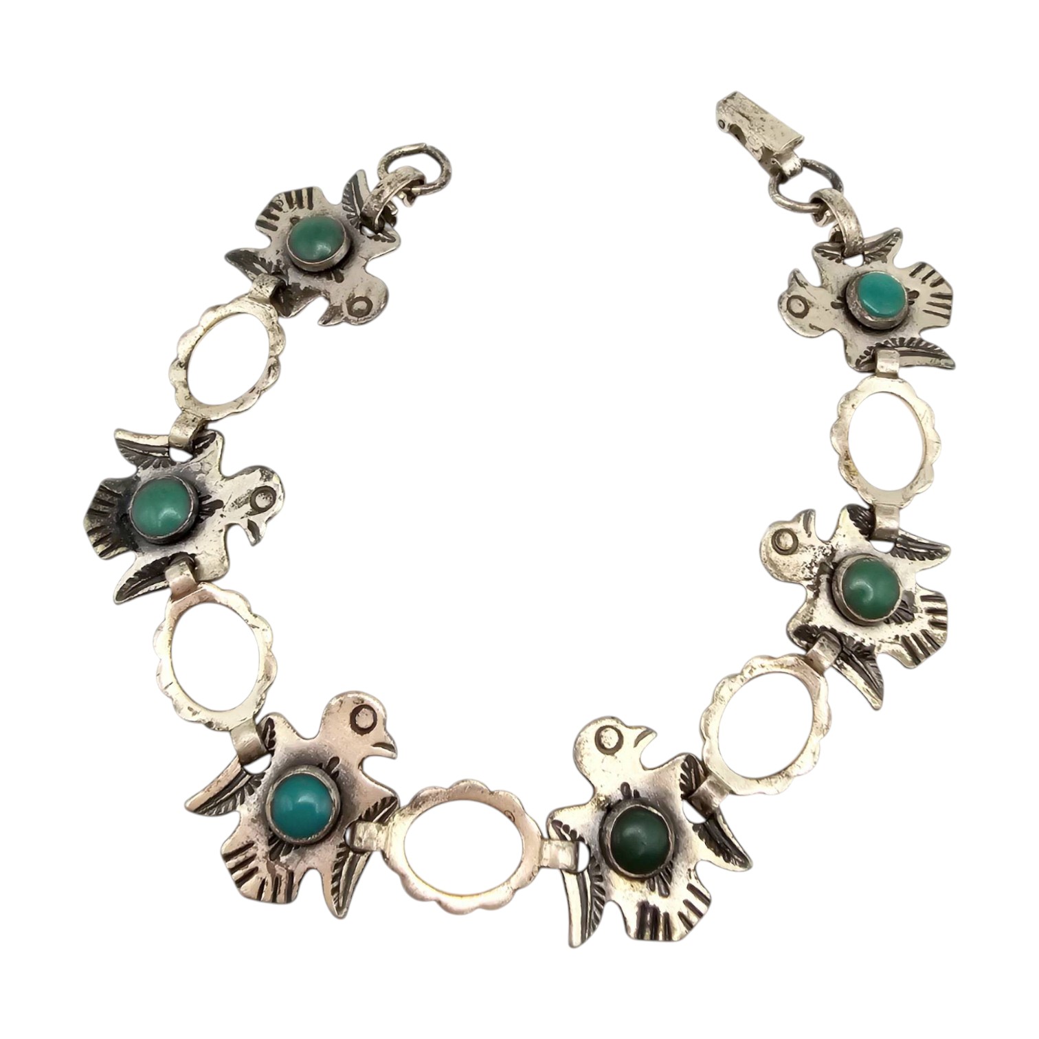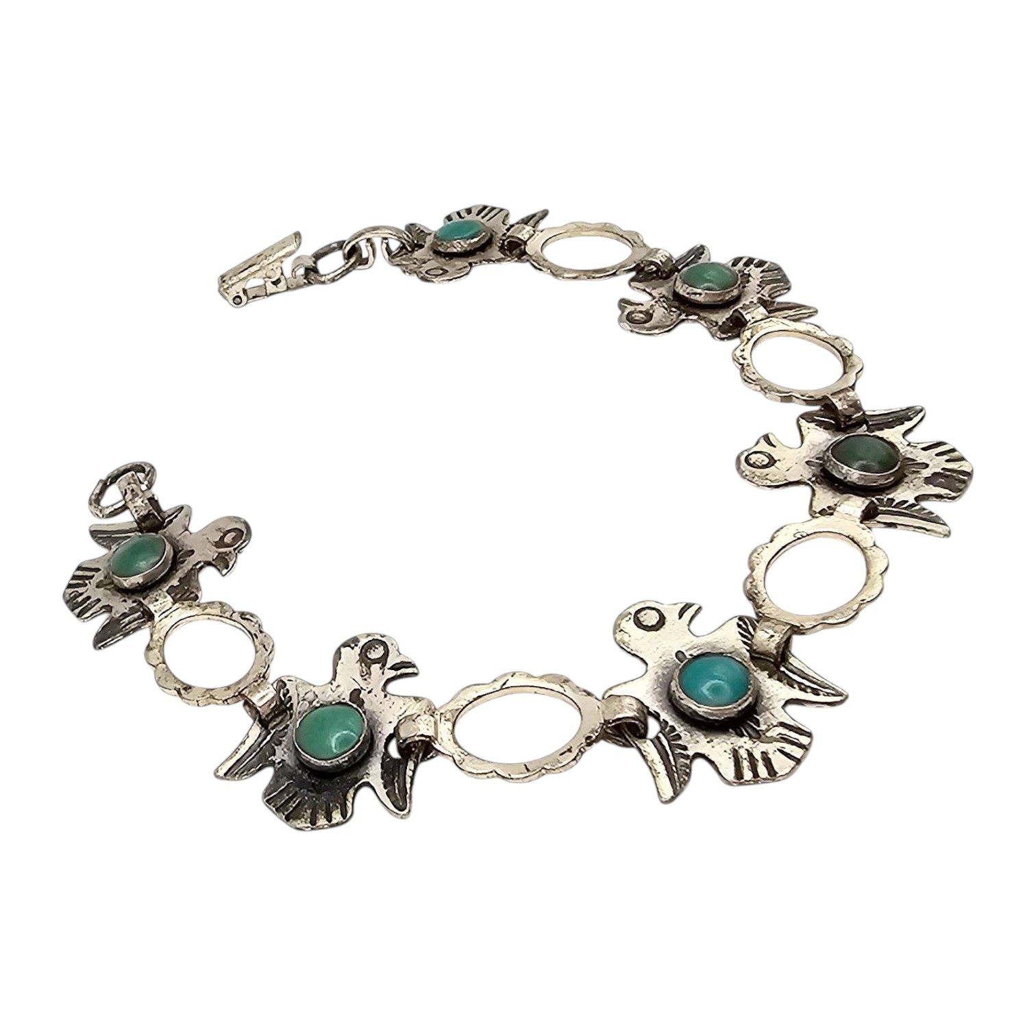 Fred Harvey Era Navajo-style sterling silver link bracelet featuring Thunderbird designs accented with turquoise cabochons. The bracelet is sterling silver and weighs 12 grams. Approximately 7 inches in length with a secure clasp. The piece showcases classic Southwestern craftsmanship and symbolism.