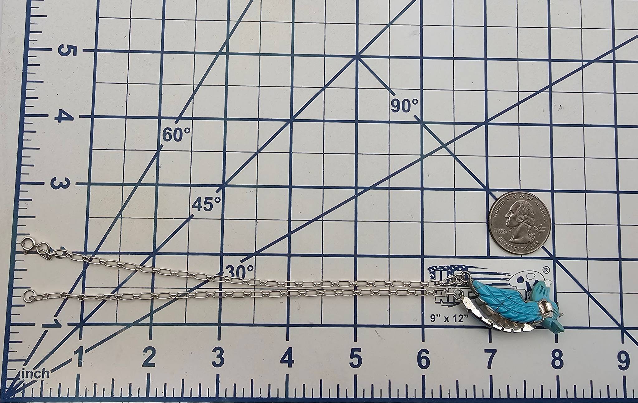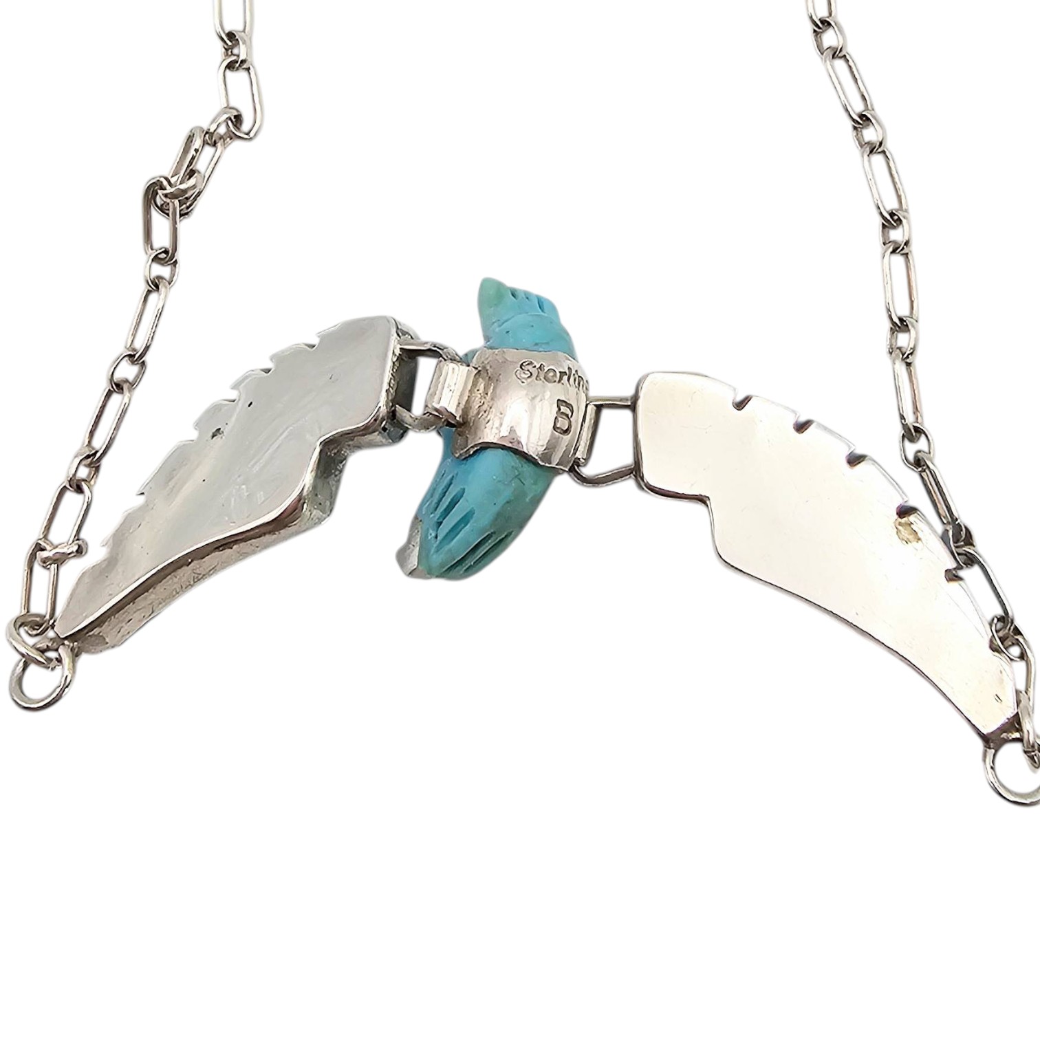 Ben Livingston, signed BL, this sterling silver necklace features a detailed carved turquoise eagle with movable wings. The necklace weighs 9.7 grams and showcases an intricate design paired with a chain. The eagle’s wings are articulated, adding dynamic movement to the piece.