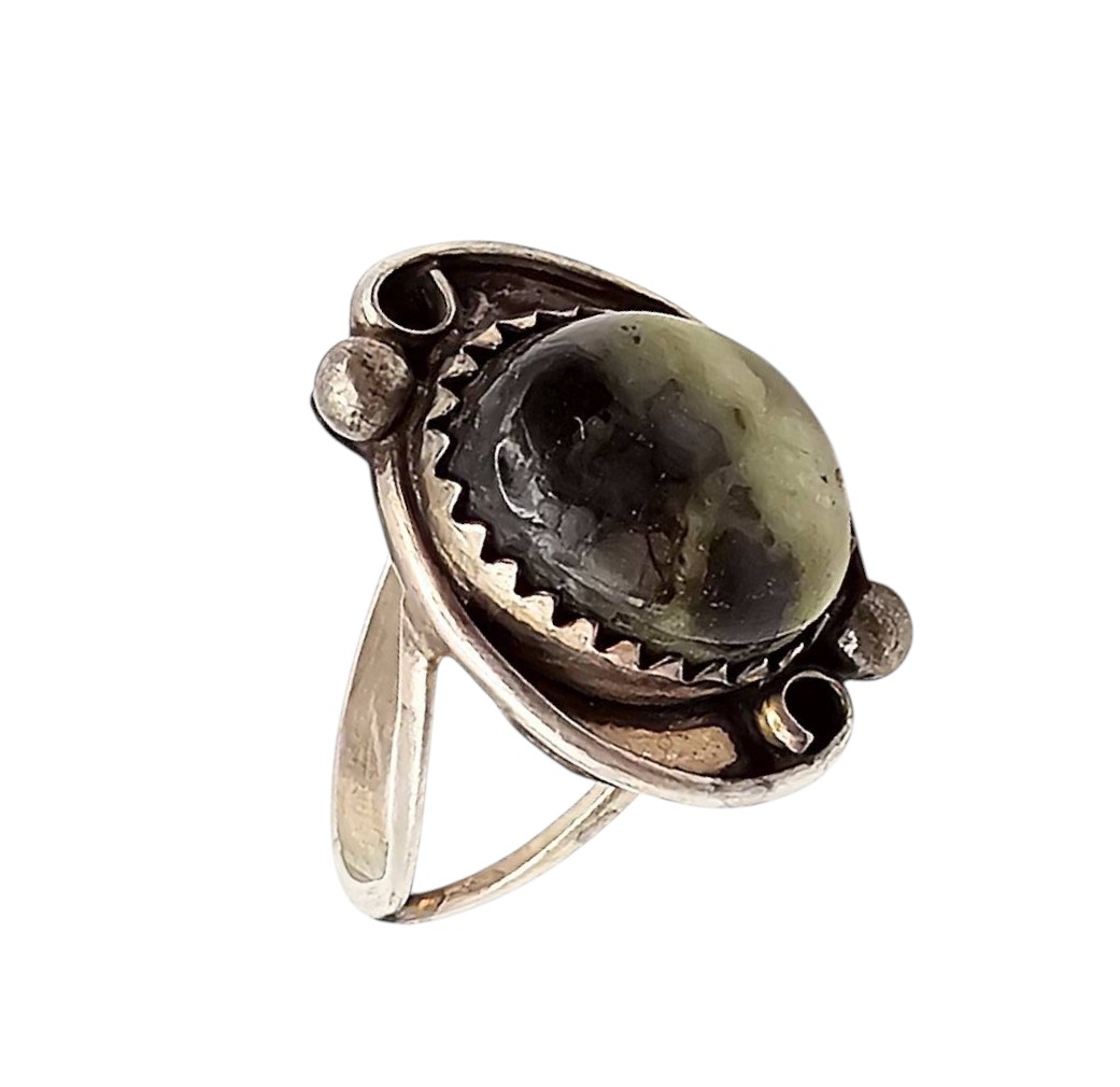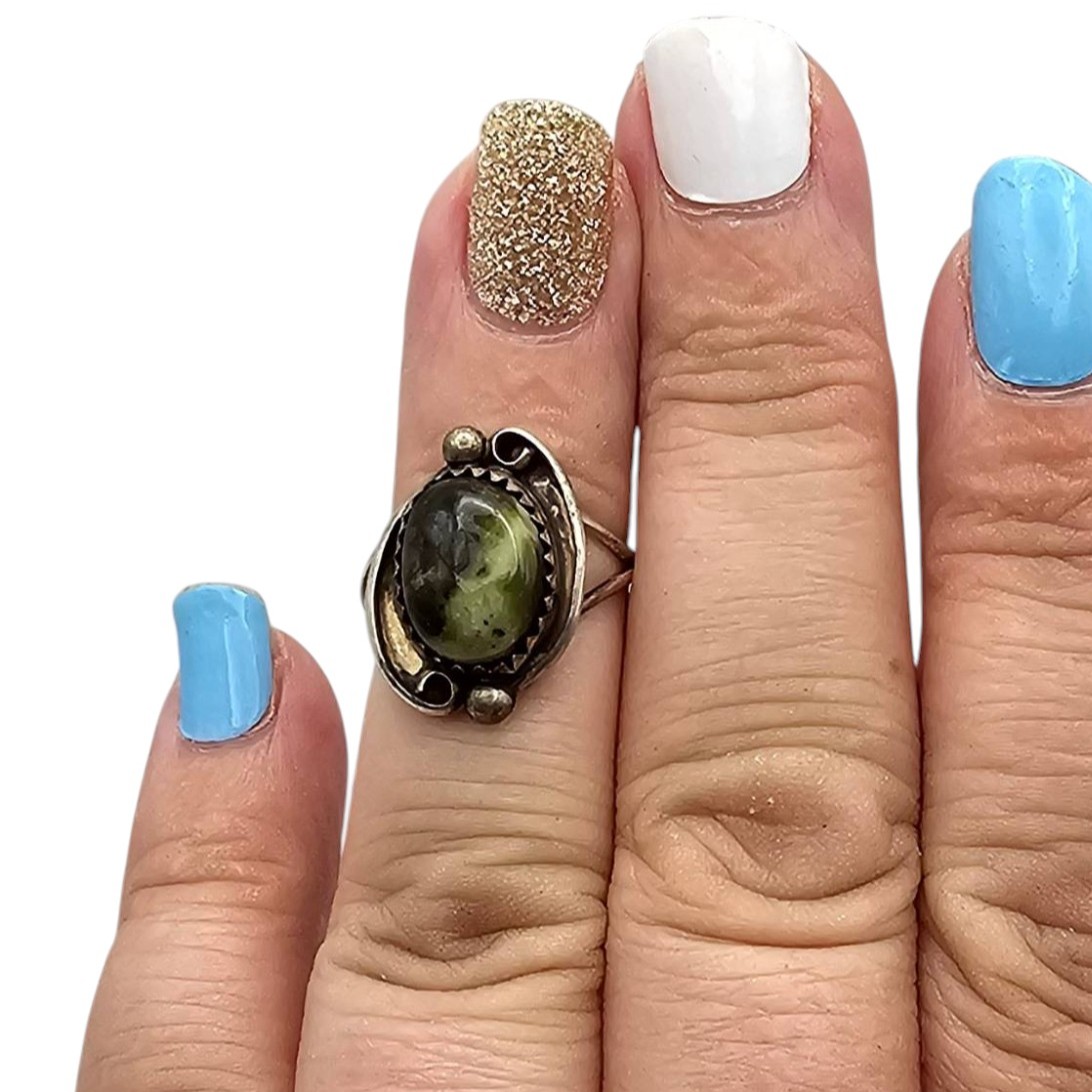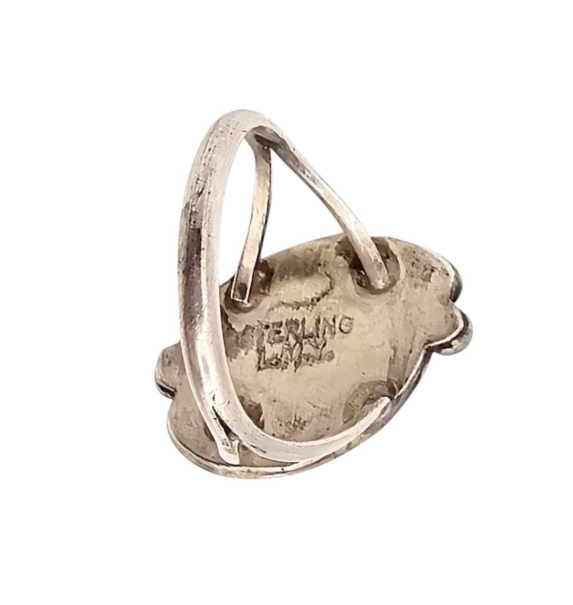 Handcrafted sterling silver Navajo ring by Larry Moses Yazzie featuring an agate stone centerpiece. The ring is marked on the reverse and measures size 5. Weighing approximately 3.1 grams, it showcases intricate silversmith work with a classic Navajo design.
