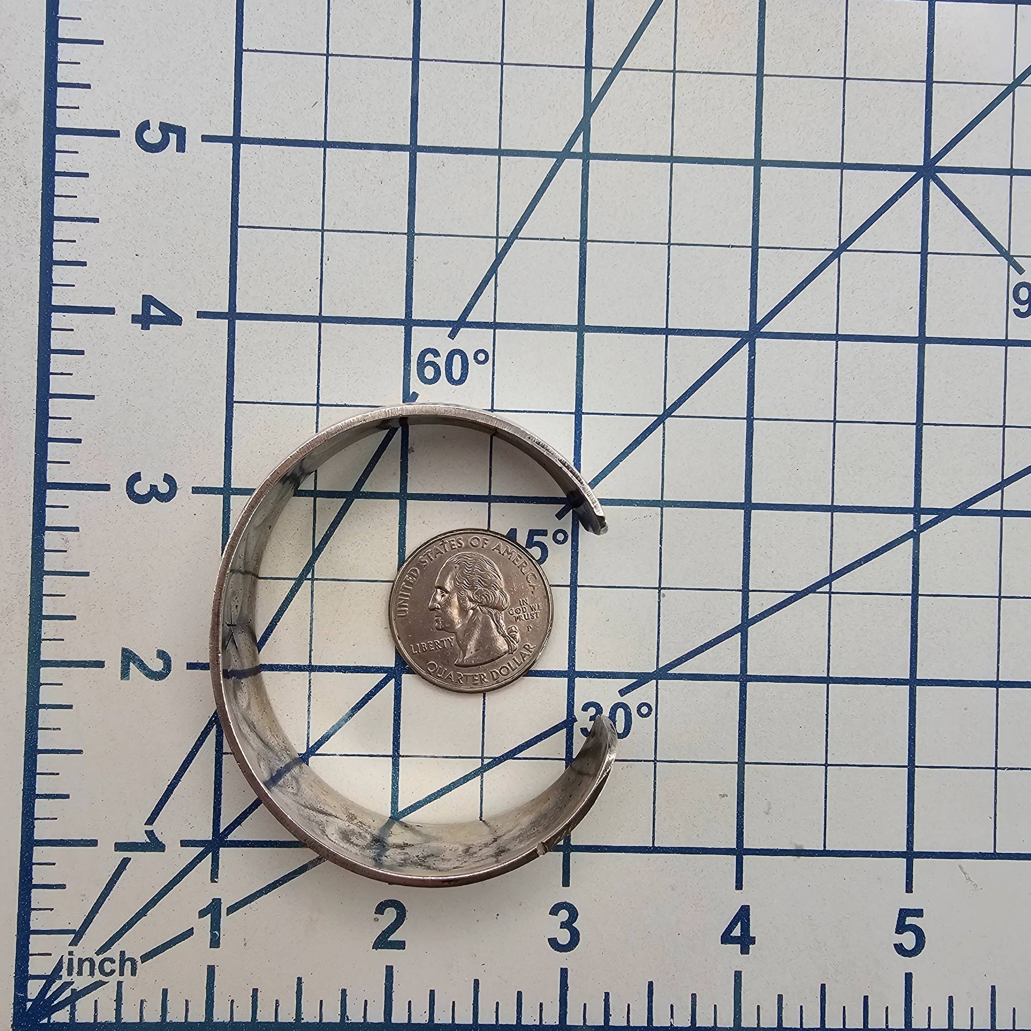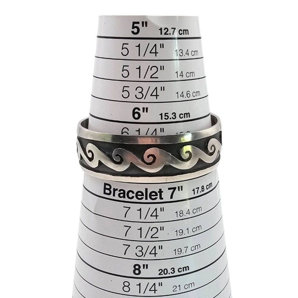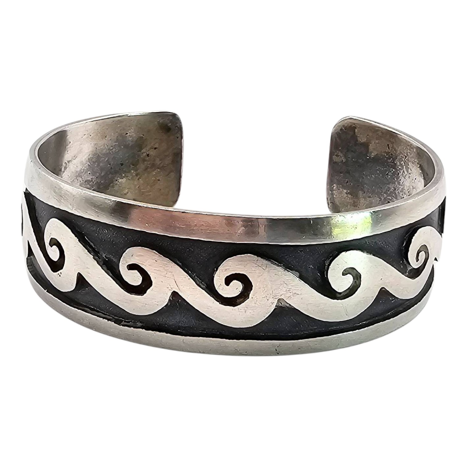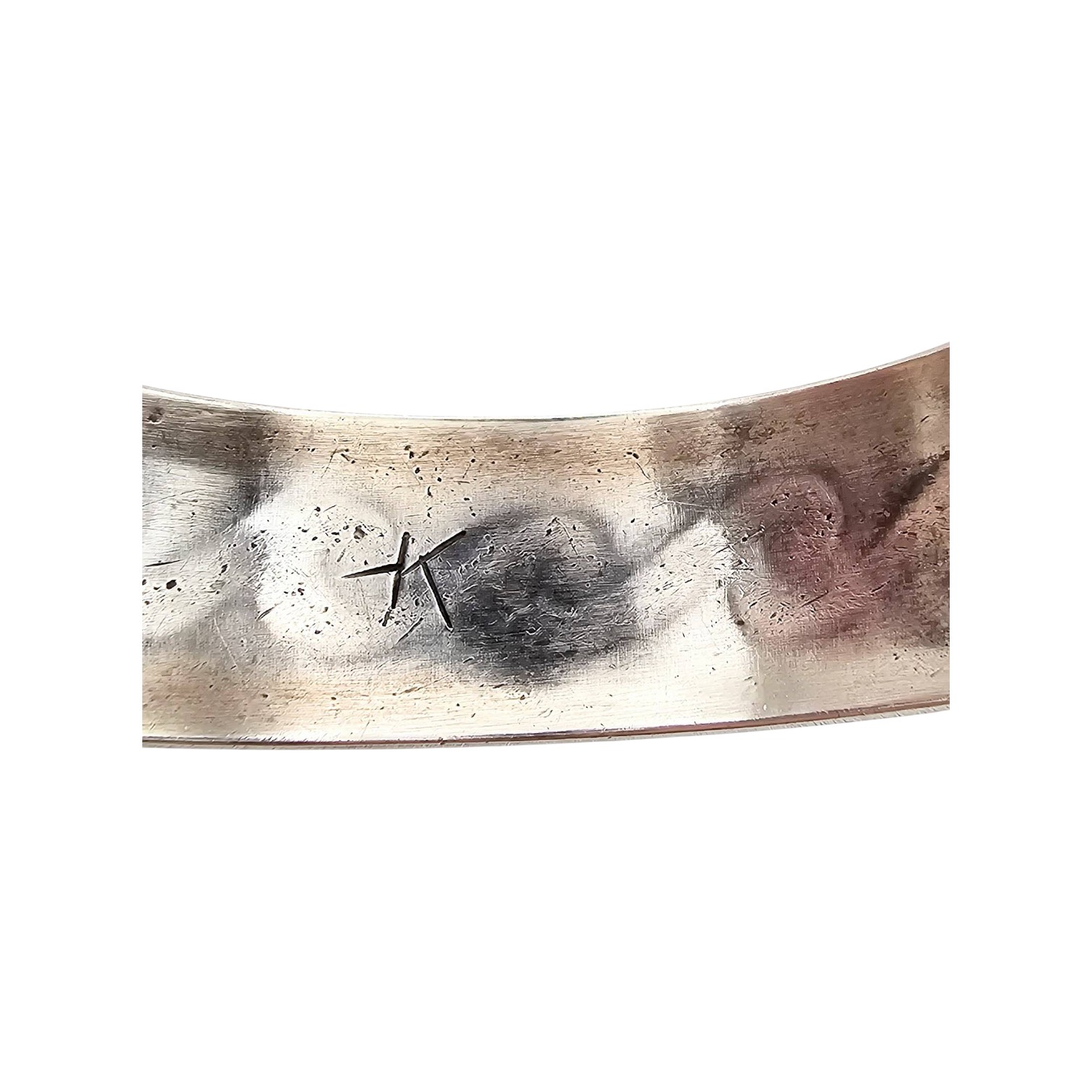 Sterling silver Native cuff bracelet weighing approximately 34.6g. Signed with the hallmark ‘K’. The bracelet features an applied ornamental scroll design characterized by high contrast with blackened recesses. Measures approximately 6 inches in overall circumference, as marked on a sizing gauge. Crafted from solid sterling silver