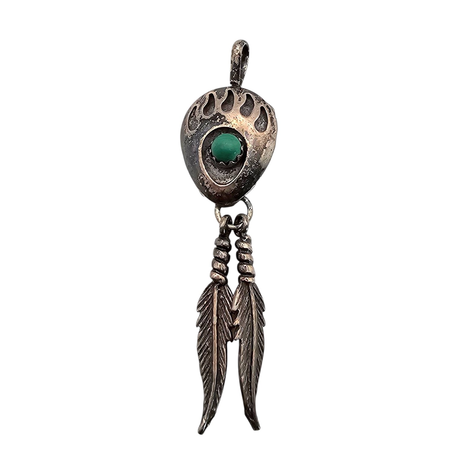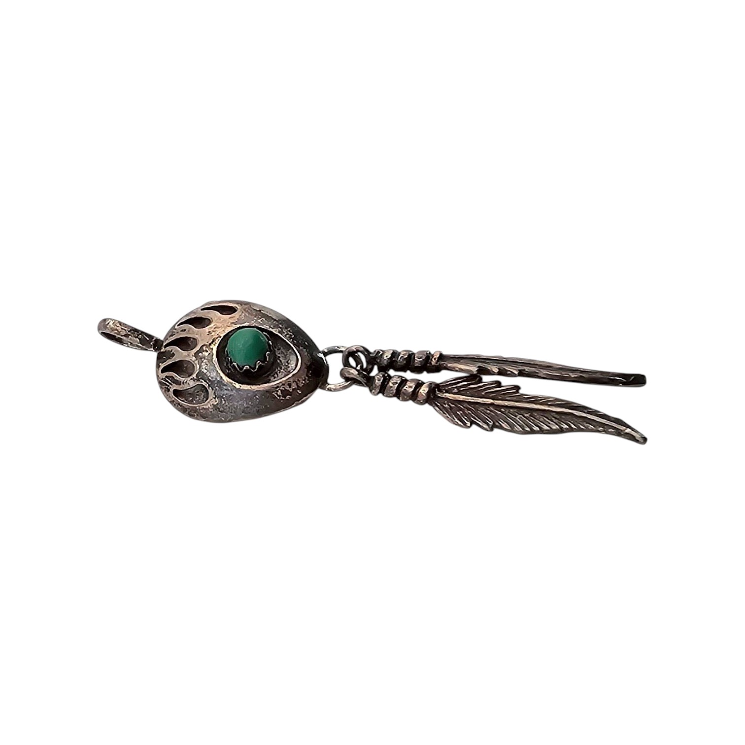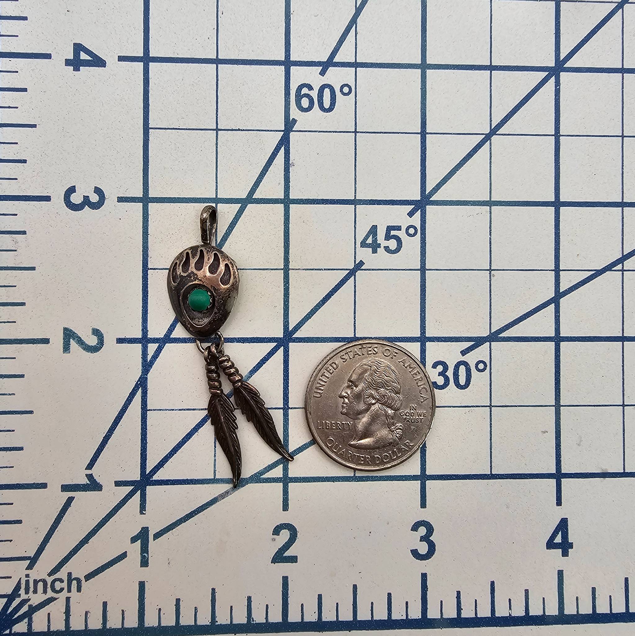 Navajo-made sterling silver bear paw pendant with a central turquoise cabochon. Features two detailed feather dangles and weighs 2.7 grams. The design incorporates traditional Native American symbolism. Size and scale are shown for reference with the coin and ruler in the photo.