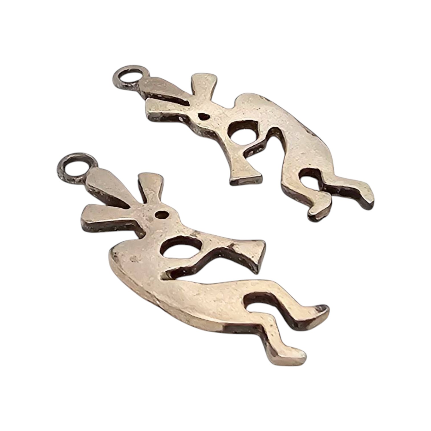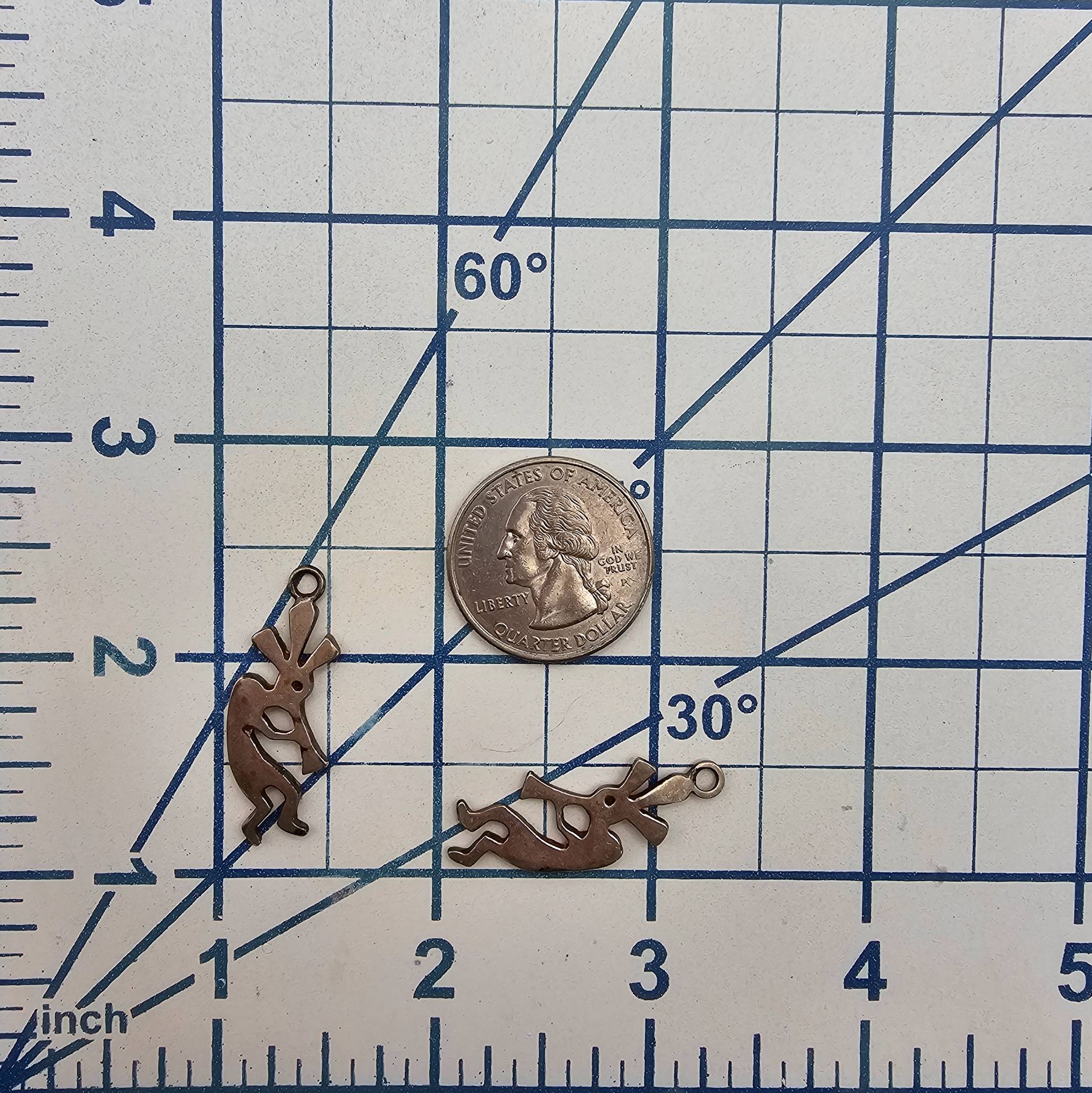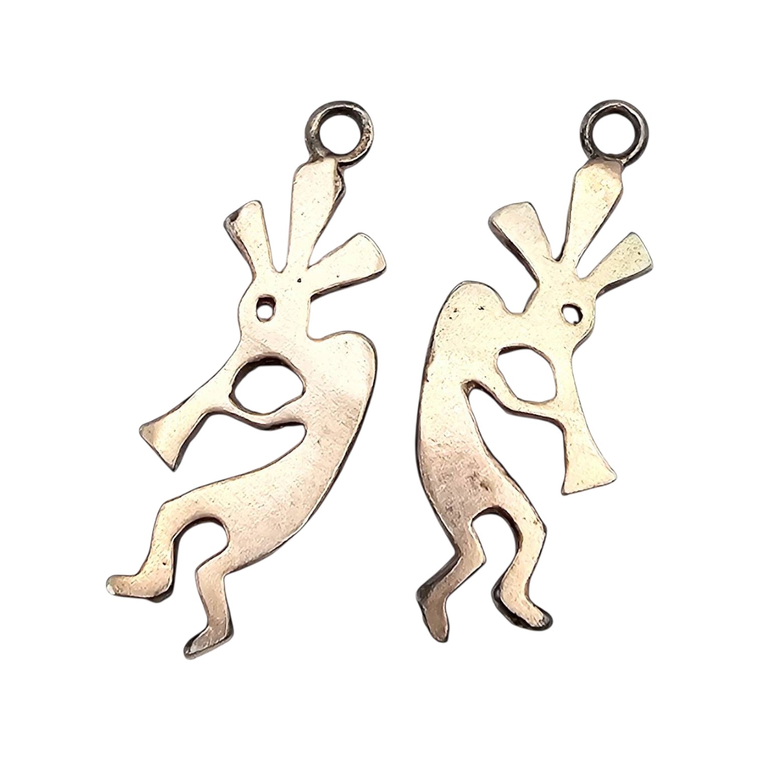 Navajo-crafted Kokopelli dancer earring pieces made from sterling silver. Each piece depicts the traditional Kokopelli figure, a flute player known in Native American culture. Total weight is 5 grams. Suitable for use in creating earrings or as charms. Approximate dimensions are visible alongside a ruler for scale.