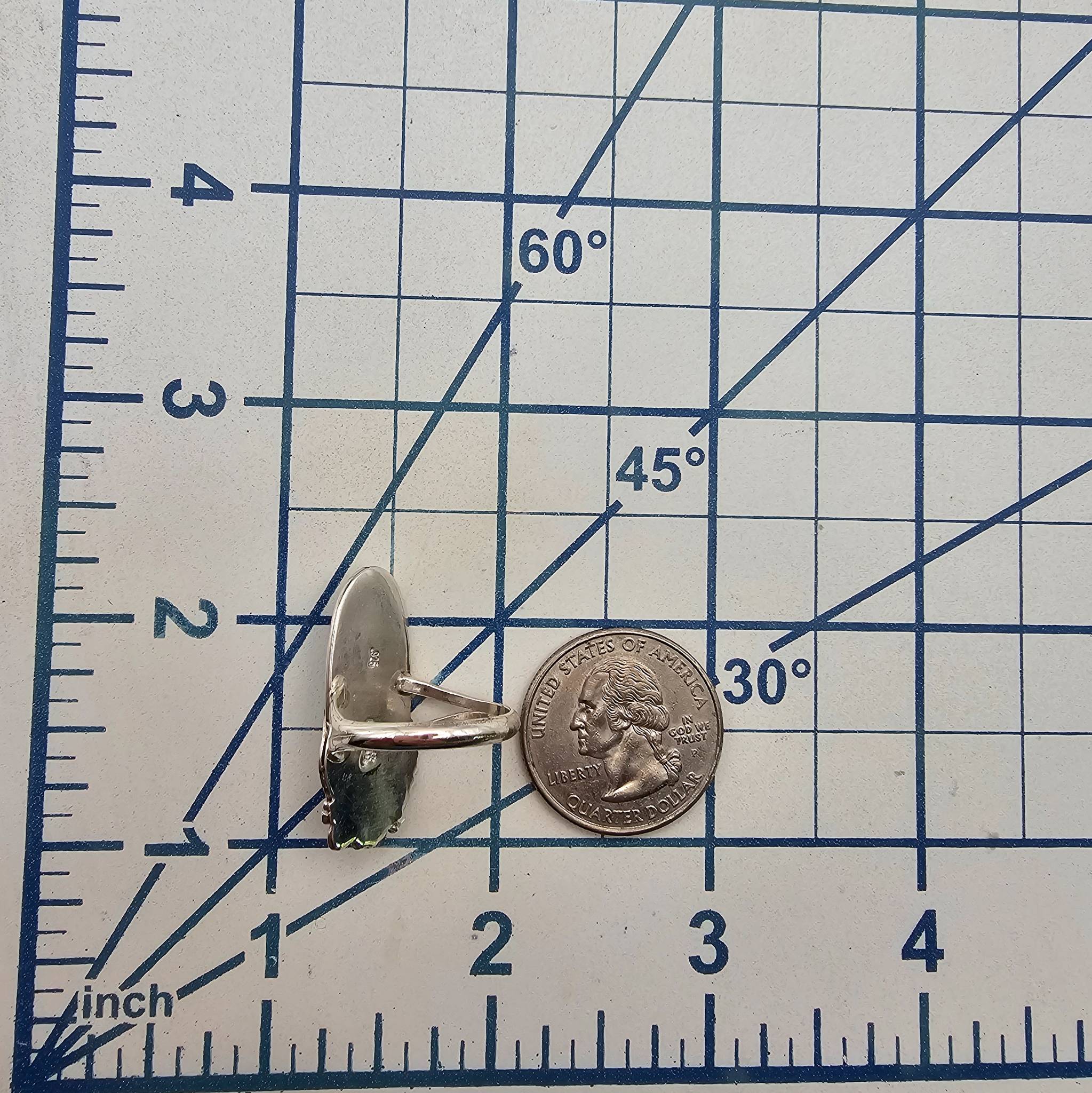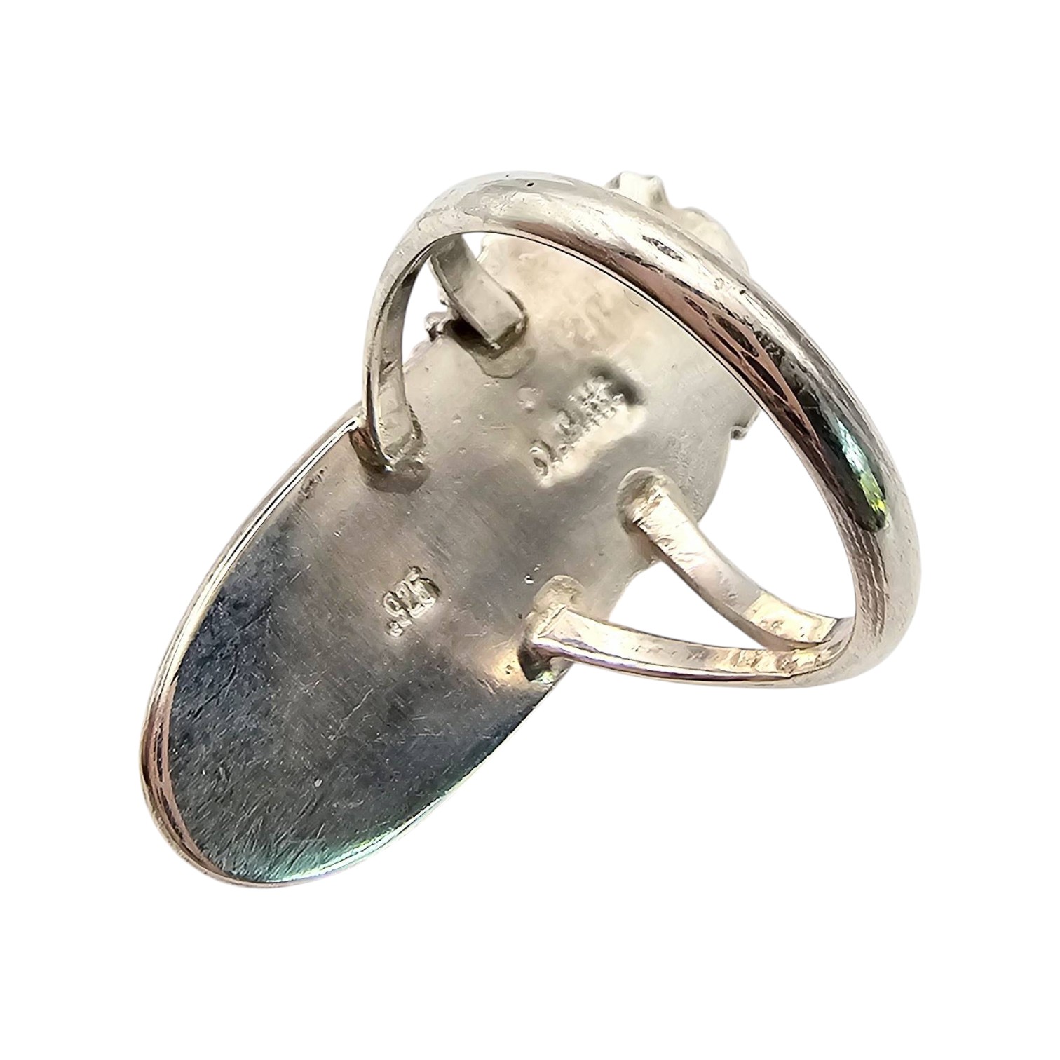 Sterling silver ring featuring an oval turquoise centerpiece with black veining. The design includes floral and leaf motifs, and the ring is signed on the underside. The band size is 7.5, and the ring weighs 5.4 grams. Detailed craftsmanship is evident in the ornate embellishments.