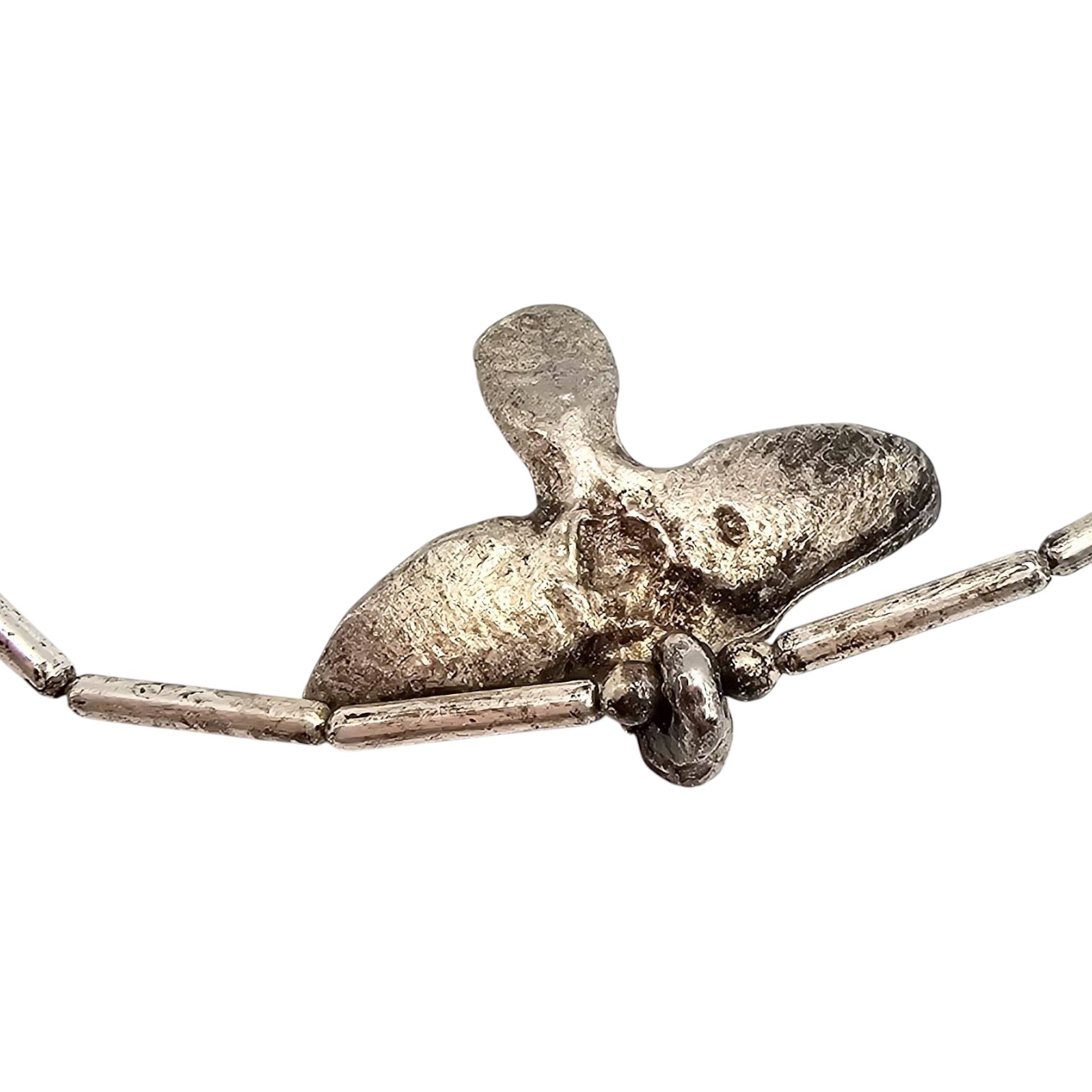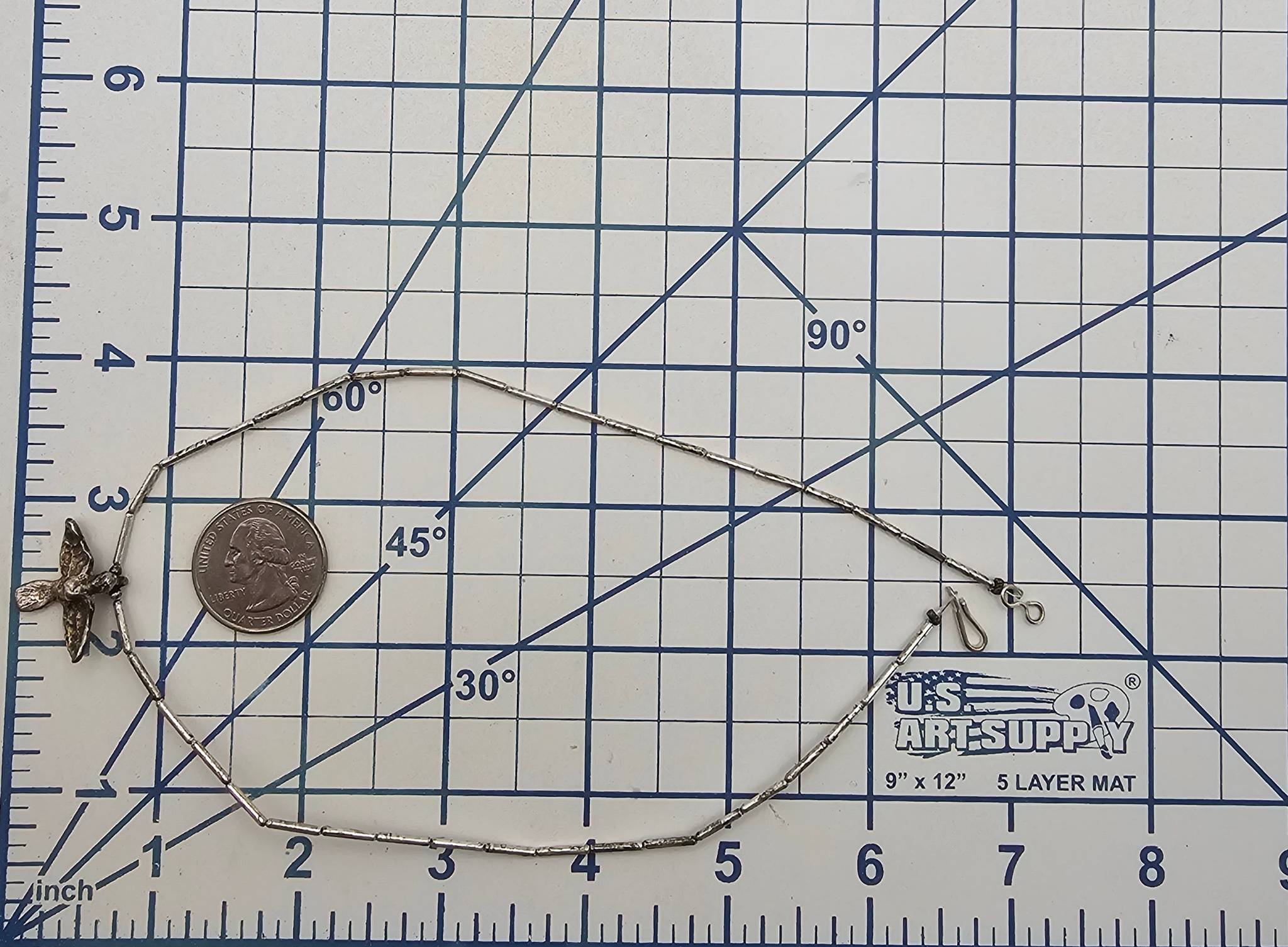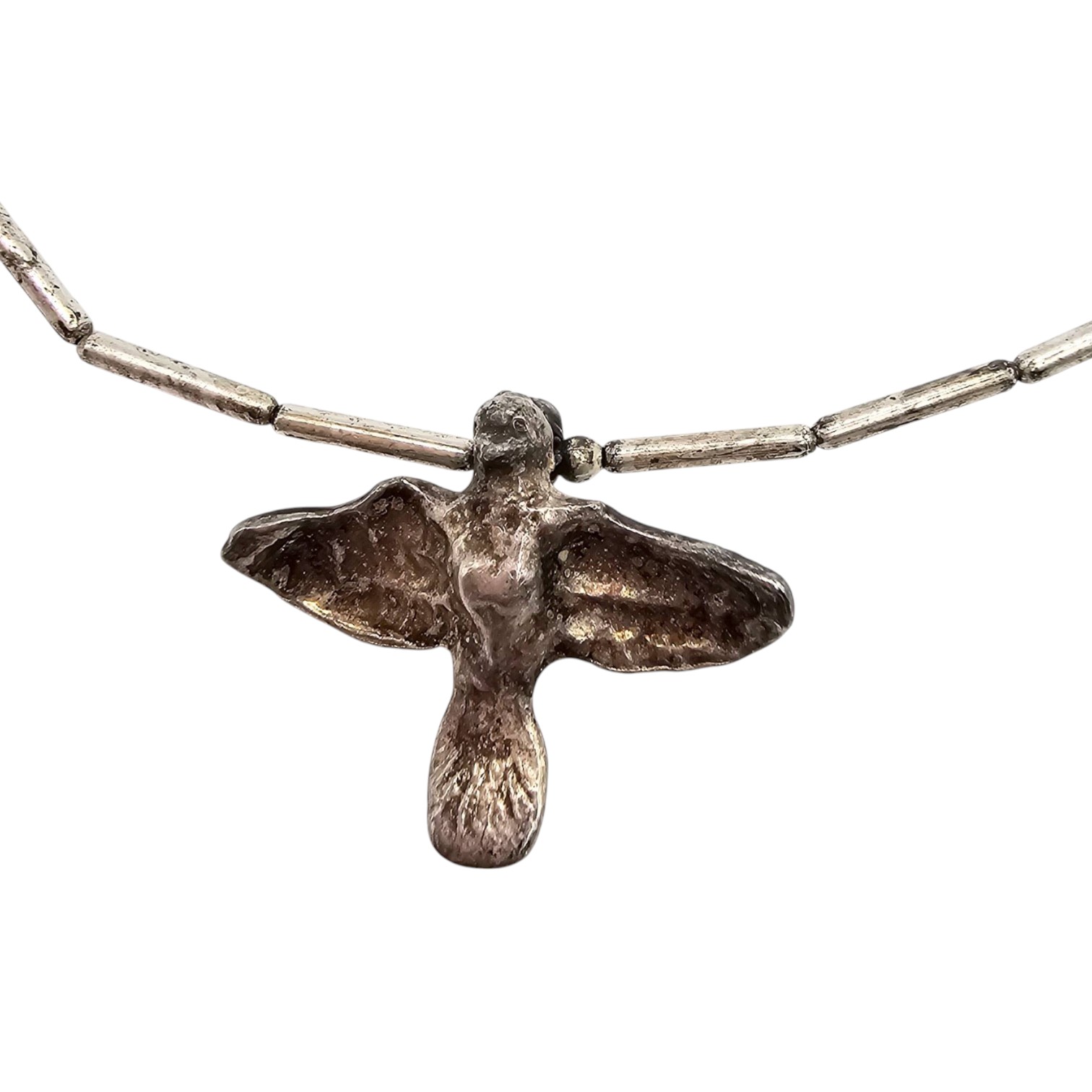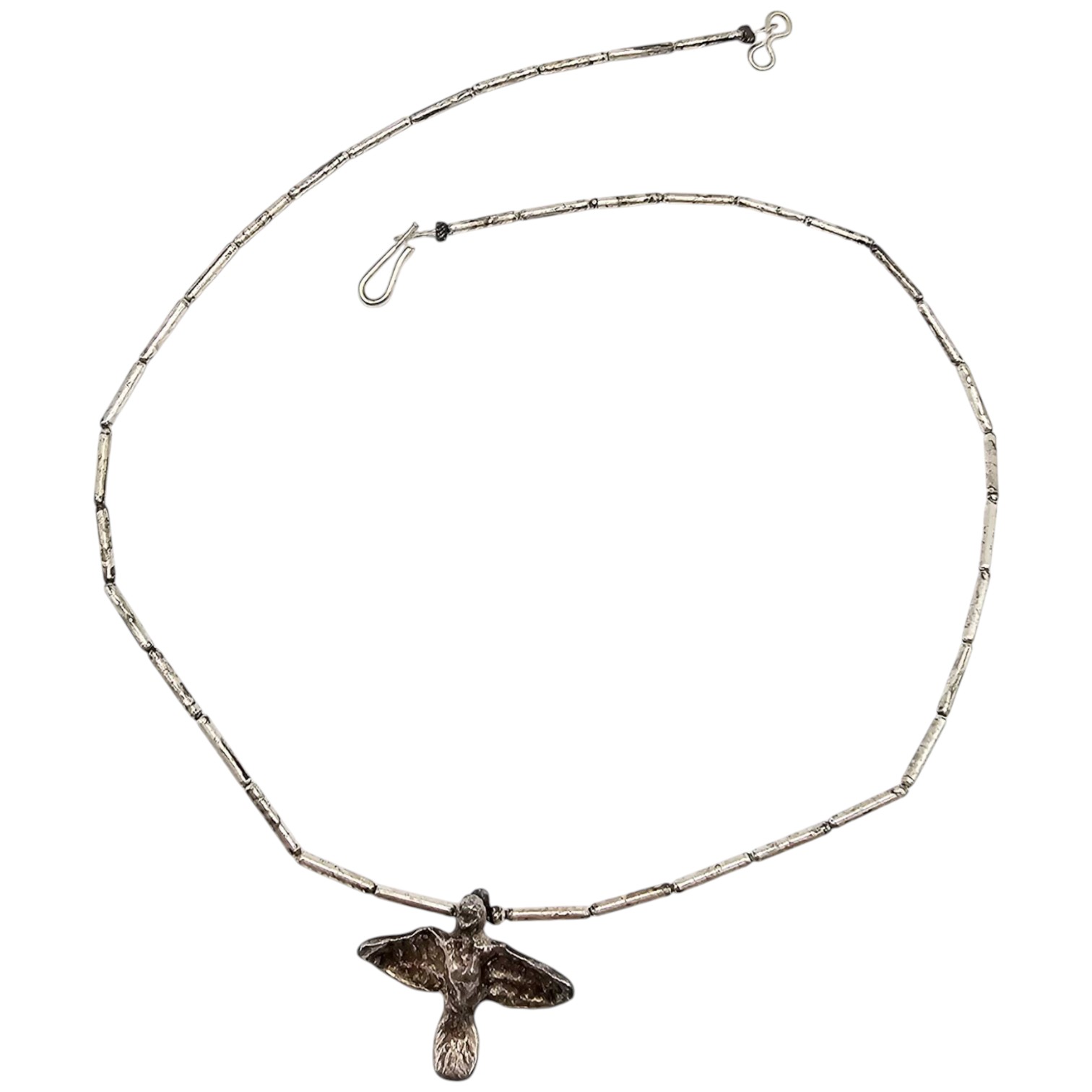 Native-style necklace made from sterling silver, featuring cylindrical liquid silver beads and a bird-shaped pendant. The necklace weighs 7.1g. It is designed with a clasp closure. The approximate length of the necklace is shown in the image. Suitable for collectors or jewelry enthusiasts seeking unique silver pieces.