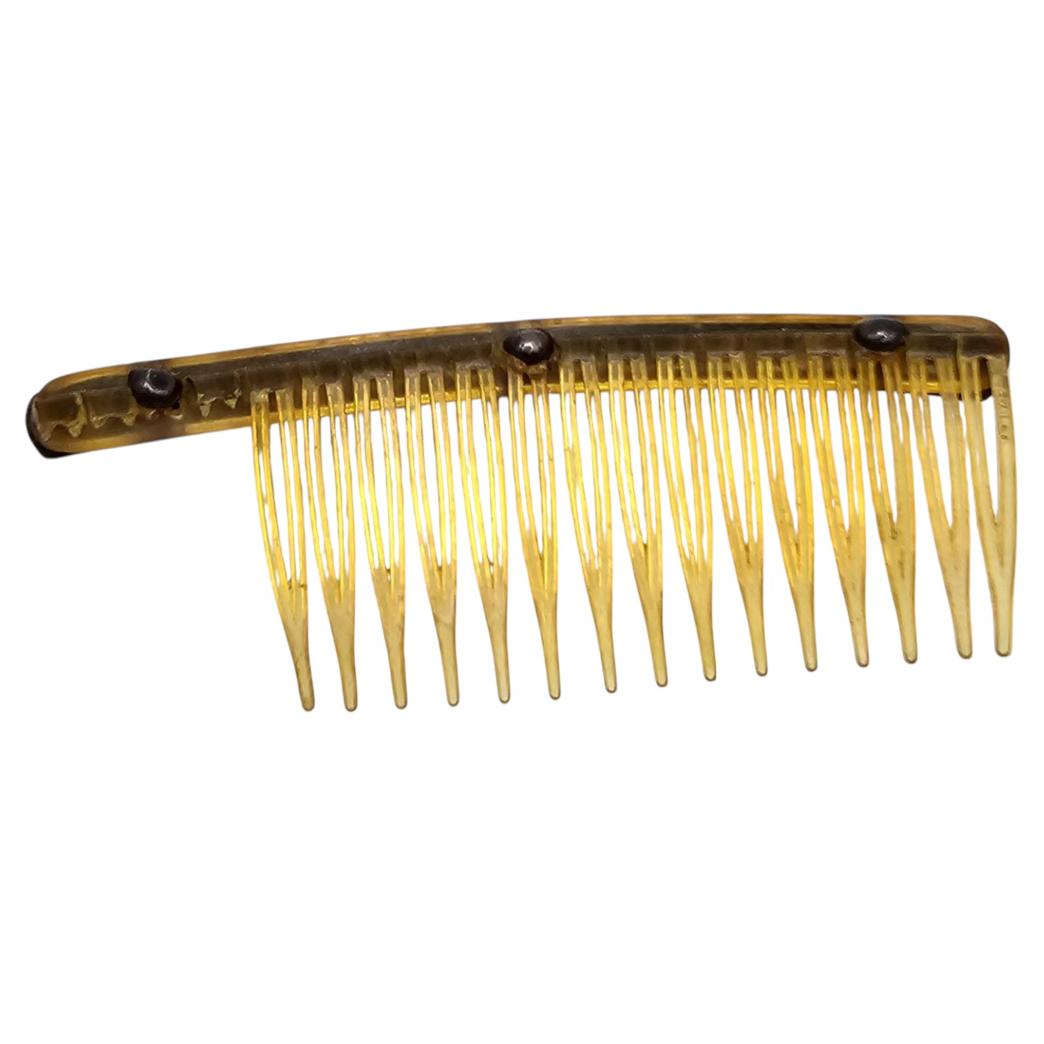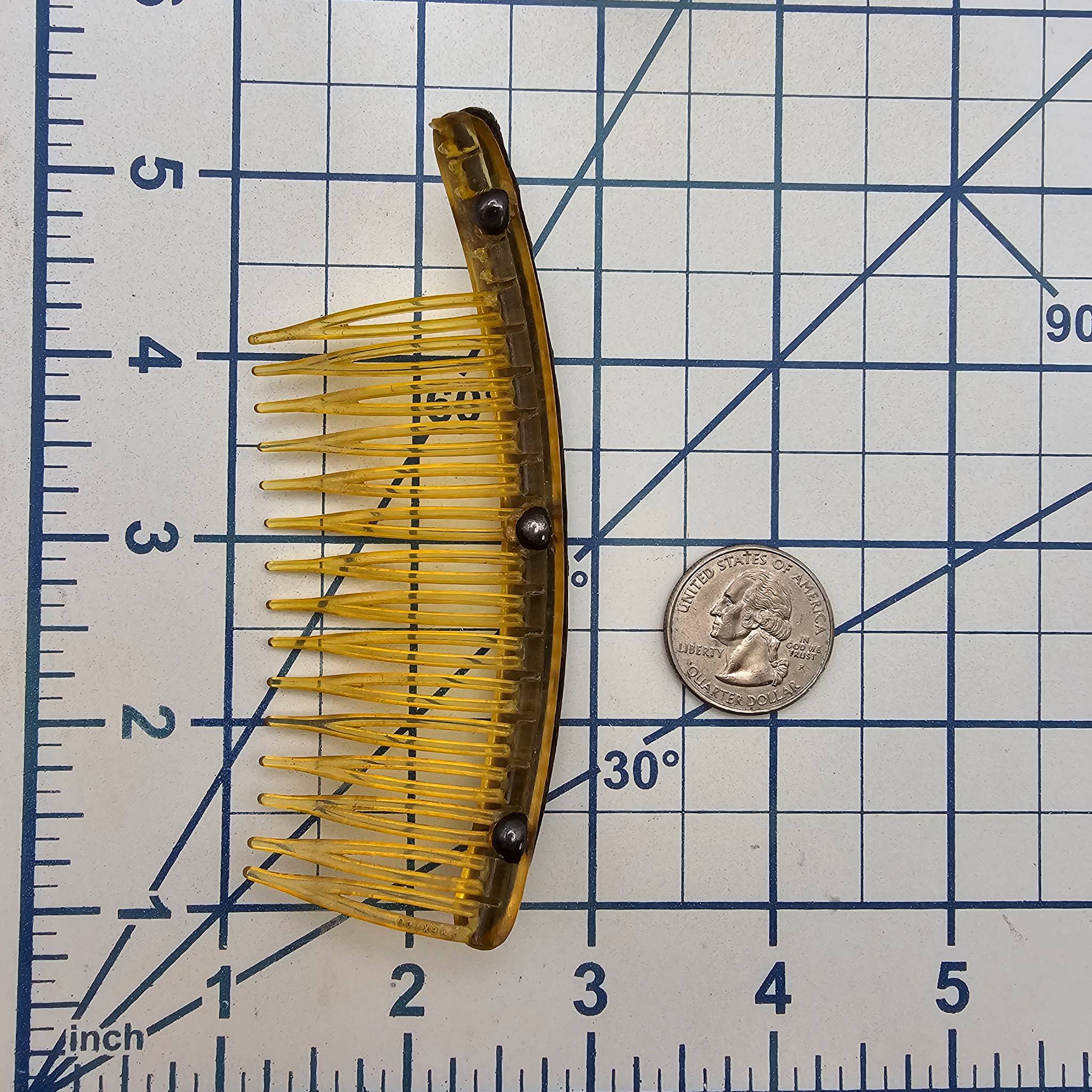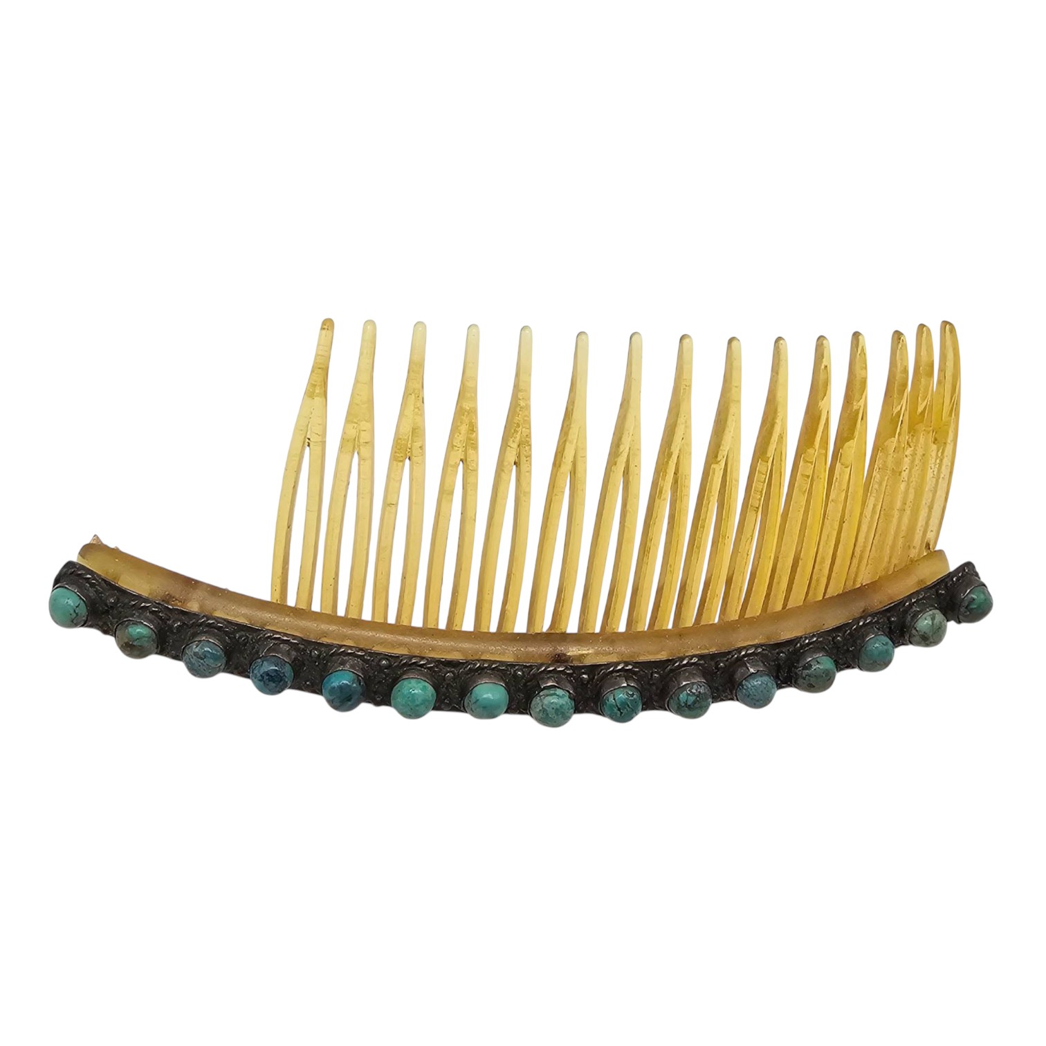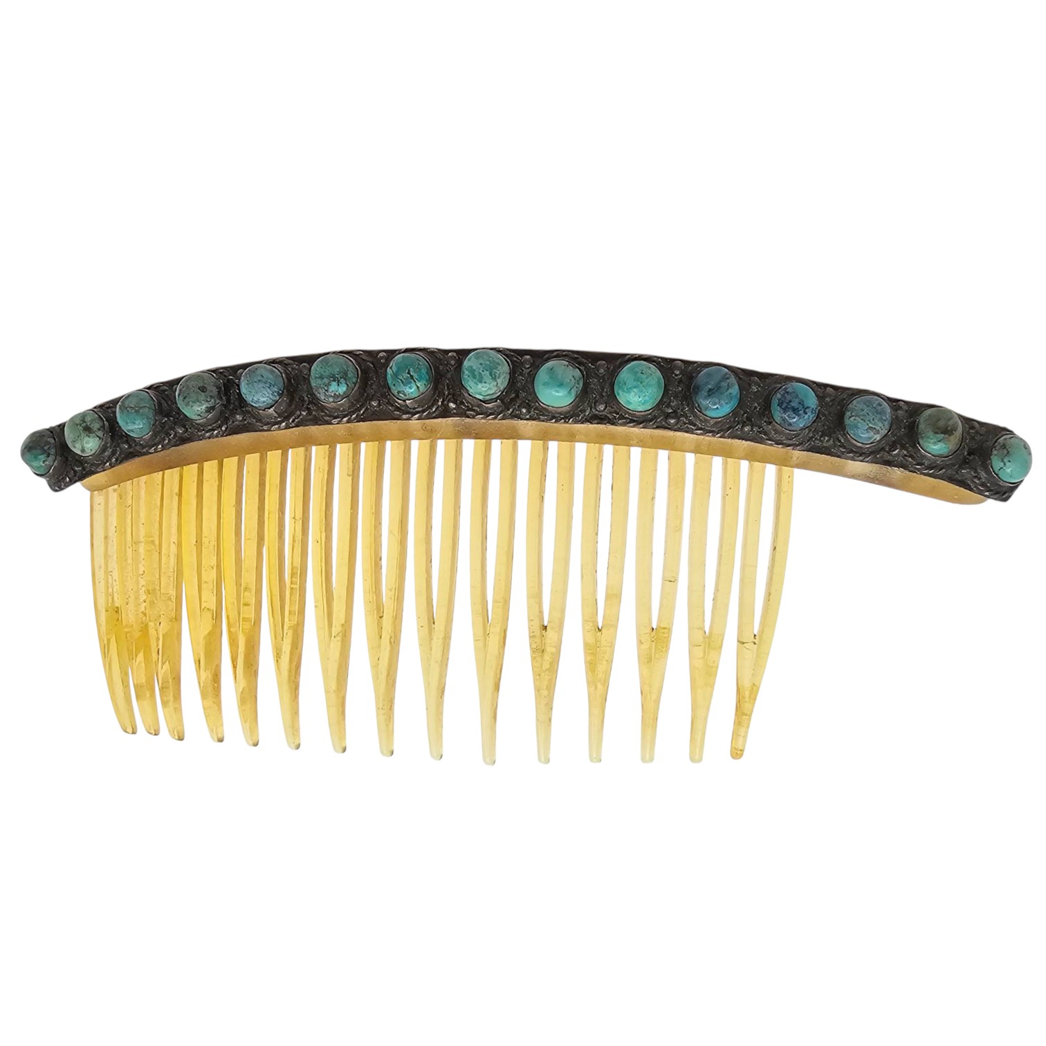 Gold-tone hair comb featuring a curved design and embellished with turquoise stones set in sterling silver along the top. Weighs 14.3g. Comb is missing some teeth is being sold in its current condition. Overall dimensions visible in the image. Ideal as a decorative or collectible piece.