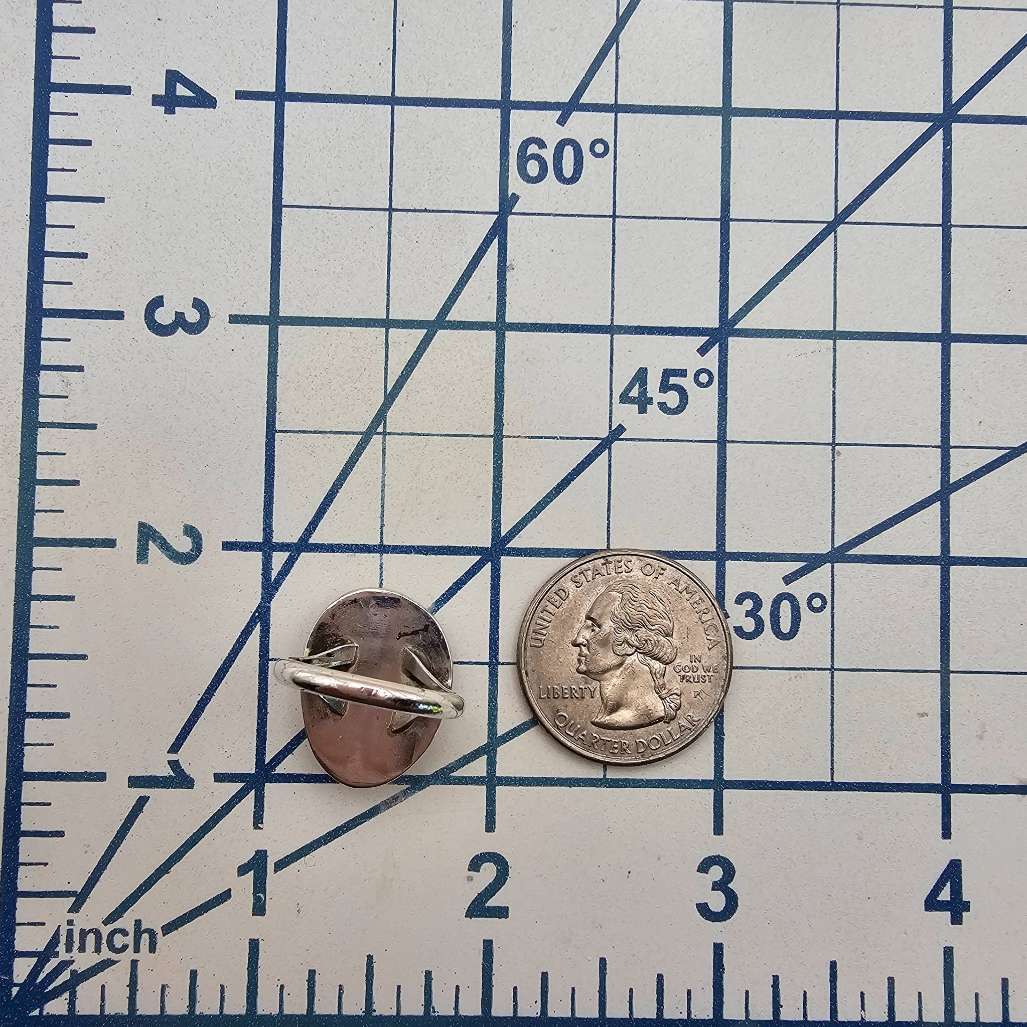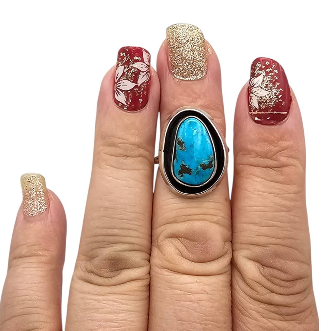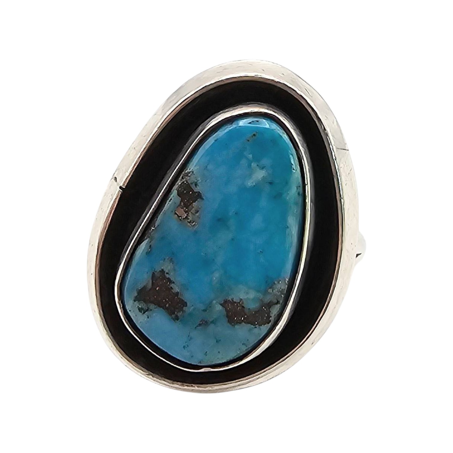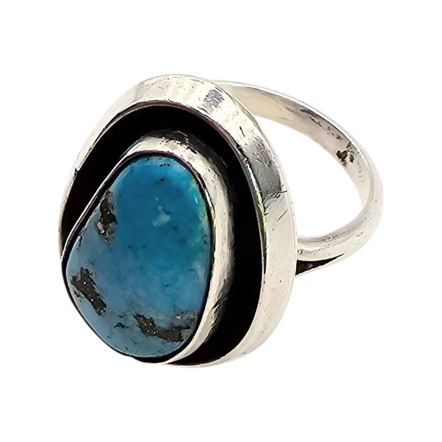 Navajo sterling silver ring featuring a bezel-set turquoise stone with an organic shape and natural matrix detailing. The band is composed of sterling silver, with an overall weight of 5 grams. Ring size is 5.75, with an elegant and timeless design reflecting Navajo craftsmanship.
