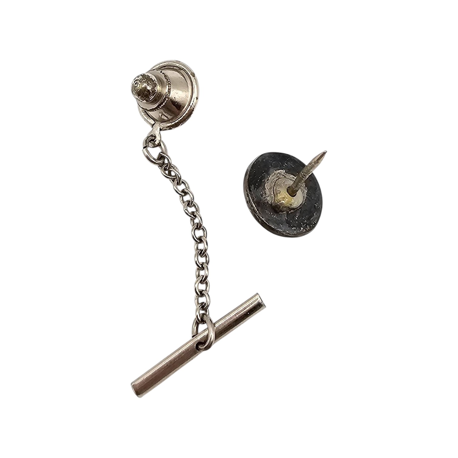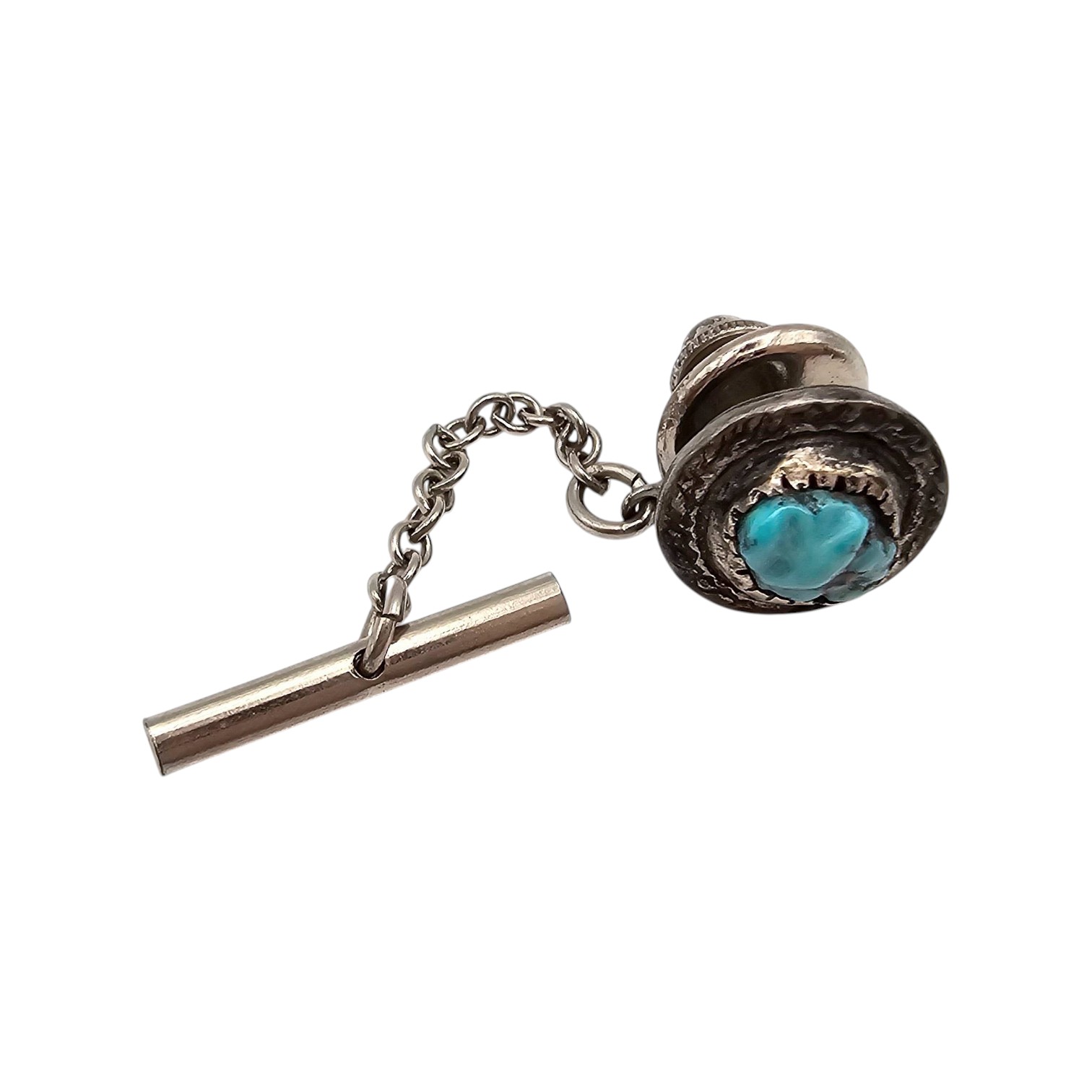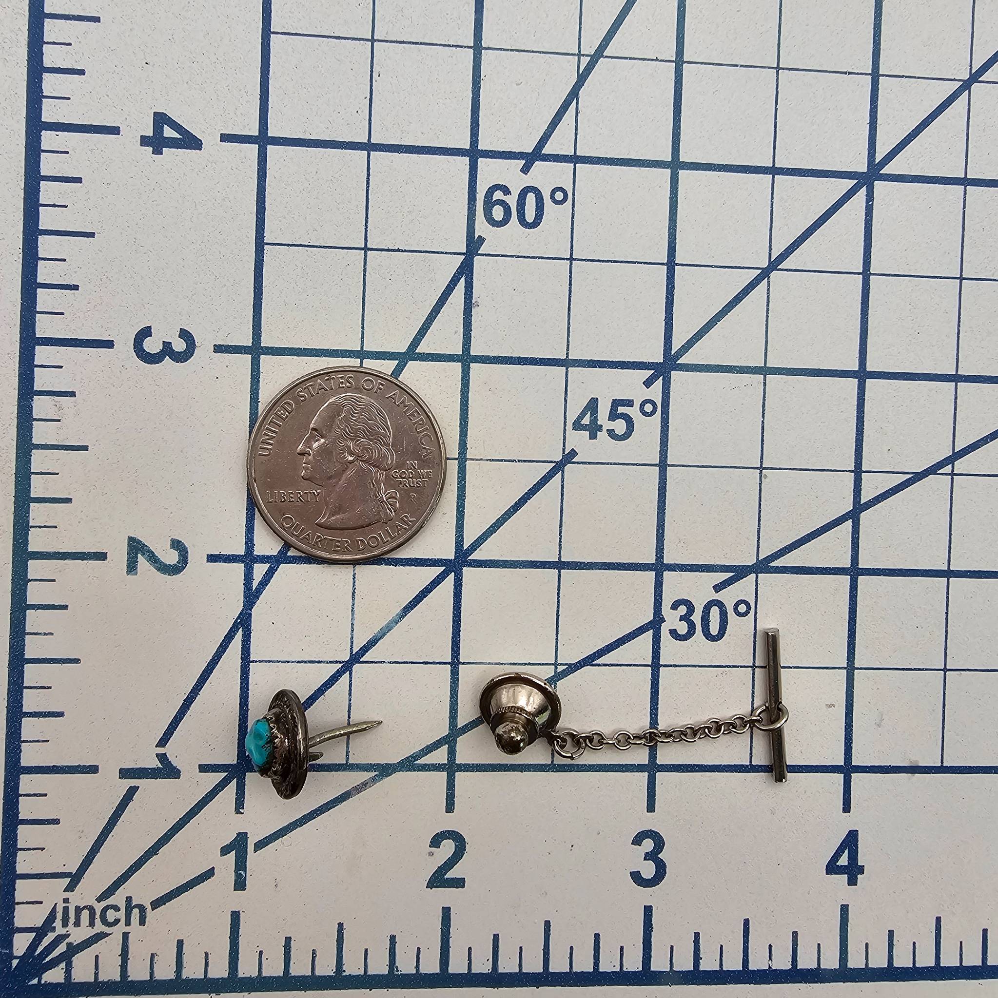 Sterling silver tie tack featuring a Native design with a turquoise stone accent. The piece weighs 3.8 grams and includes a secure chain and bar for fastening. Suitable as a small accessory or collector’s piece.