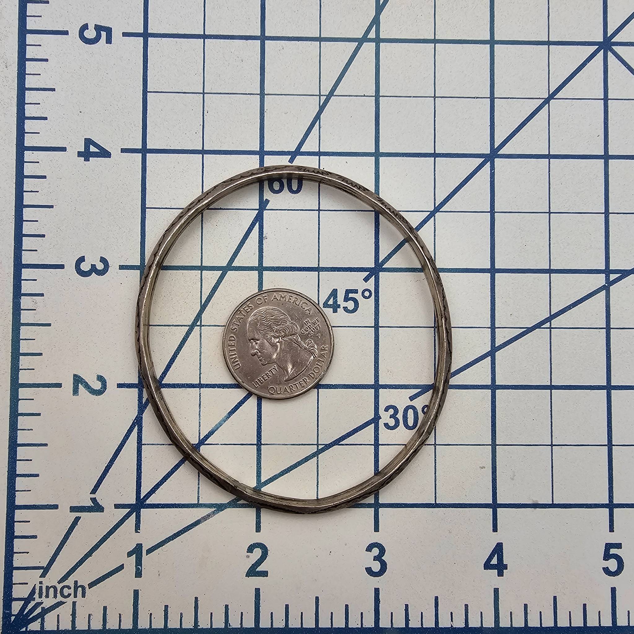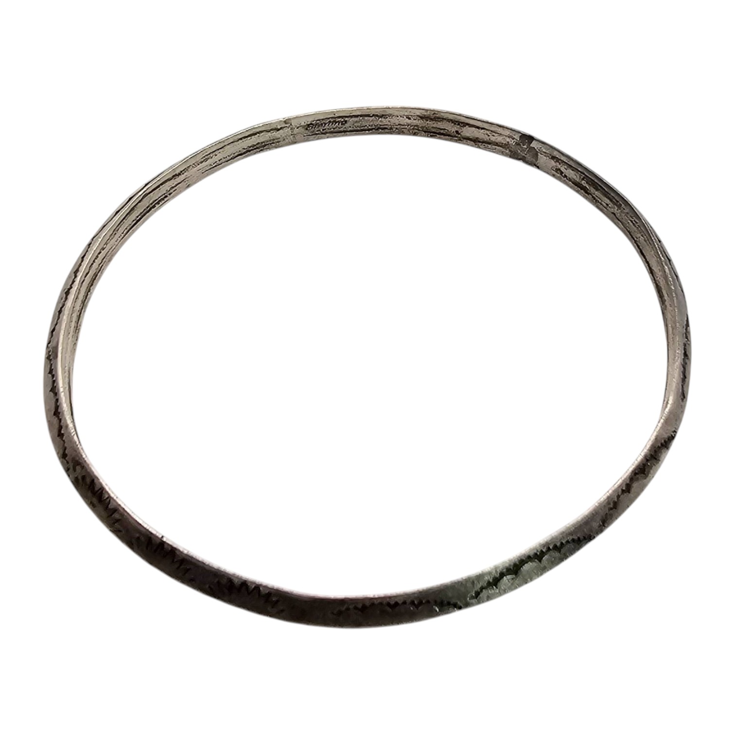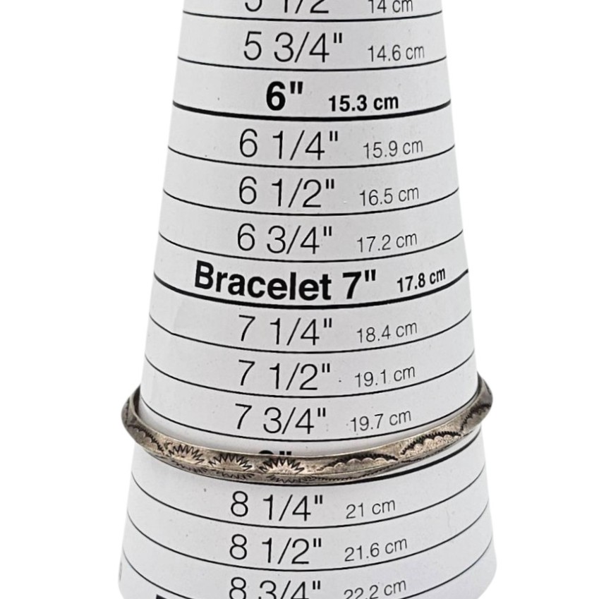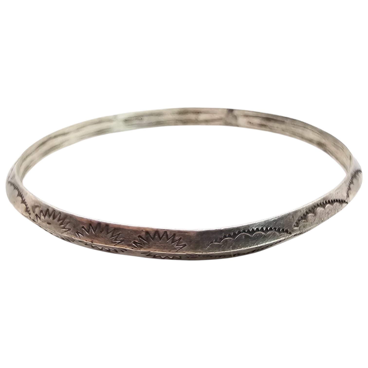 Native design sterling silver bangle bracelet featuring detailed stamp.Weighs approximately 16.2 grams. Suitable for a size range fitting 7 inches as shown on a bracelet sizing cone. Intricate handmade craftsmanship evident in the engraving.