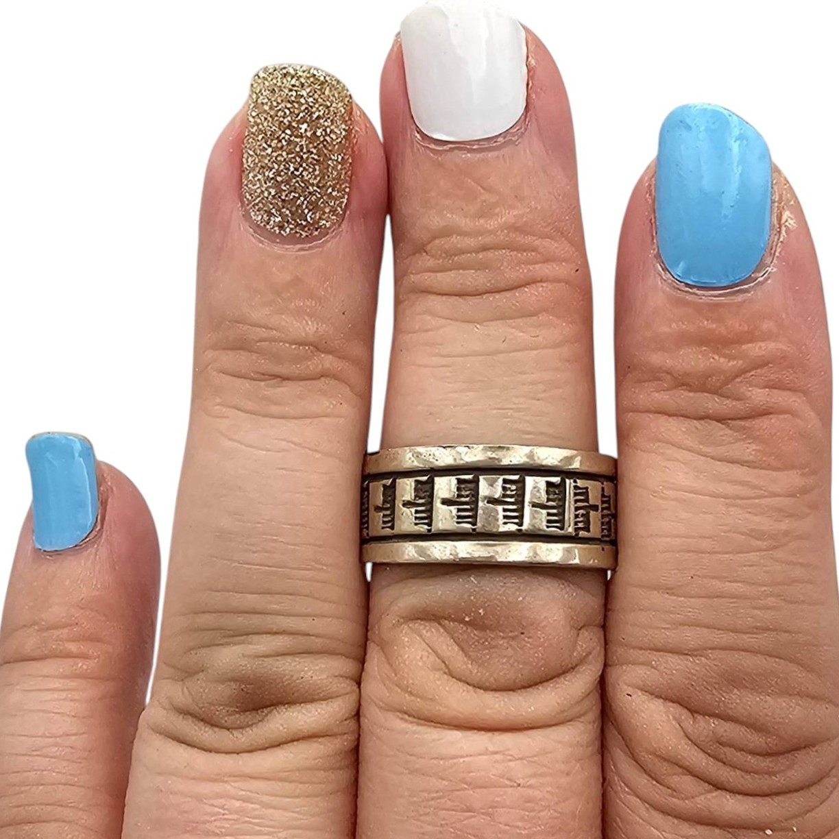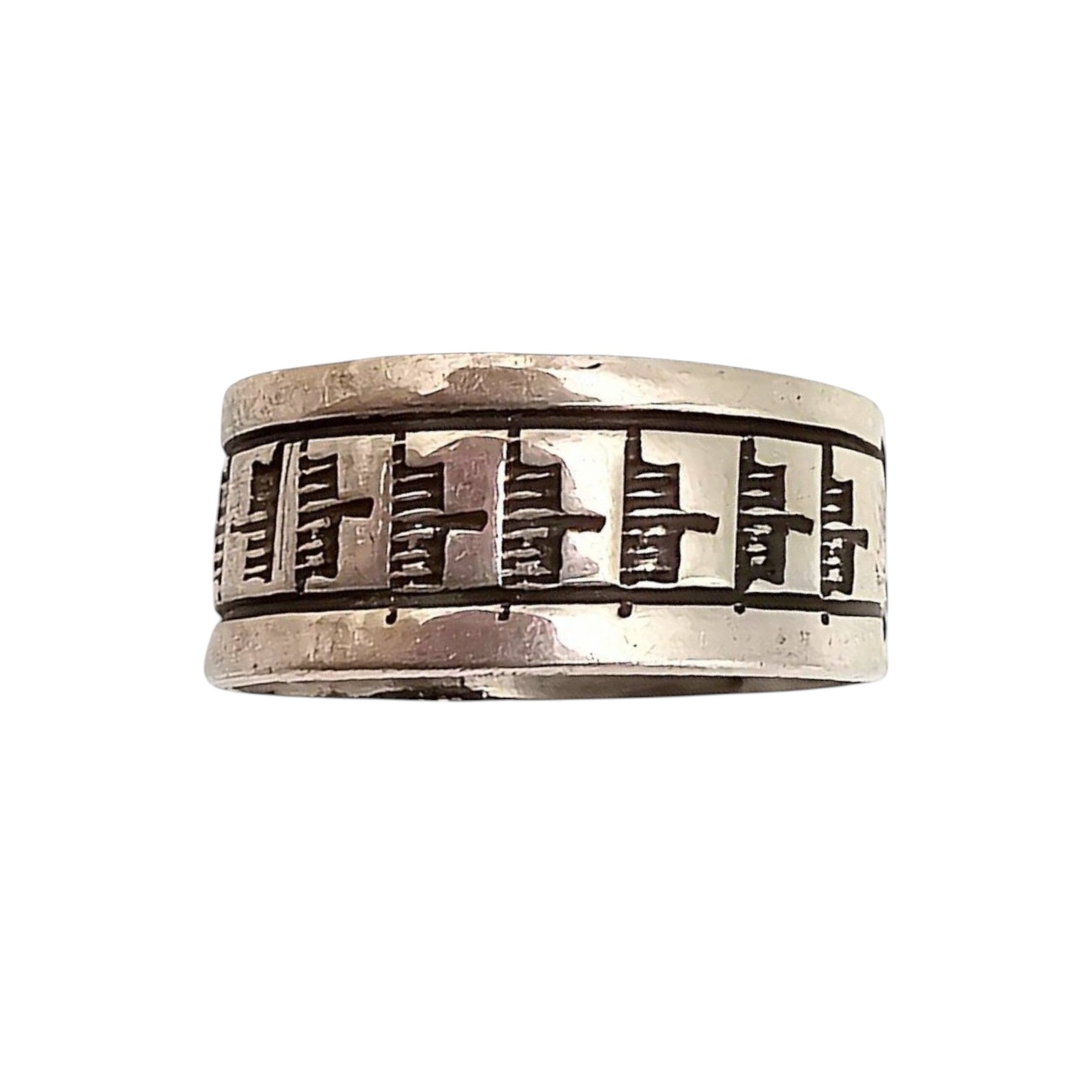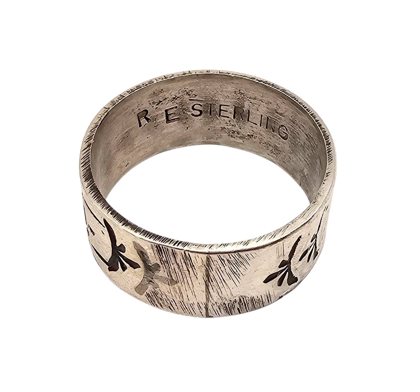 Sterling silver ring handcrafted by Navajo artisan Rick Enriquez. Featuring an intricate design, the ring weighs 5.2 grams and is stamped with ‘R. Sterling.’ Sized at 9, the craftsmanship reflects traditional Navajo artistry. Ideal for collectors of Native American jewelry or sterling silver pieces.