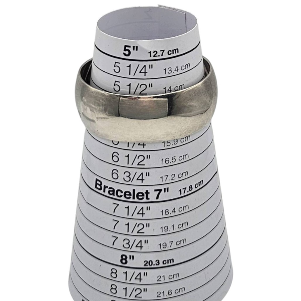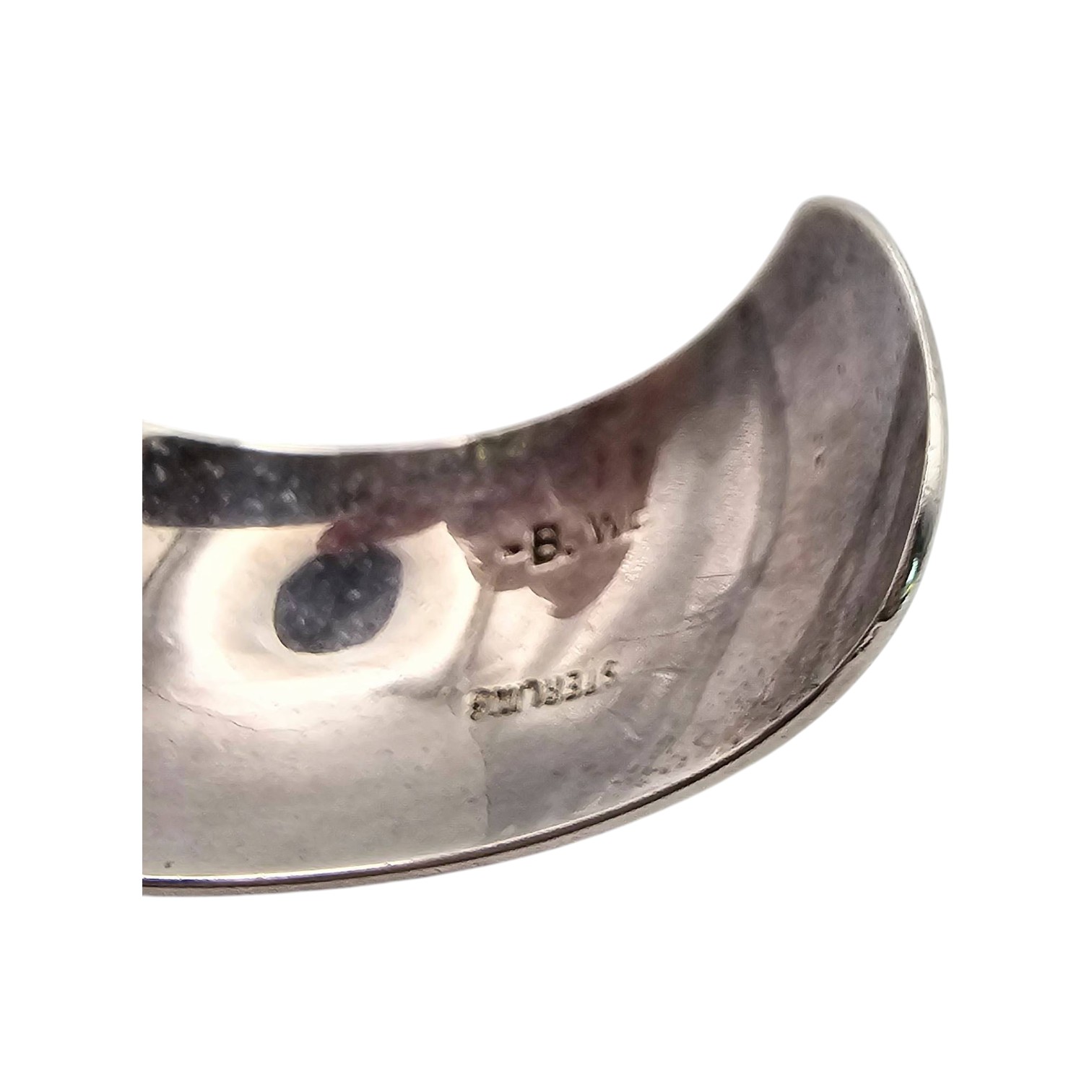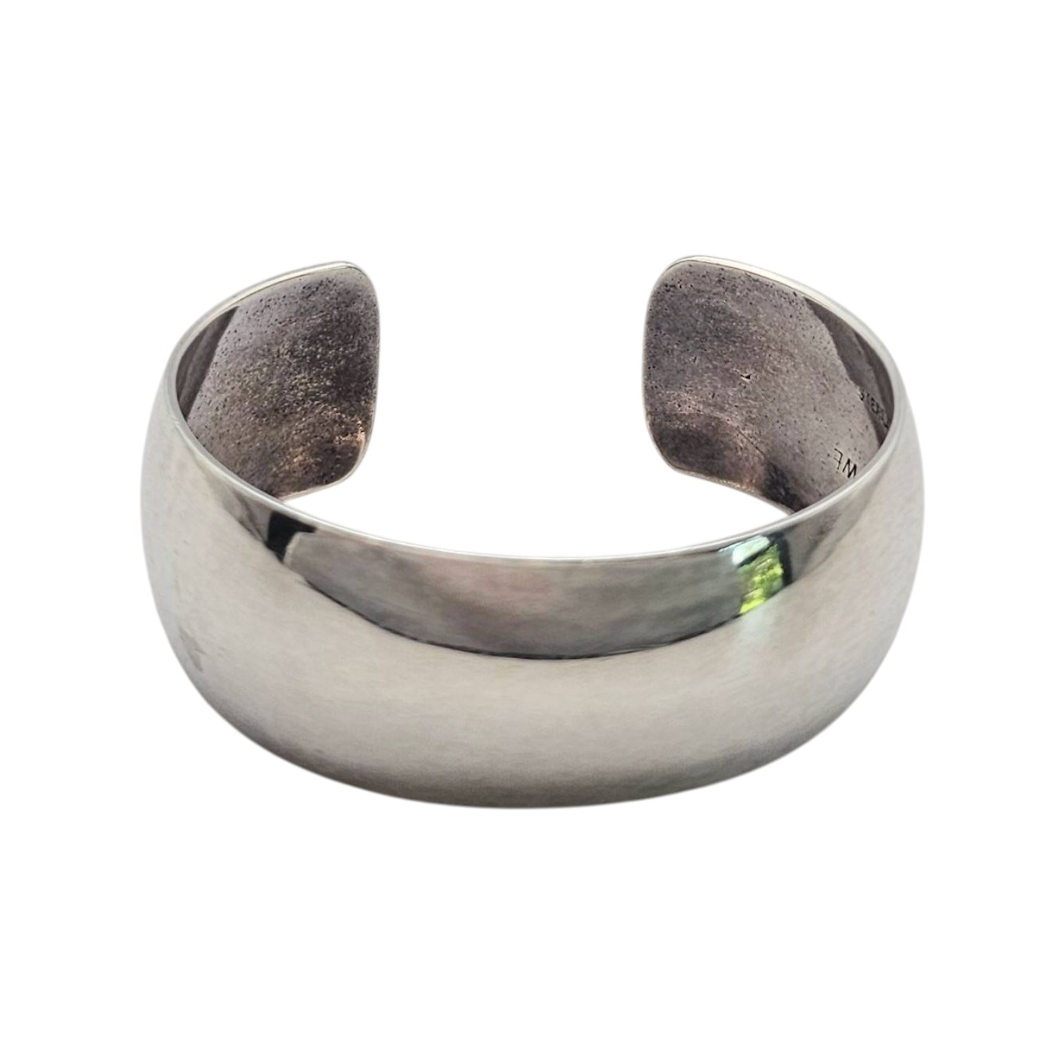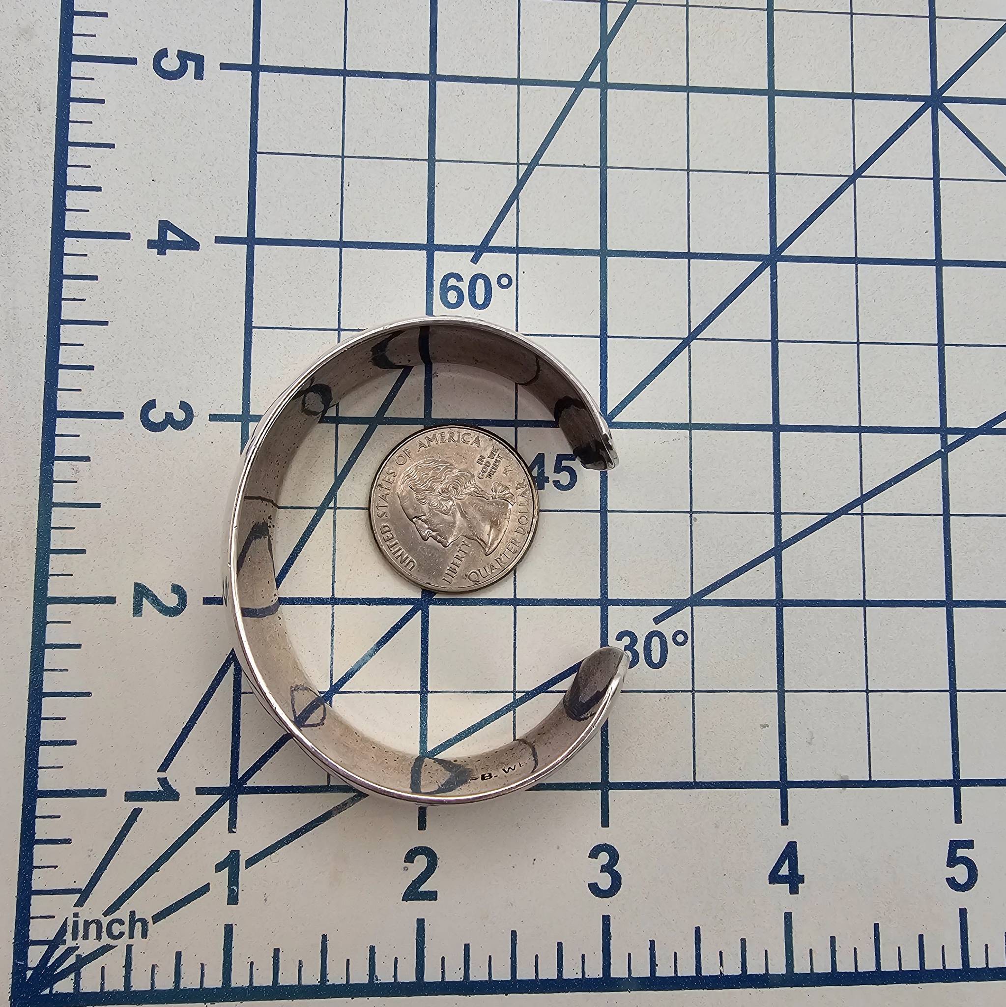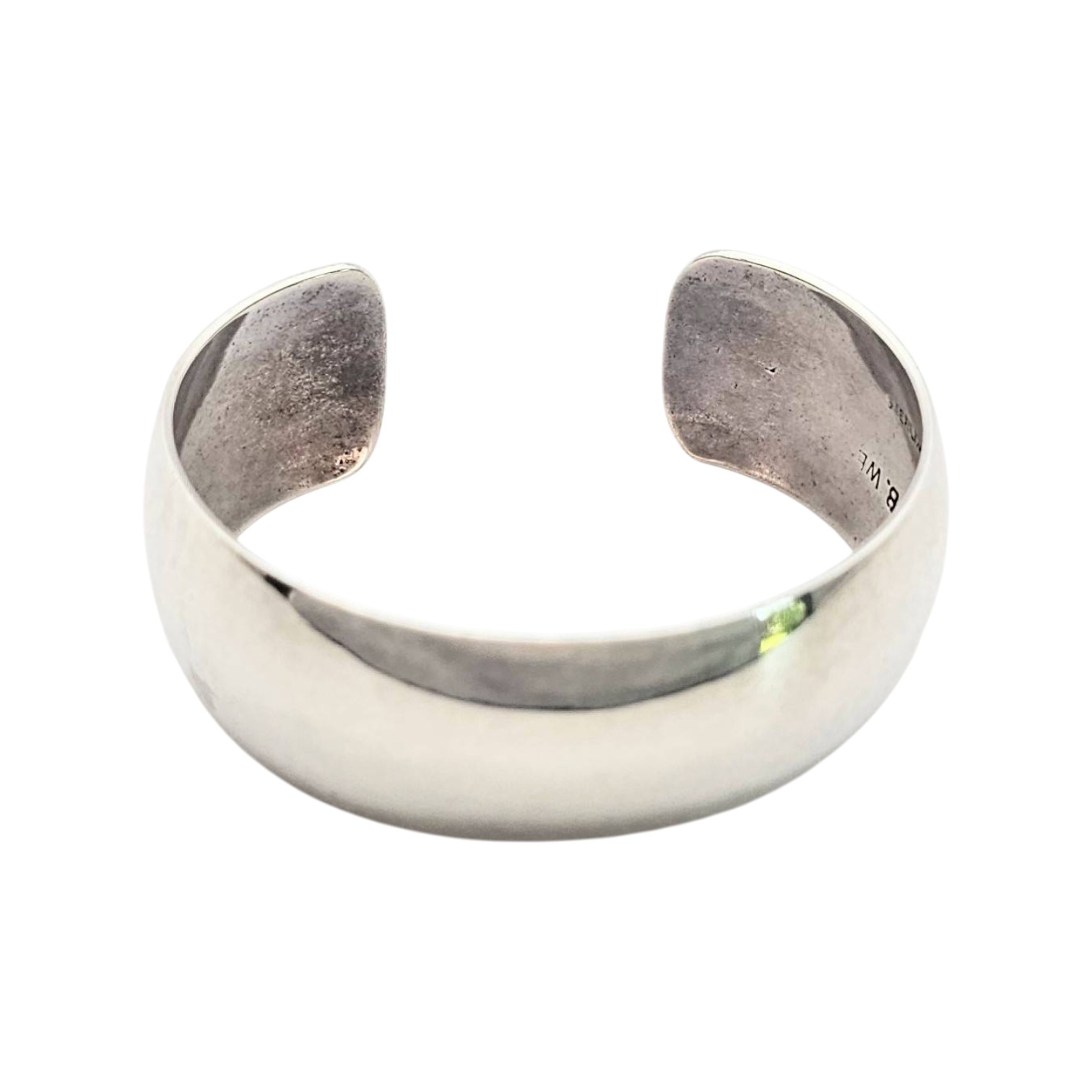 Sterling silver cuff bracelet, signed ‘B.WE’ on the interior. Made of sterling silver with a total weight of 34 grams. The bracelet is polished and open-ended, making it adjustable. It fits sizes up to approximately 7 inches in circumference and has a smooth, reflective surface.