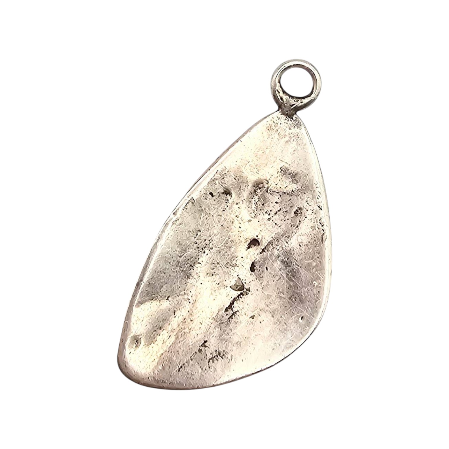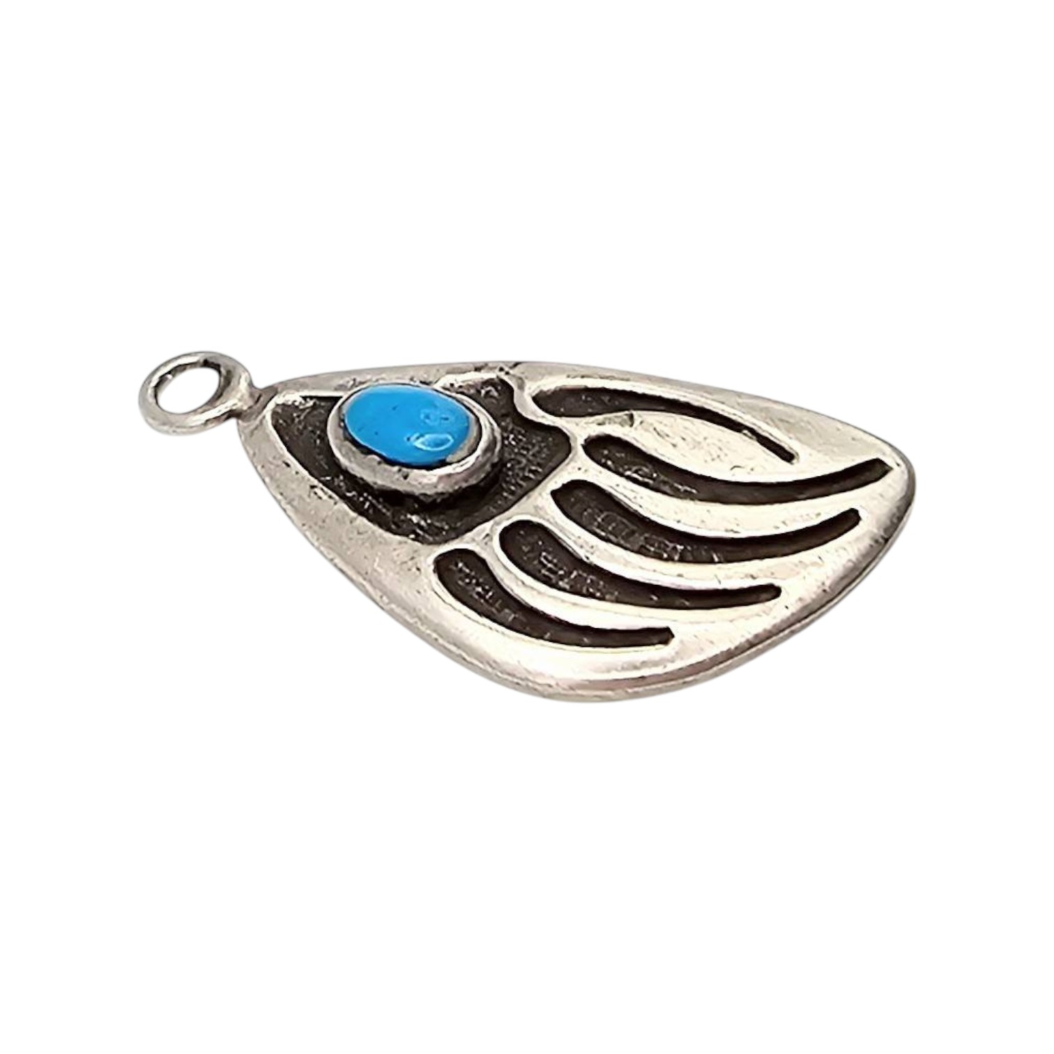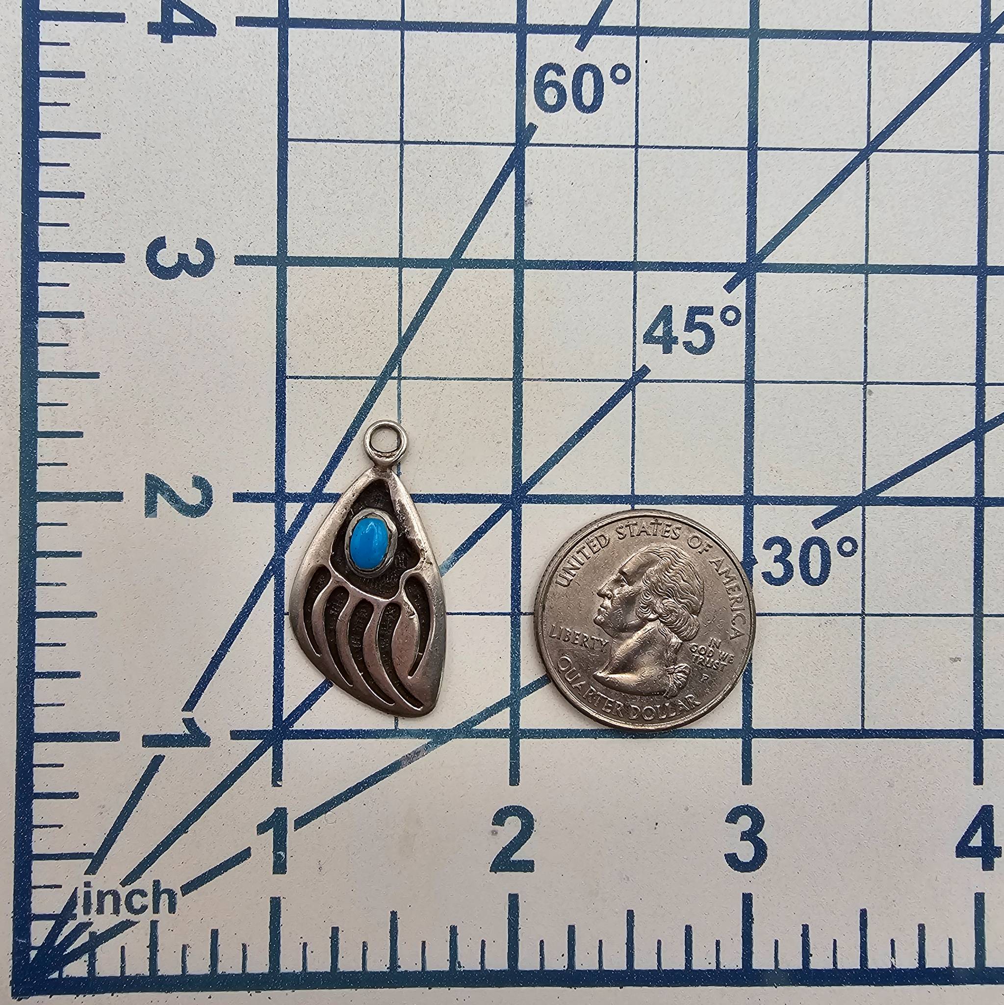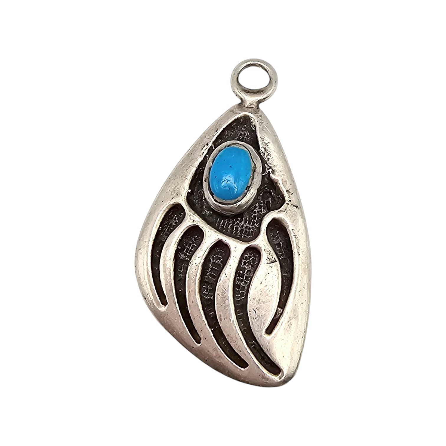 Sterling silver bear paw pendant featuring a turquoise inlay. Handcrafted in traditional Navajo style, this piece weighs 3.4 grams and measures approximately 1.5 inches in length, including the loop. Features a single turquoise cabochon and a cut-out bear paw design.