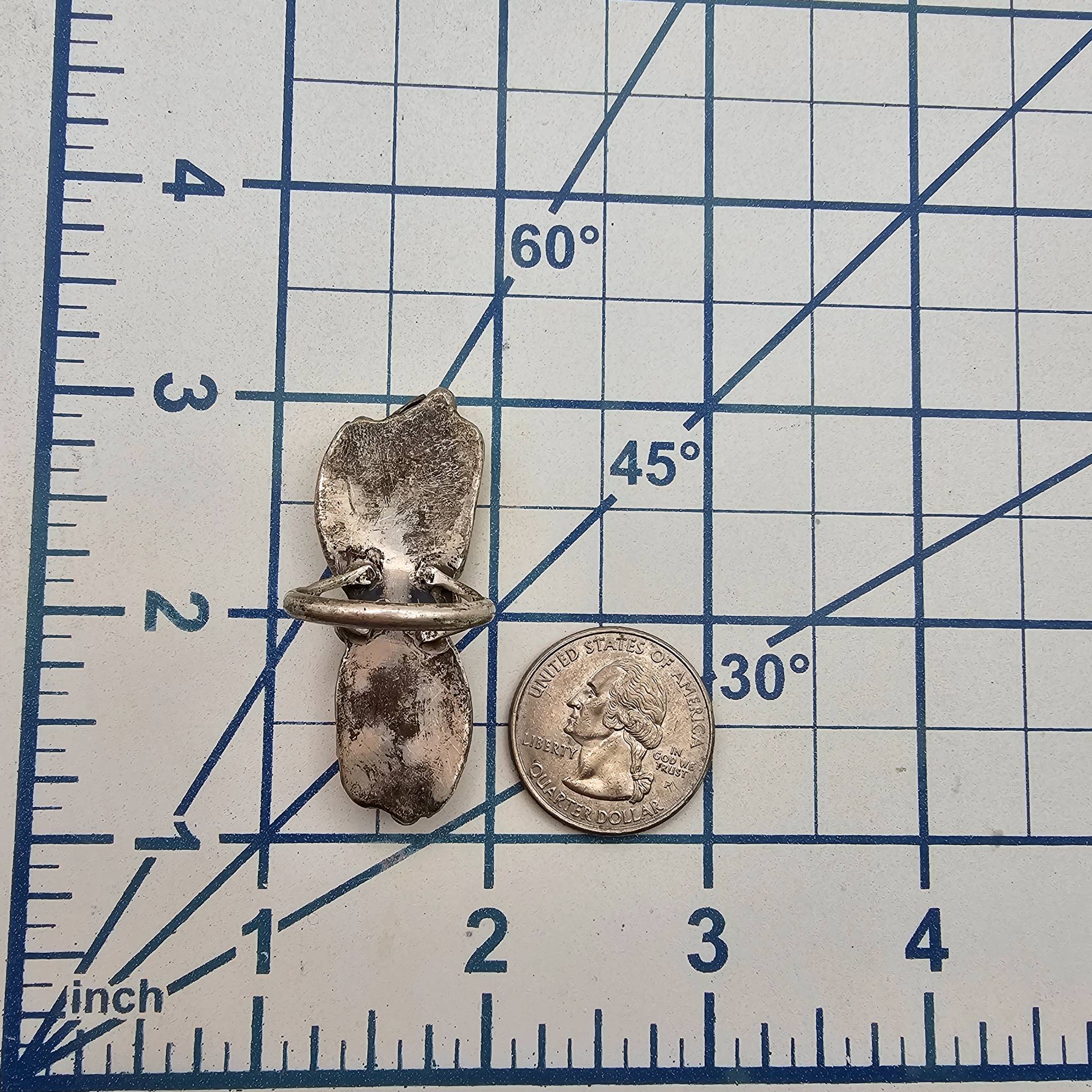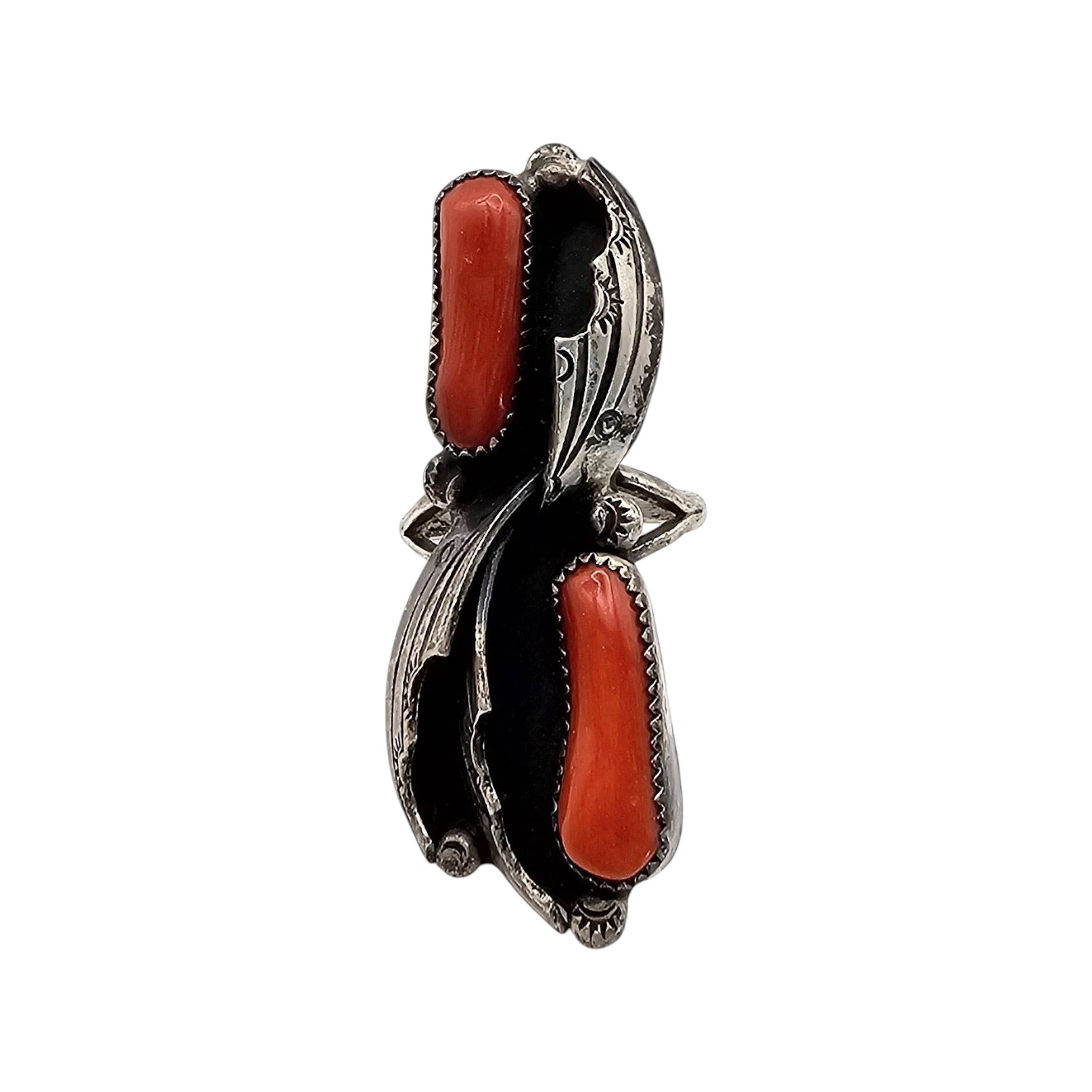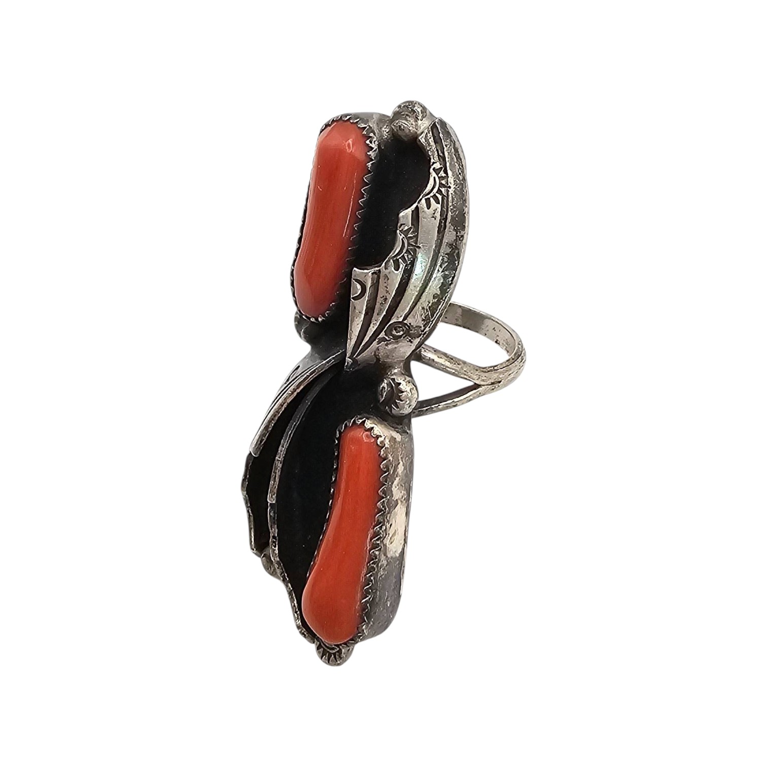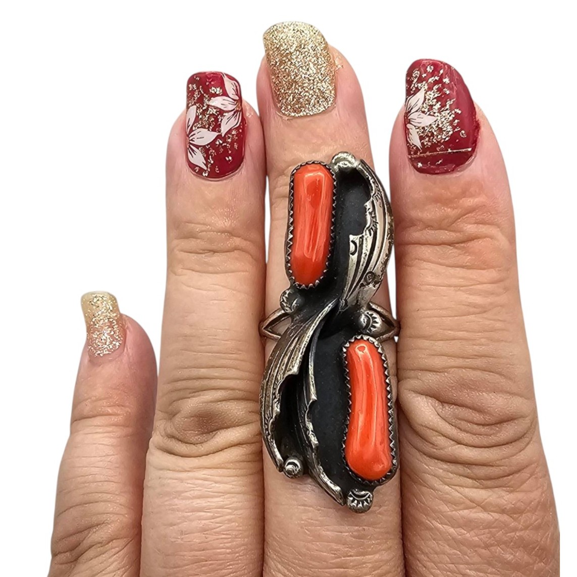 Navajo handcrafted sterling silver ring featuring two bezel-set coral stones in an artistic design. The ring is a size 7 and weighs 10.8 grams. The piece showcases traditional Navajo craftsmanship with intricate silverwork surrounding the vibrant red coral stones. Measures approximately 2 inches in height.