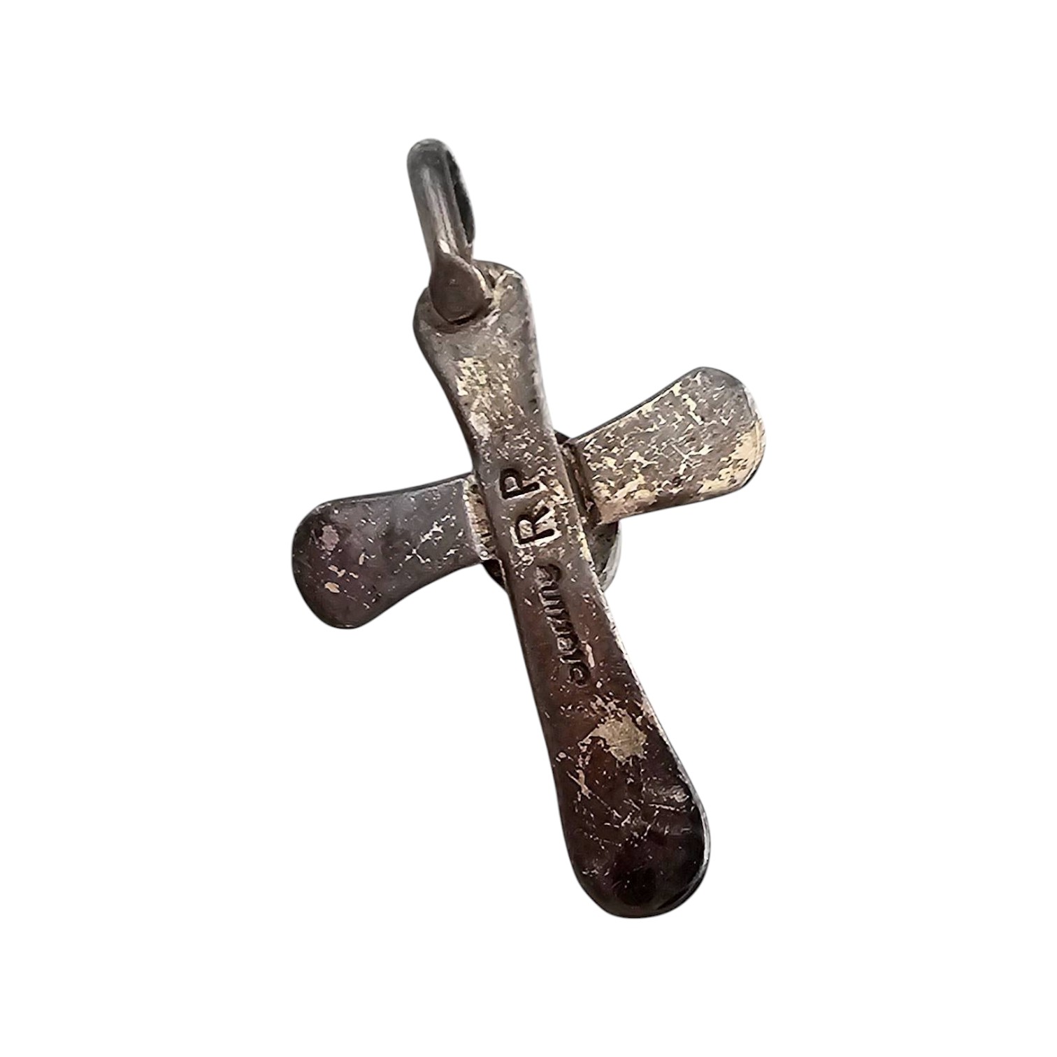Sterling silver cross pendant handcrafted by Richard L. Reeve, featuring a turquoise inlay at the center. The piece is marked as sterling and weighs 3.8 grams. It has a bail for attachment to a chain. Condition exhibits tarnishing, consistent with sterling silver and age. Measures approximately 1.5 inches tall (excluding bail) and proportionate in width.
