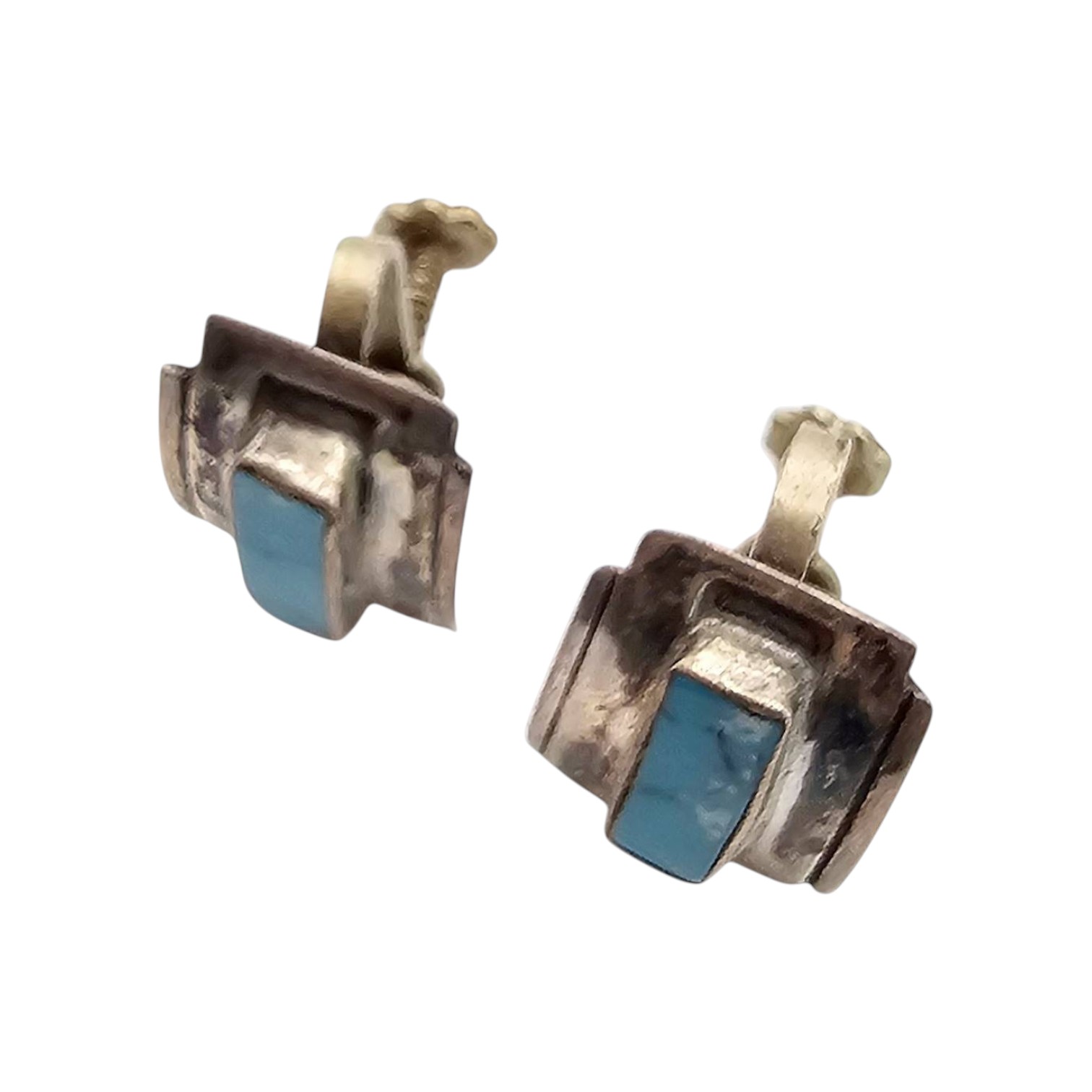 Alpaca silver screw-back earrings featuring rectangular turquoise stone inlays. The earrings weigh 3.8 grams and are designed with a screw-back mechanism. Alpaca silver is a durable metal alloy often used in jewelry. The turquoise inlays exhibit characteristic veining. Approximate size shown against a measurement grid.