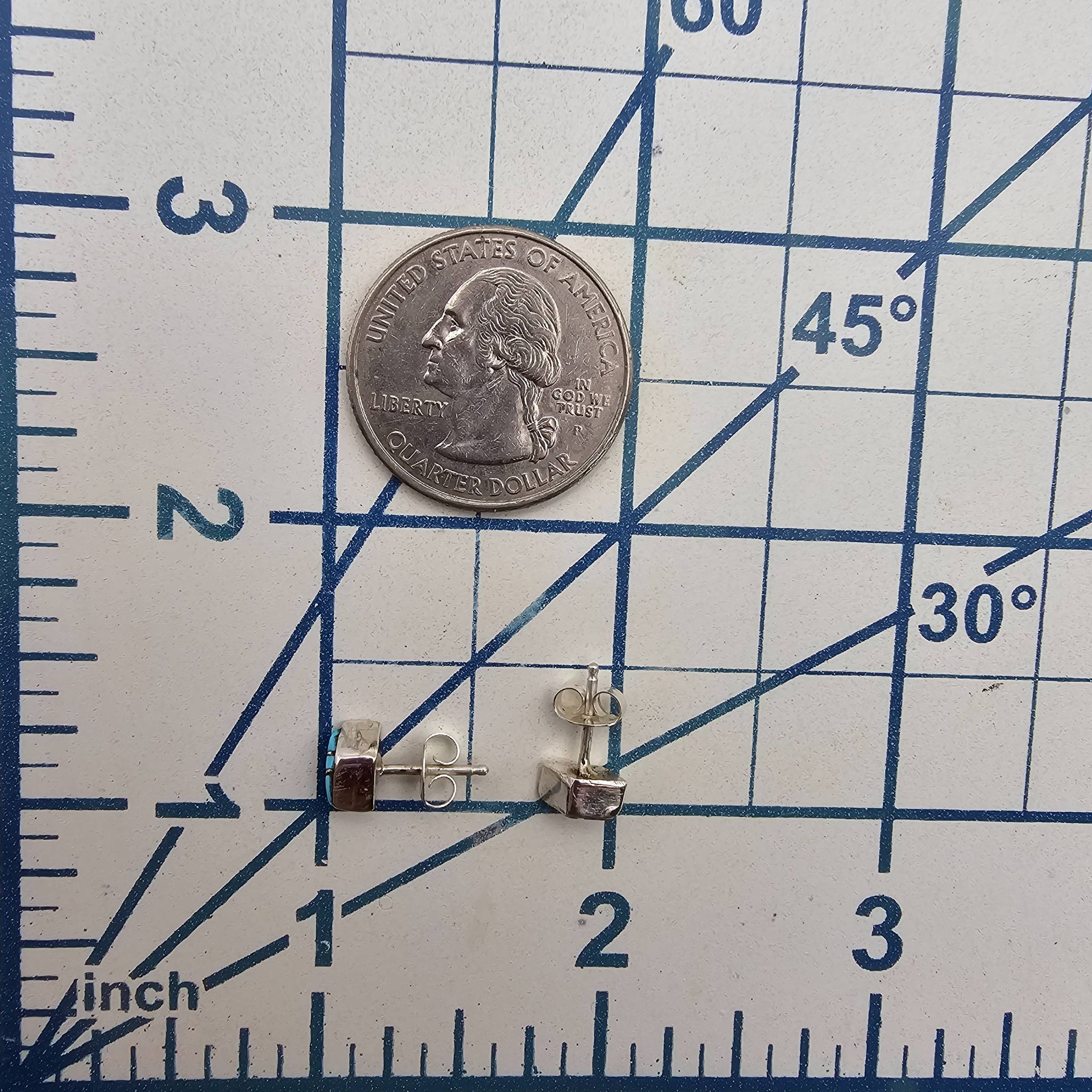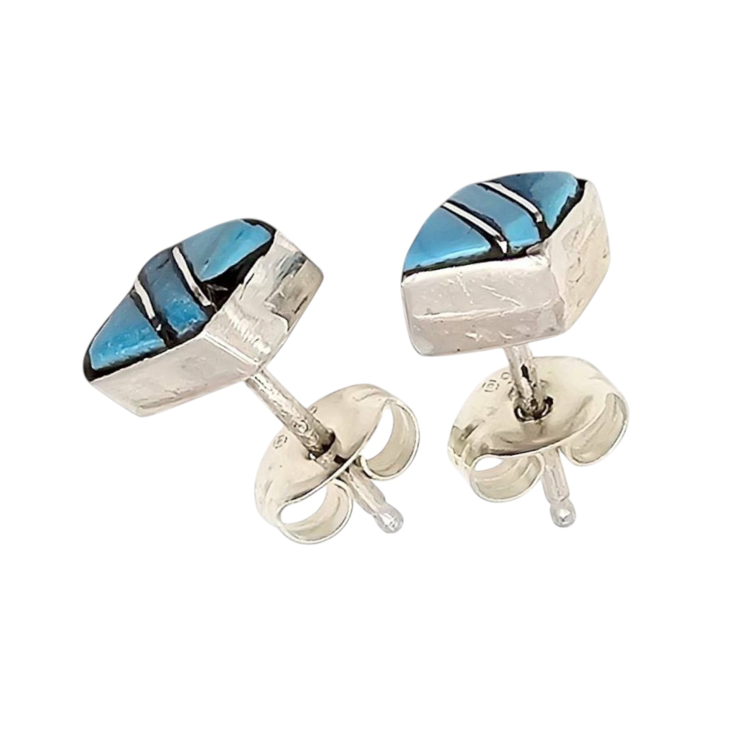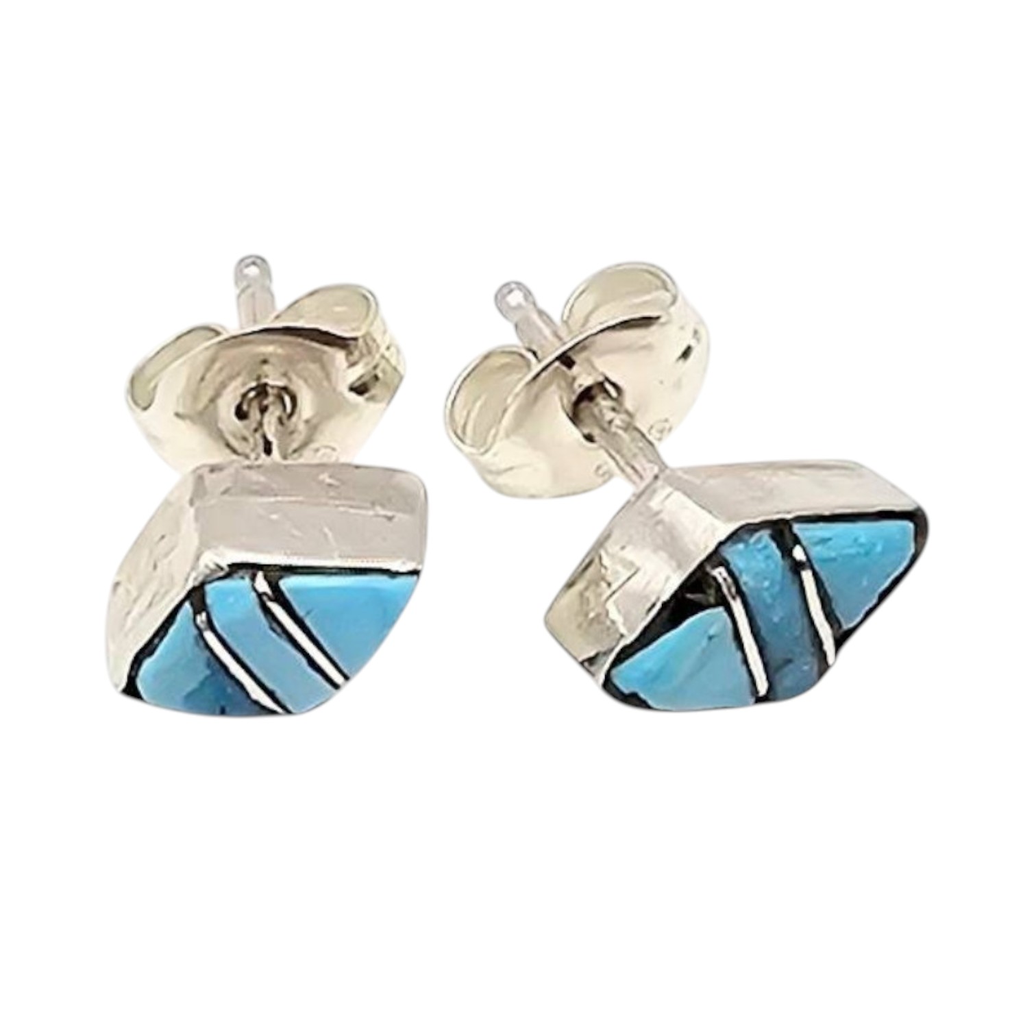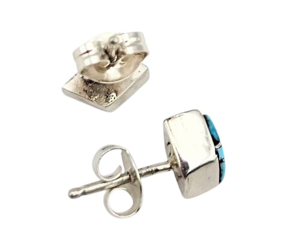Zuni stud earrings handcrafted by Monica Johnson. Made of sterling silver with turquoise stone inlay. Marked as sterling and weighing 0.8 grams. Compact design, as per comparison with a US quarter. Includes butterfly clasps for secure wear.