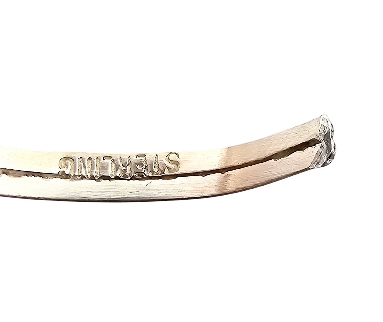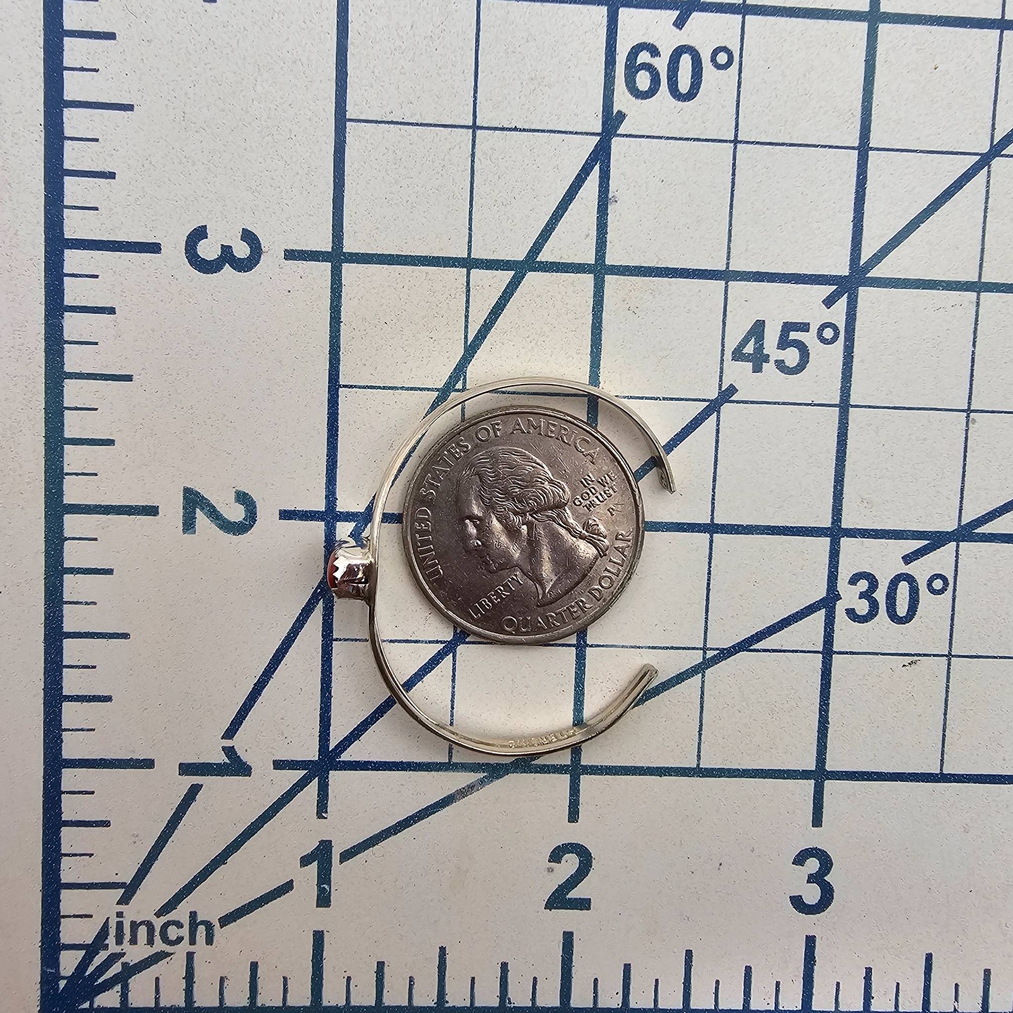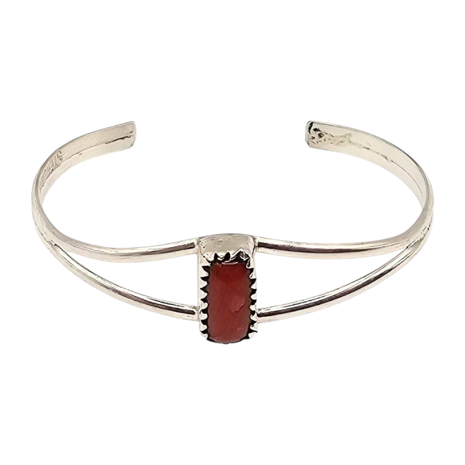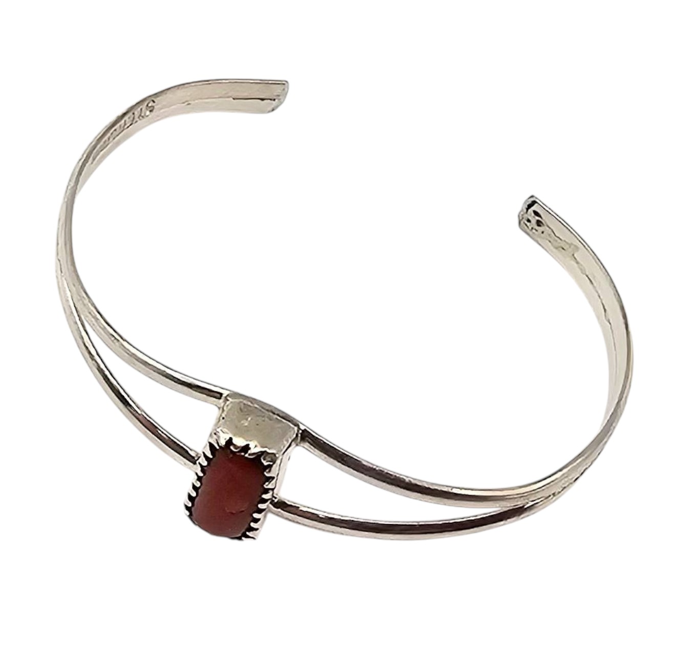 Handmade sterling silver baby bracelet by Navajo artisan Esther White, featuring a red coral centerpiece. The bracelet is stamped ‘STERLING’ and weighs approximately 2.4 grams. It measures roughly 2 inches in diameter, designed to fit infants. Delicately crafted with a split-band design and an elegant coral stone setting.