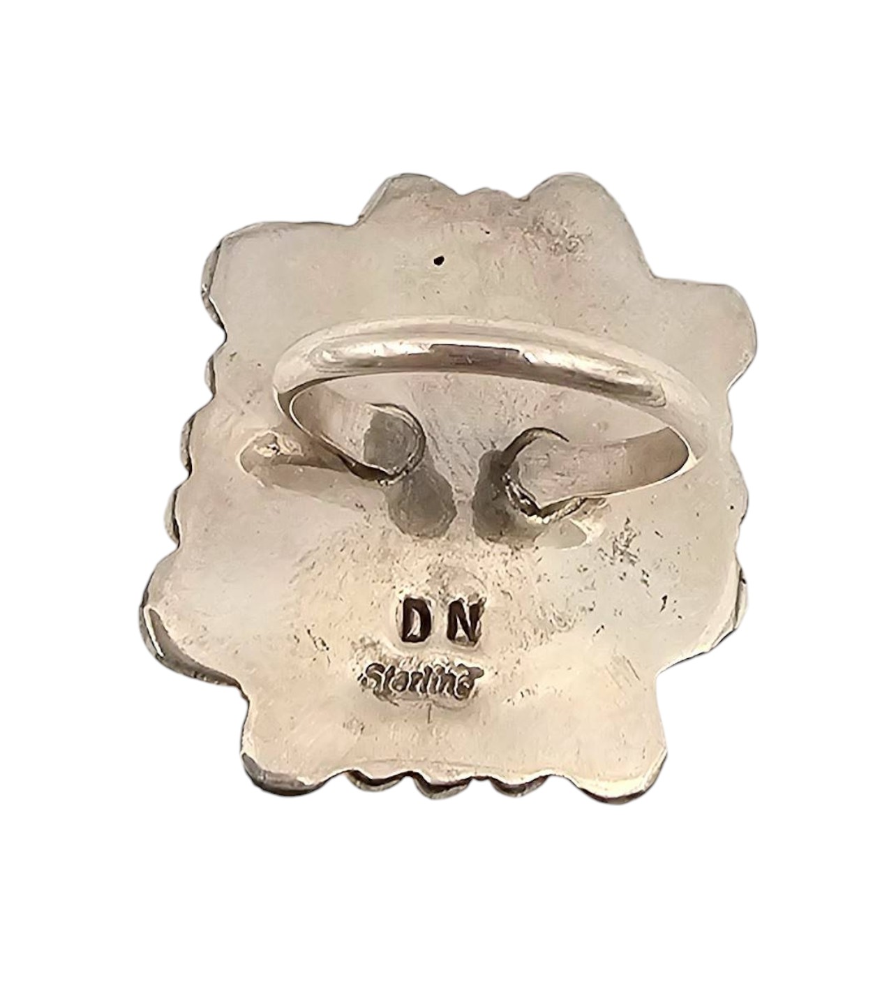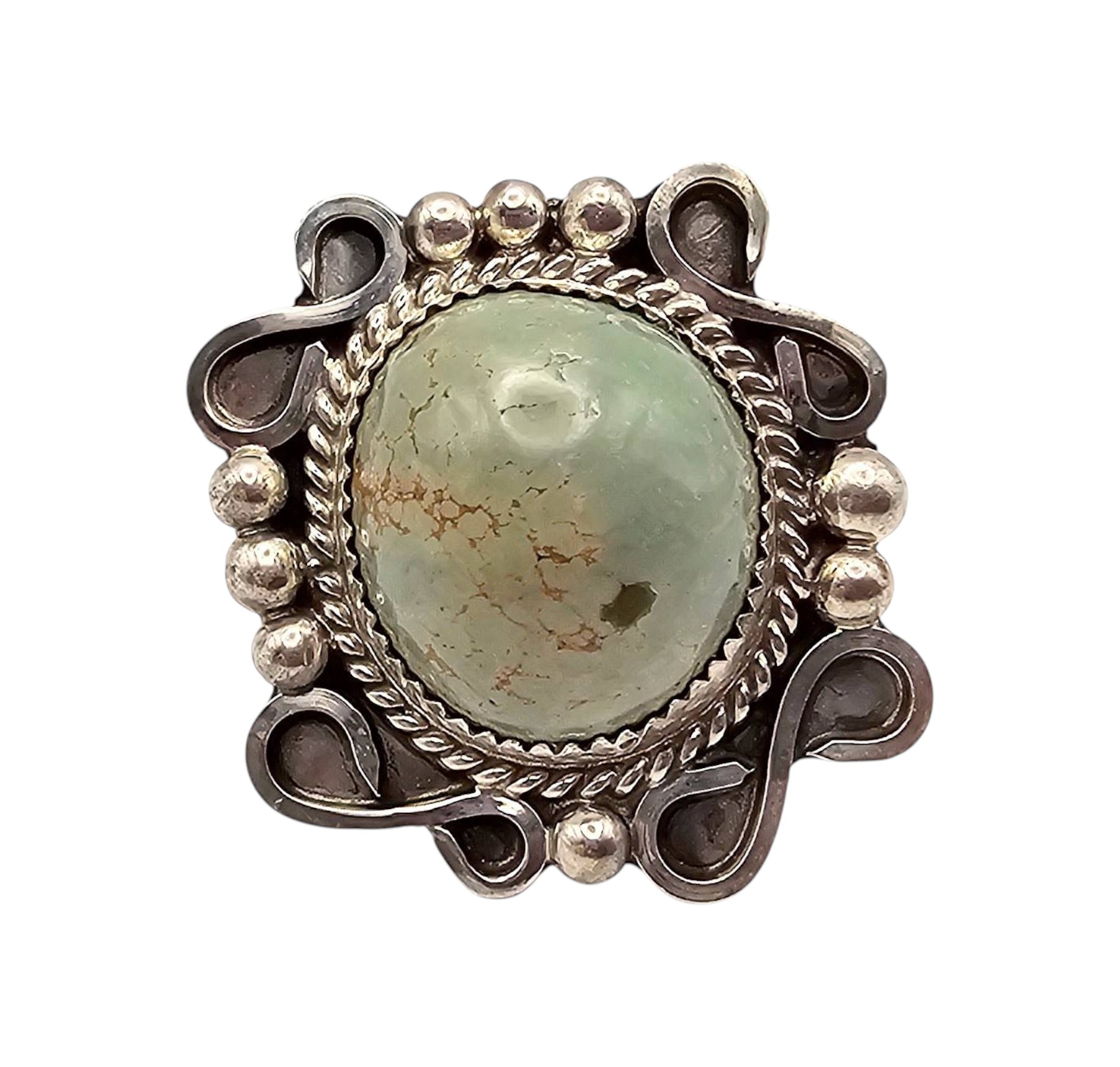 Sterling silver statement ring featuring a green turquoise stone centerpiece with brown veining. The ornate design includes circular and scrollwork details around the bezel setting. Marked “DN” and “Sterling” on the reverse. Total weight is 12.4 grams. Approximate dimensions: 1.5 inches in length. Suitable as a bold fashion accessory or collector’s piece. Size 7.5