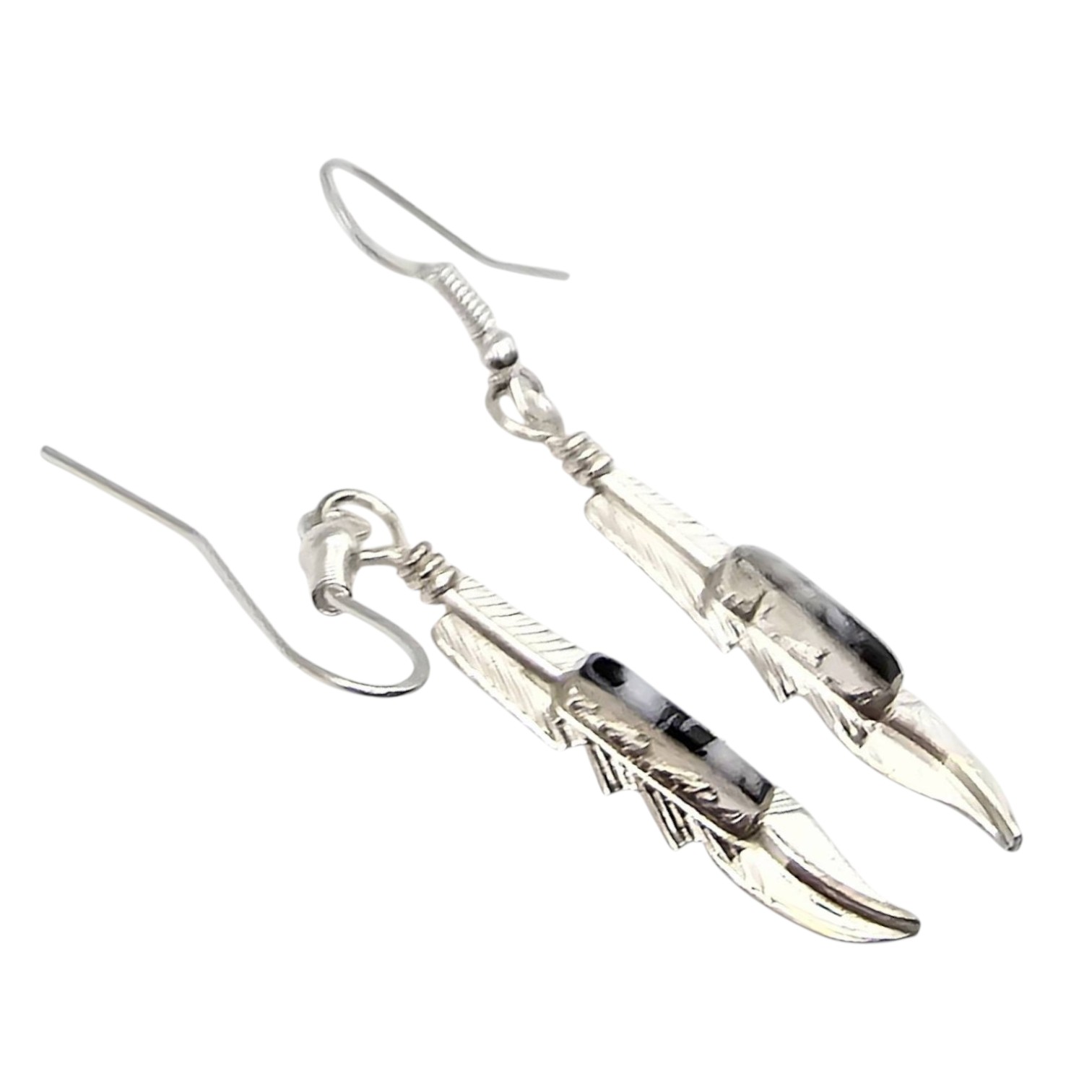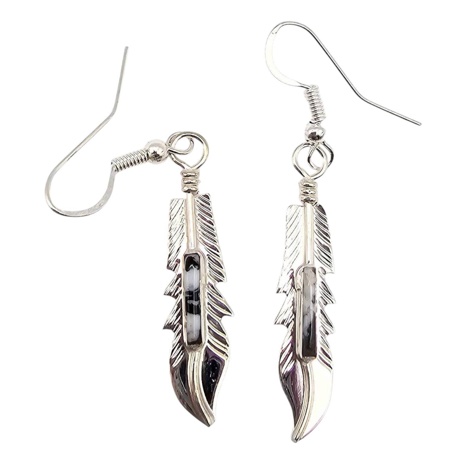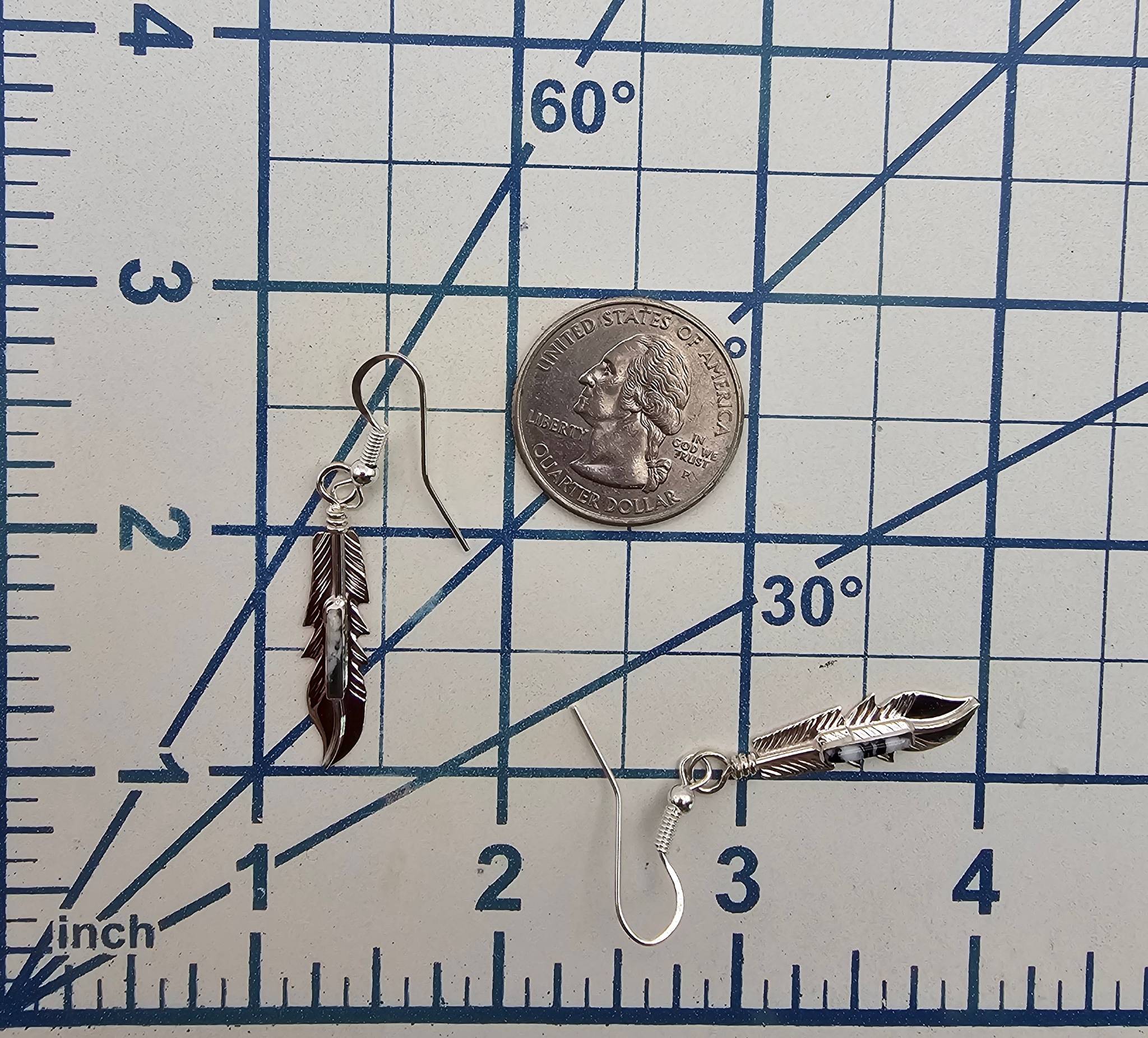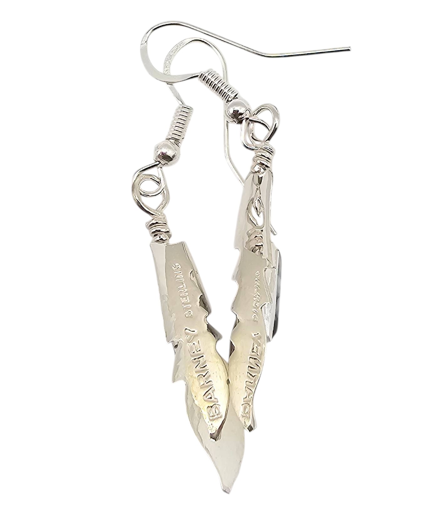 Sterling silver feather-shaped earrings handcrafted by Navajo silversmith Allen Barney. The earrings feature inlaid White Buffalo turquoise stones and are stamped with the artist’s hallmark on the reverse. Total weight is 2.1 grams. Drop hook design for pierced ears. Each earring measures approximately 1.75 inches in length, excluding hooks.
