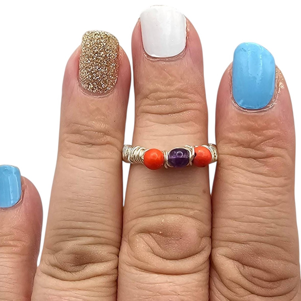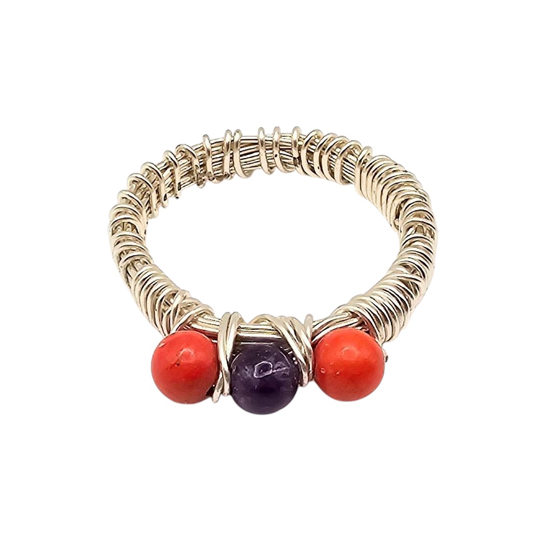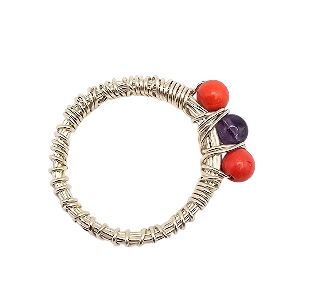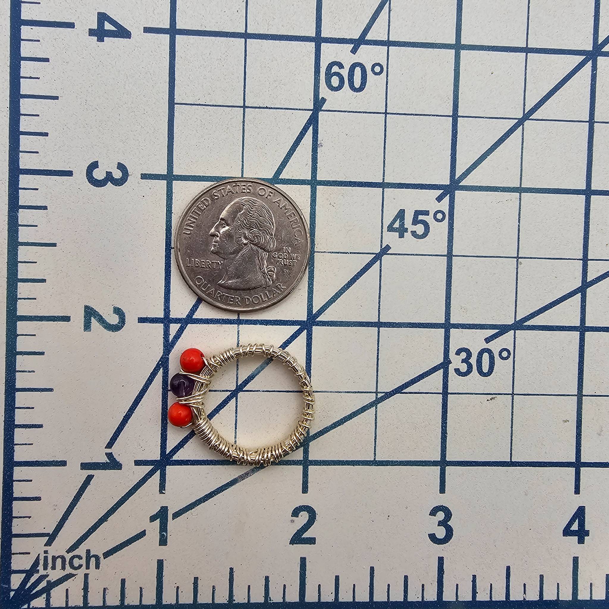Silver twist wire ring handcrafted by Navajo artisan Linda Yazzie. Features two red coral stones and one amethyst stone encased in a coiled silver wire design. Ring weighs approximately 2.5 grams. Handmade design highlights intricate craftsmanship and indigenous traditions. Size of the ring is shown relative to a US quarter coin size 6.5