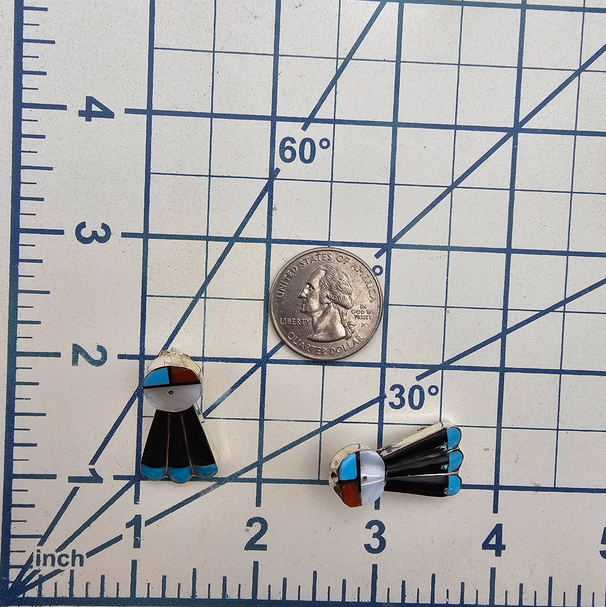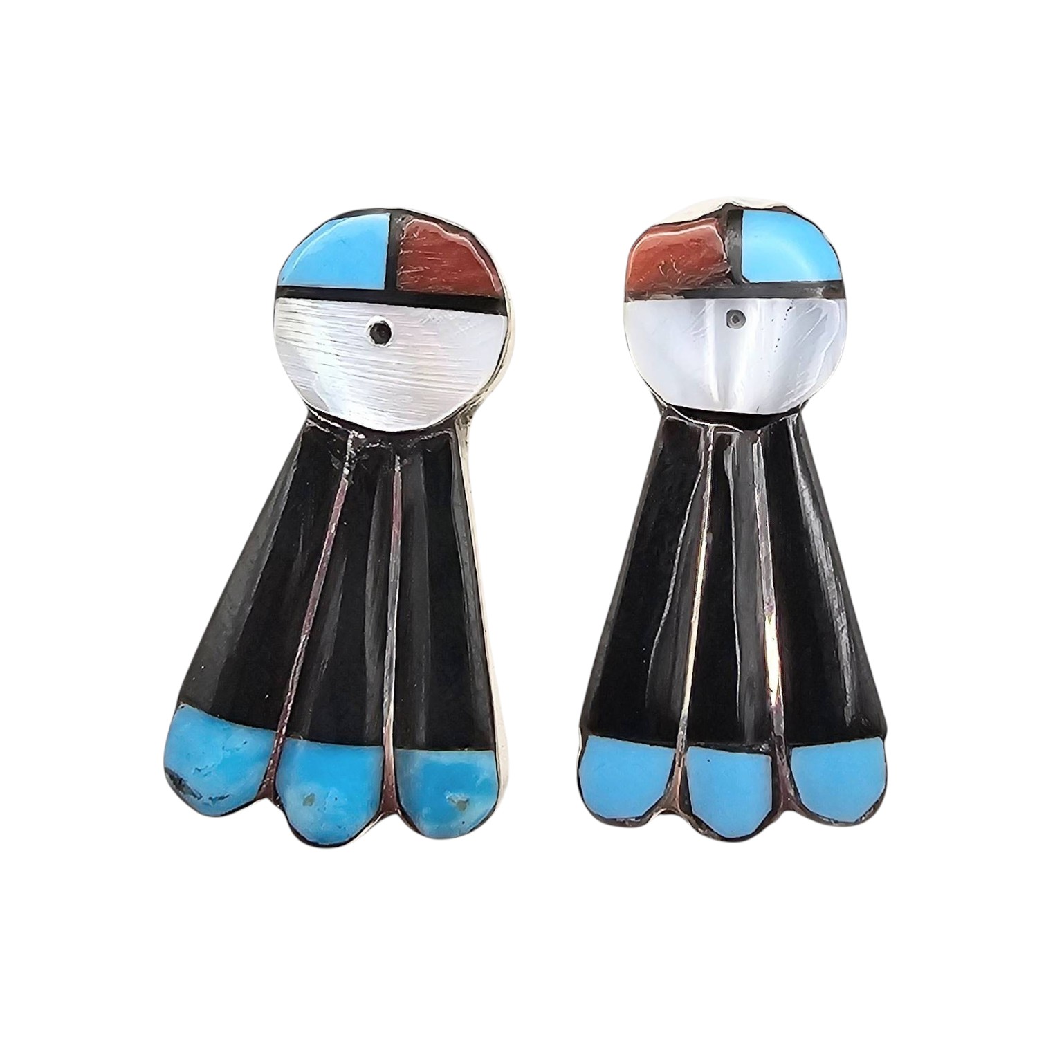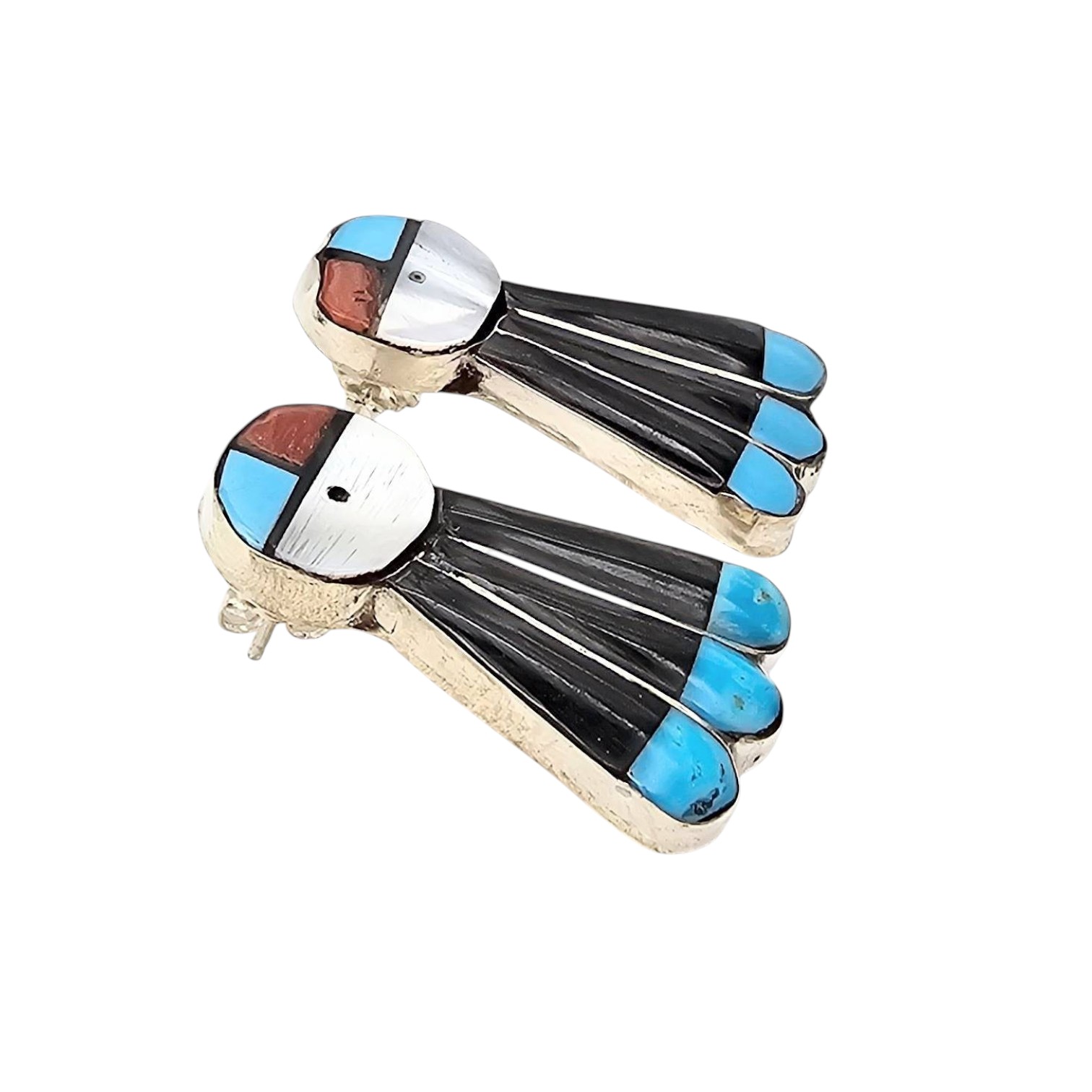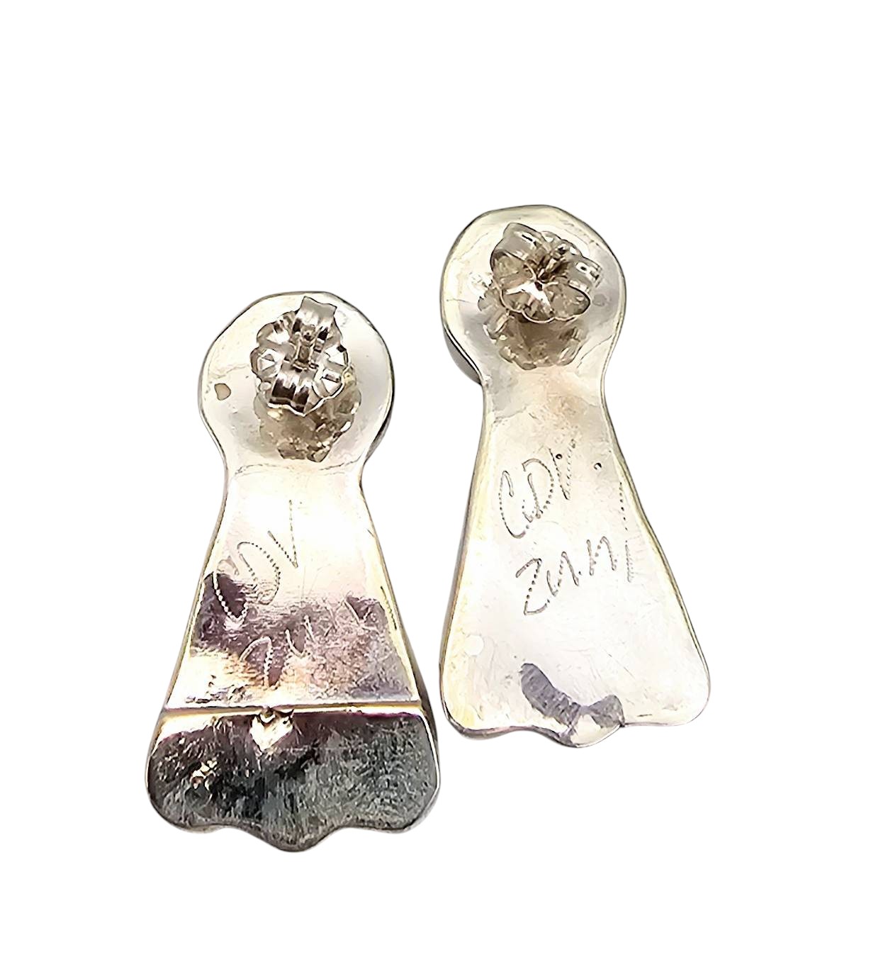 Handmade earrings by Cheryl Paywa, a Zuni artisan. Crafted in sterling silver, these earrings feature a multi-stone inlay design with turquoise, red coral, black onyx, and mother-of-pearl. The earrings are marked on the reverse with ‘CDP Zuni’ and measure approximately 1 inch in length. The total weight is 6.2 grams.