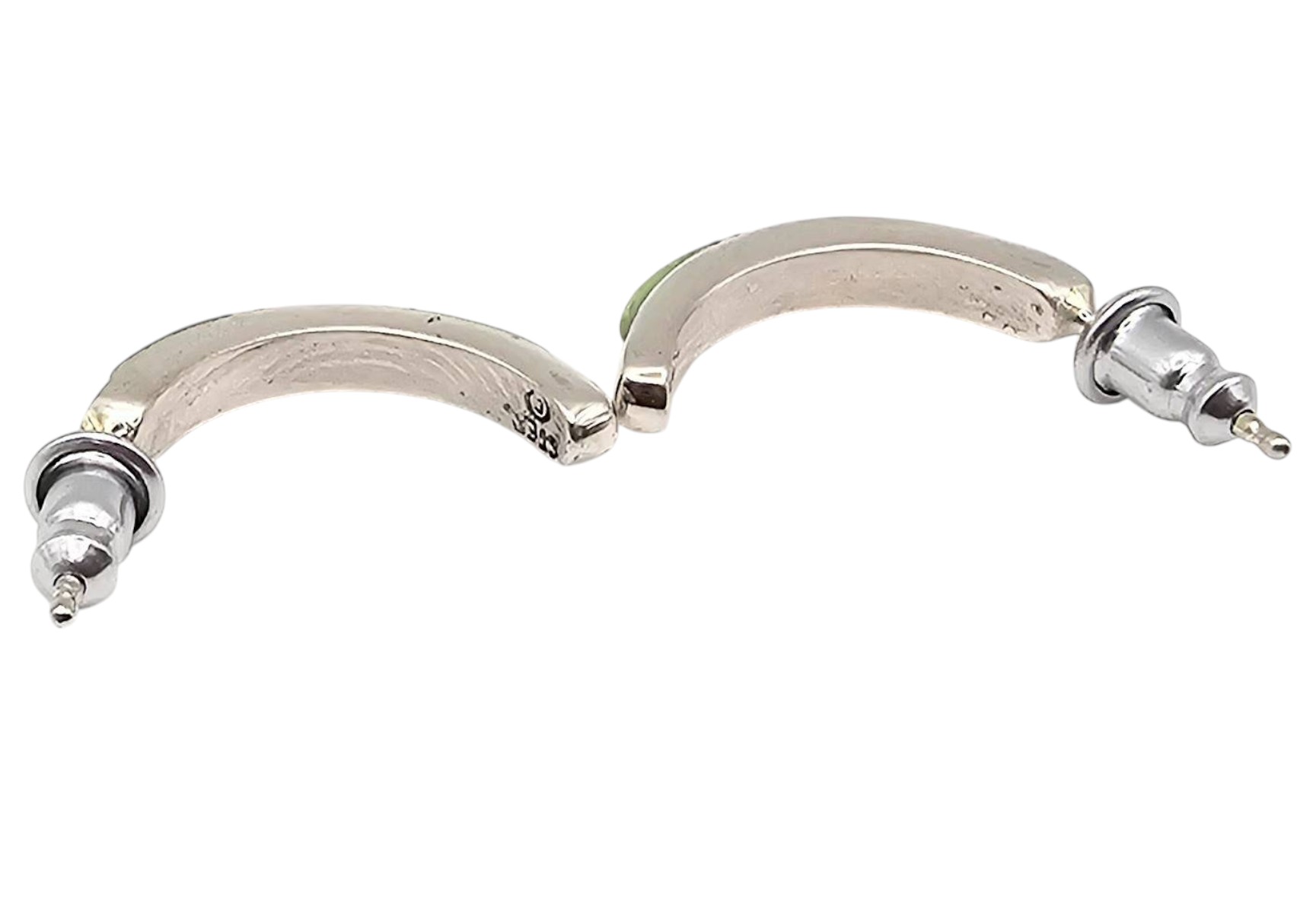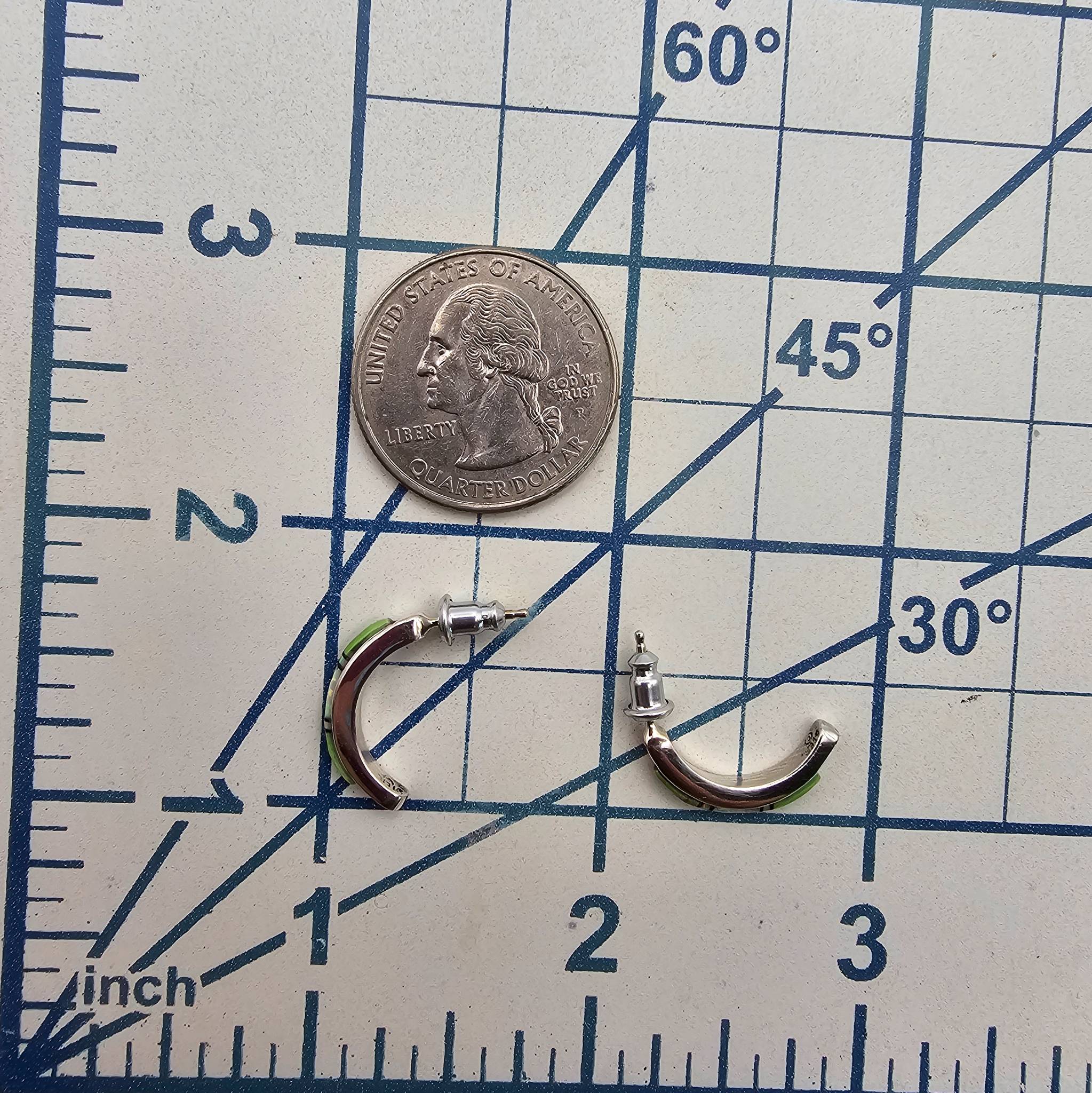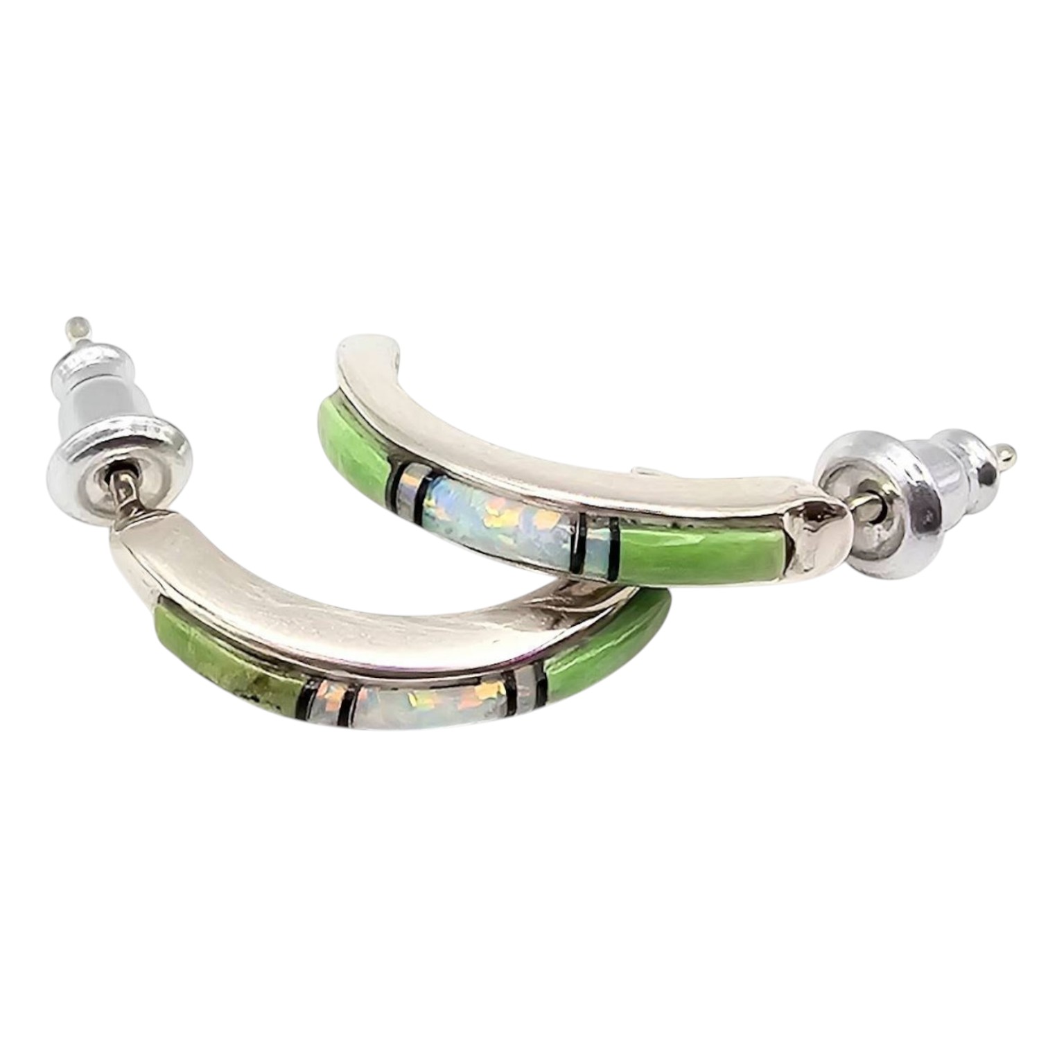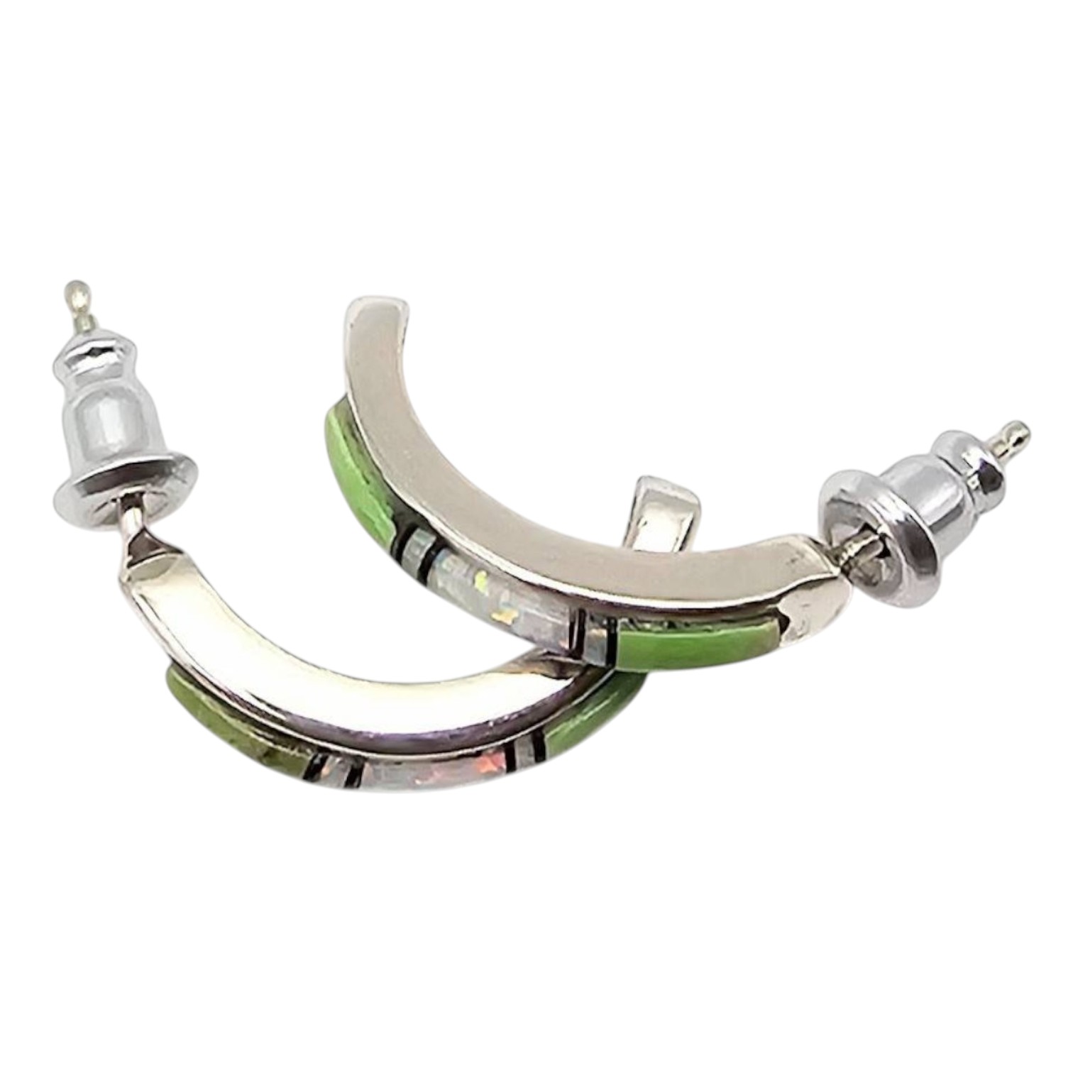 Laura Lincoln Navajo handmade earrings featuring a Multi-Stone inlay design, including green Chrysoprase accents and opal accents details. Mounted on a sterling silver base with curved post-back design. Lightweight at 2.4 grams per piece with dimensions shown relative to a U.S. quarter for size reference. A fine piece of Native American craftsmanship.