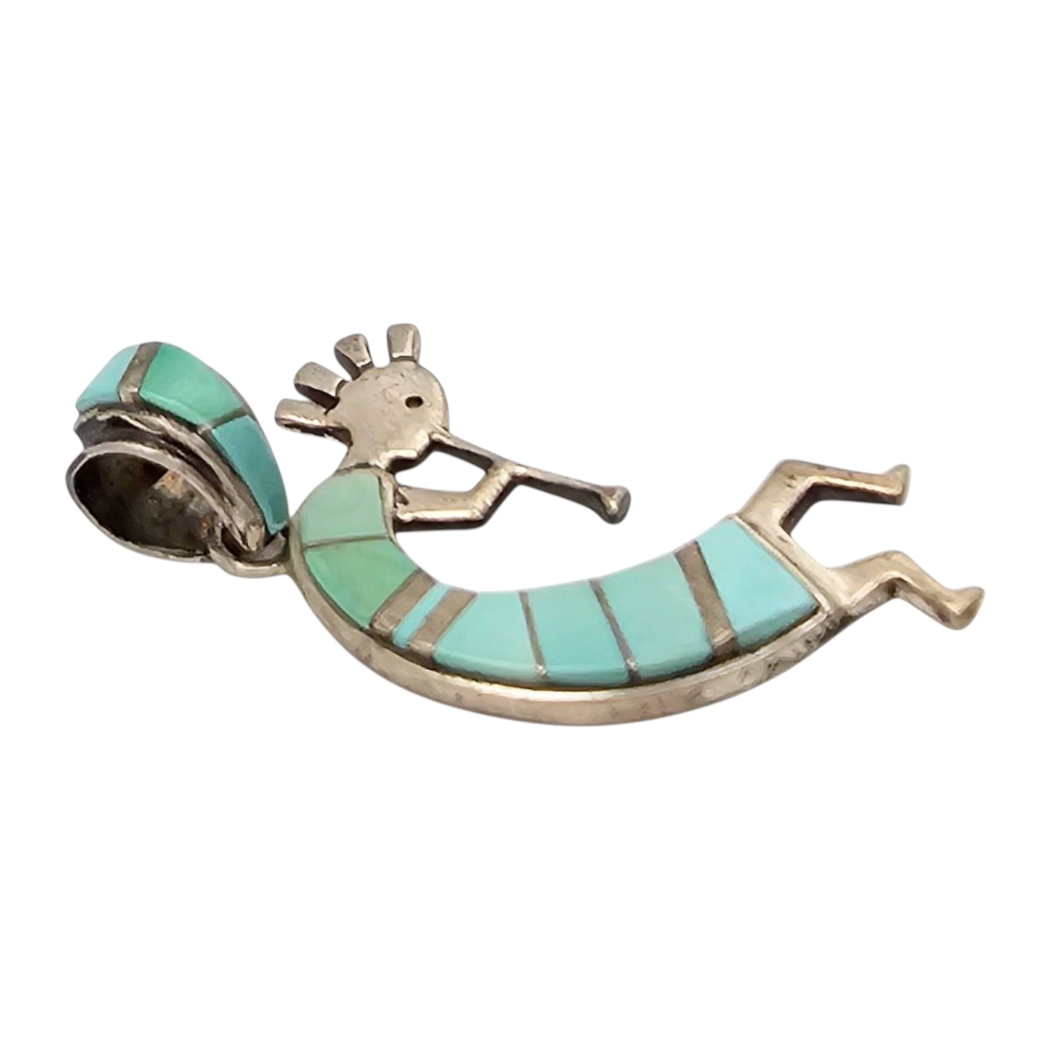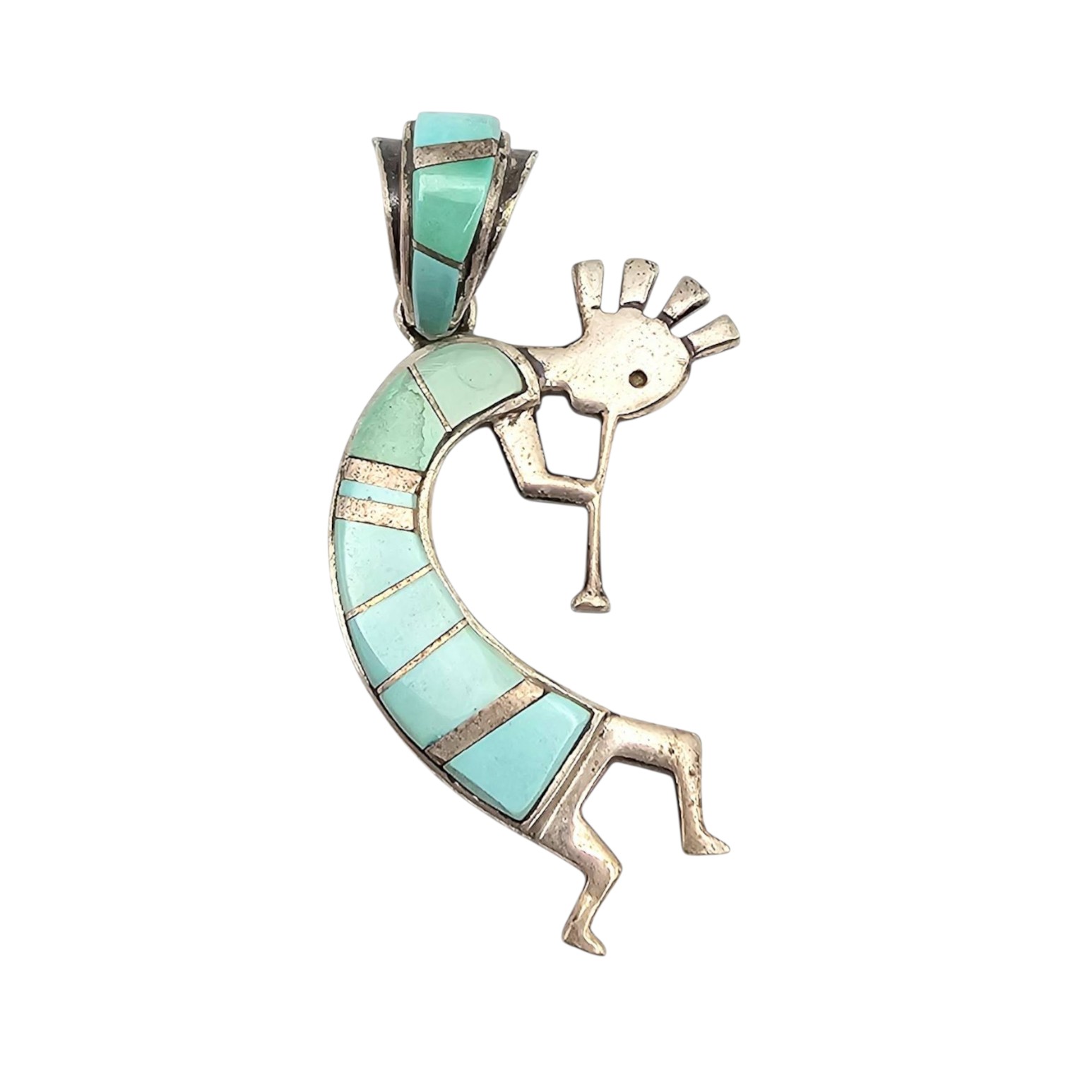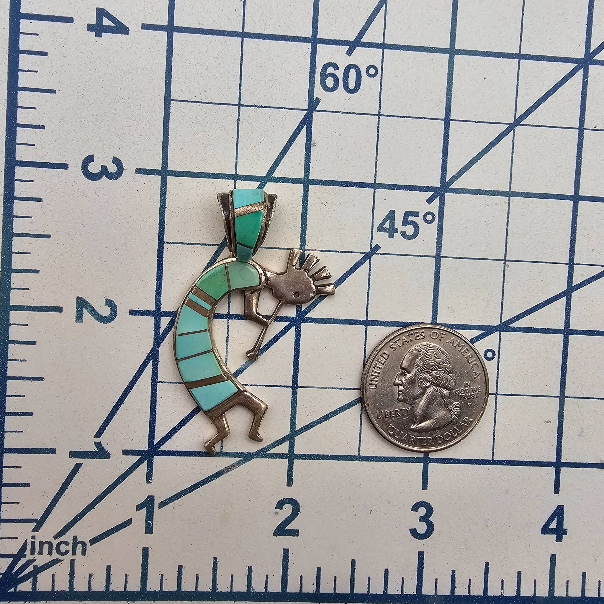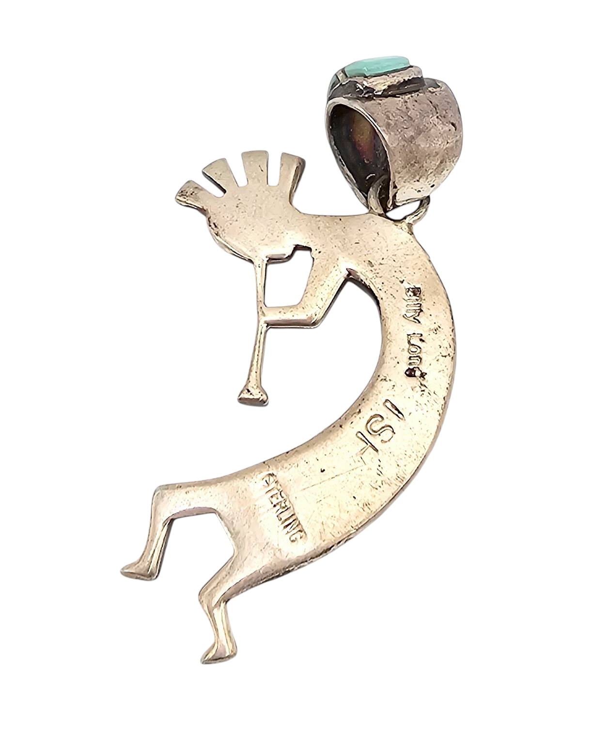Sterling silver Kokopelli pendant handcrafted by Navajo artist Billy Long. The design features turquoise inlay set in sterling silver, showcasing traditional Native American artistry. The reverse side is marked ‘STERLING’ and ‘ISI’. Weighs approximately 8.2 grams. Includes a large bail also inlaid with turquoise, suitable for various chain sizes. Measures approximately 2 inches in height.