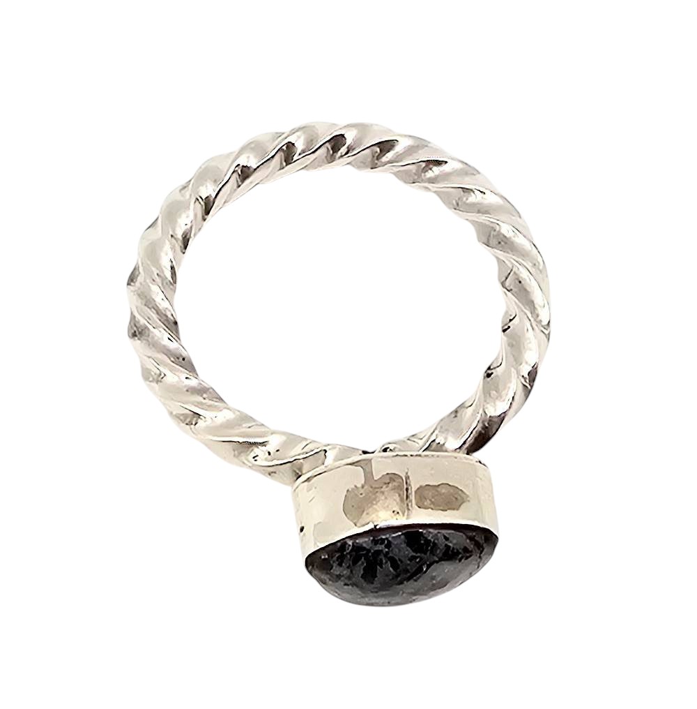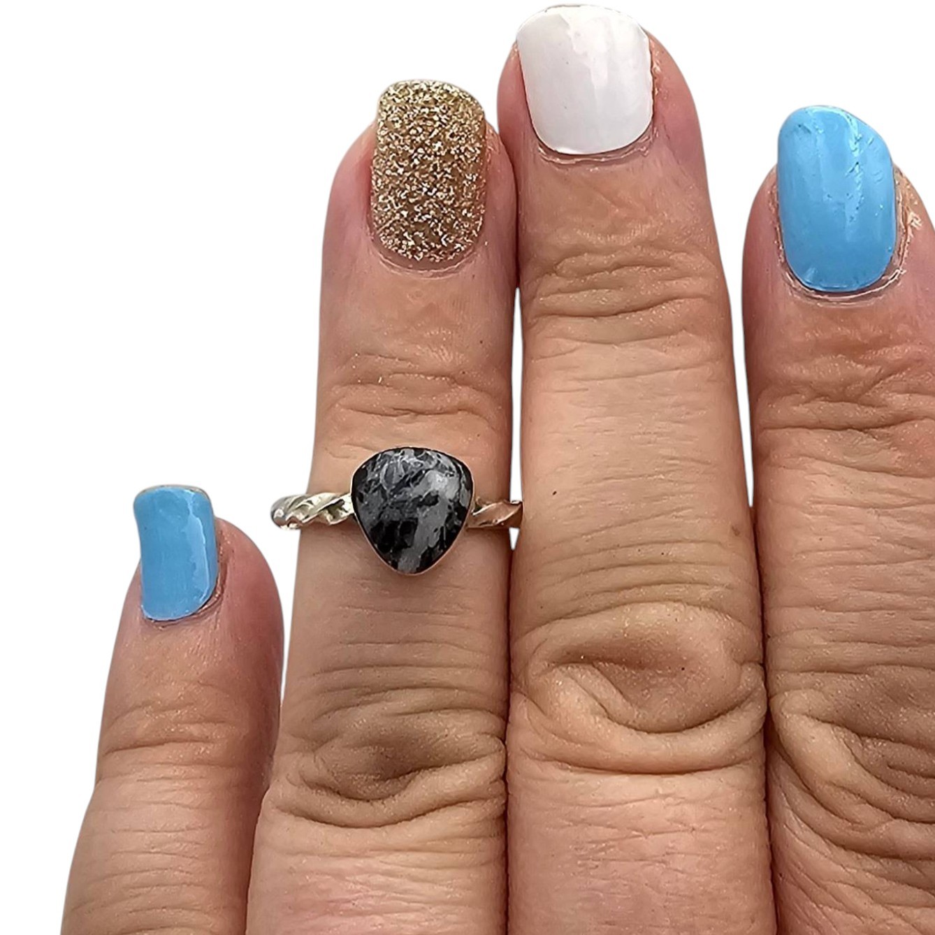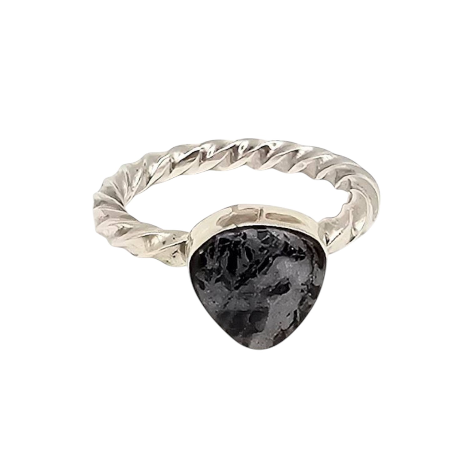 Sterling silver ring featuring a snowflake obsidian stone in a bezel setting. The twisted band adds a textured design element. The ring is a size 4.5, weighing approximately 3.1 grams. Suitable as a statement piece or for everyday wear.