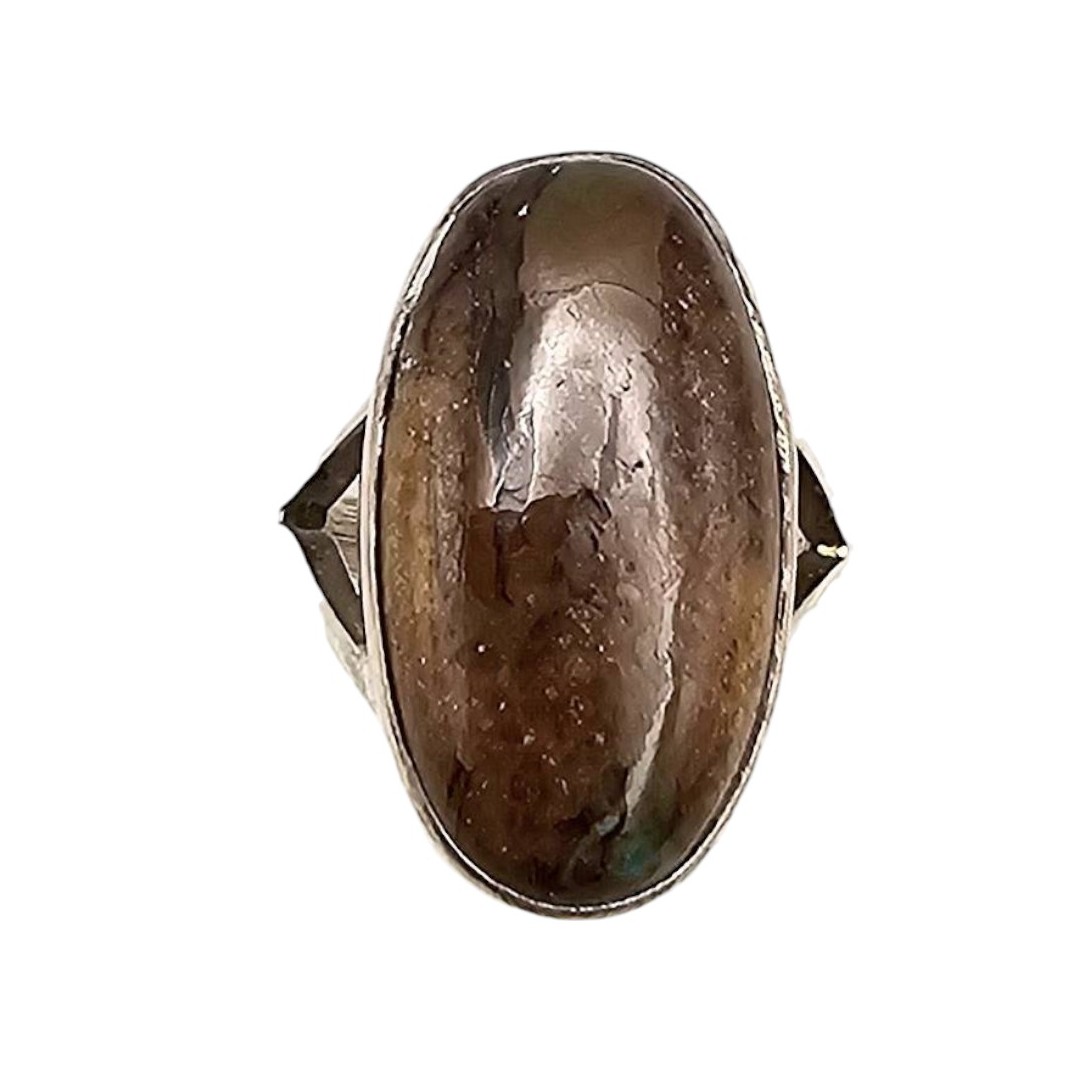A handmade sterling silver ring by Jerold Francisco, a Navajo artisan. The piece features a Boulder Turquoise gemstone. Ring size is 6, and it weighs approximately 6.7 grams. The design highlights the natural beauty of the stone with a polished silver setting