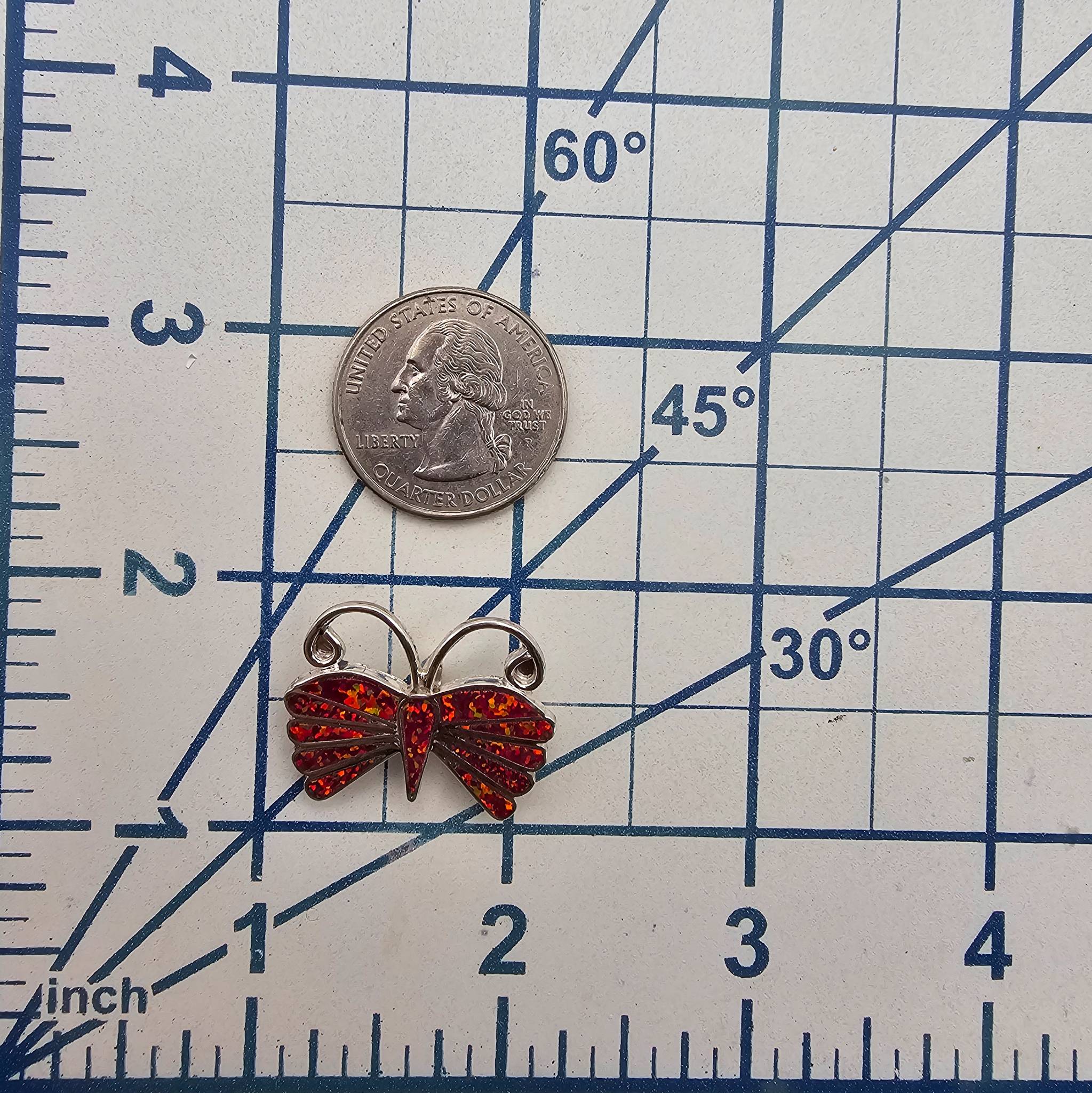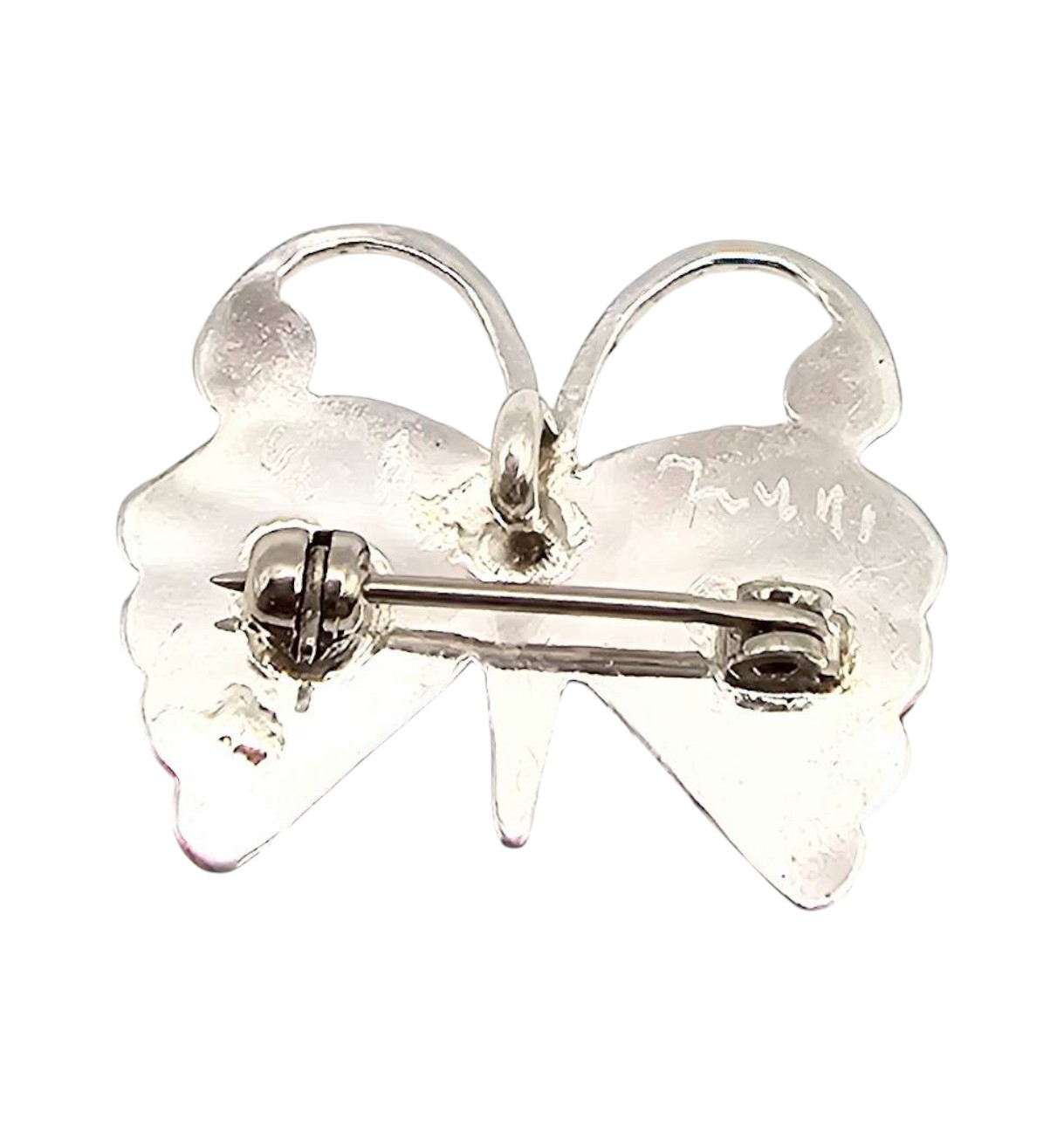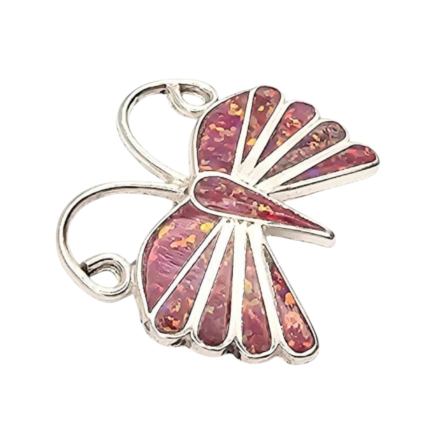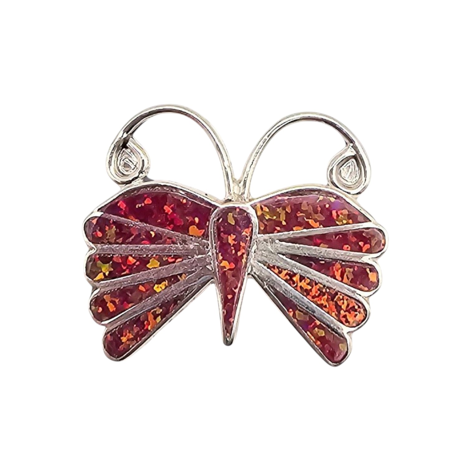 Handmade Zuni jewelry piece by Emma Edaakie, featuring a butterfly design. Crafted from sterling silver with opal inlay, the pin can also double as a pendant. Weighing 3.6 grams, it is a lightweight, versatile accessory. Includes a pin clasp on the back and a loop for optional necklace wear. Dimensions are approximately 1.5 inches wide.