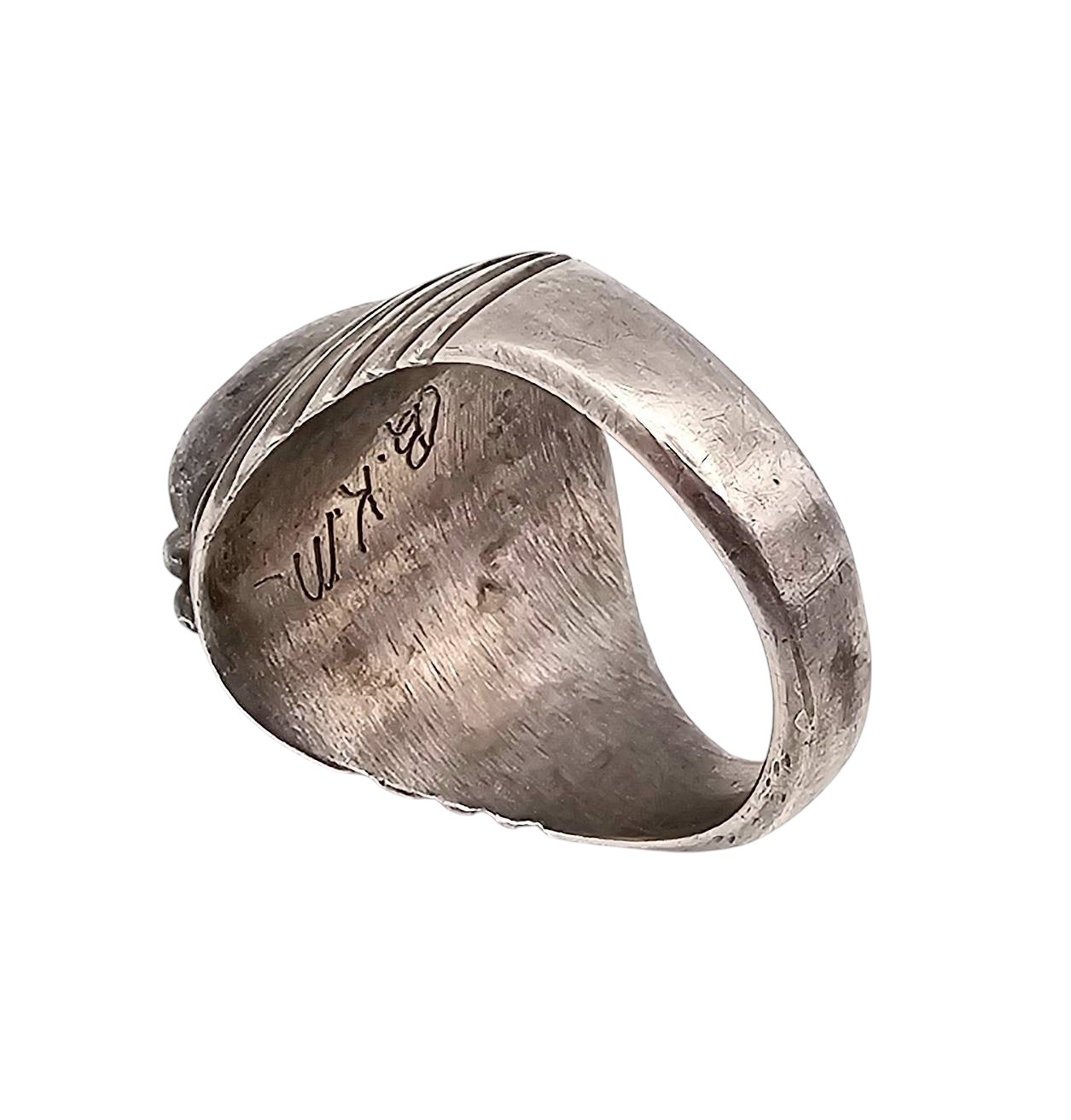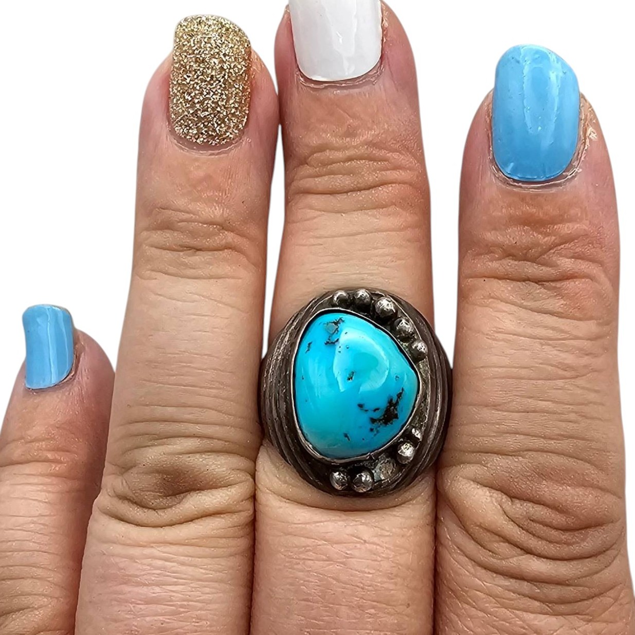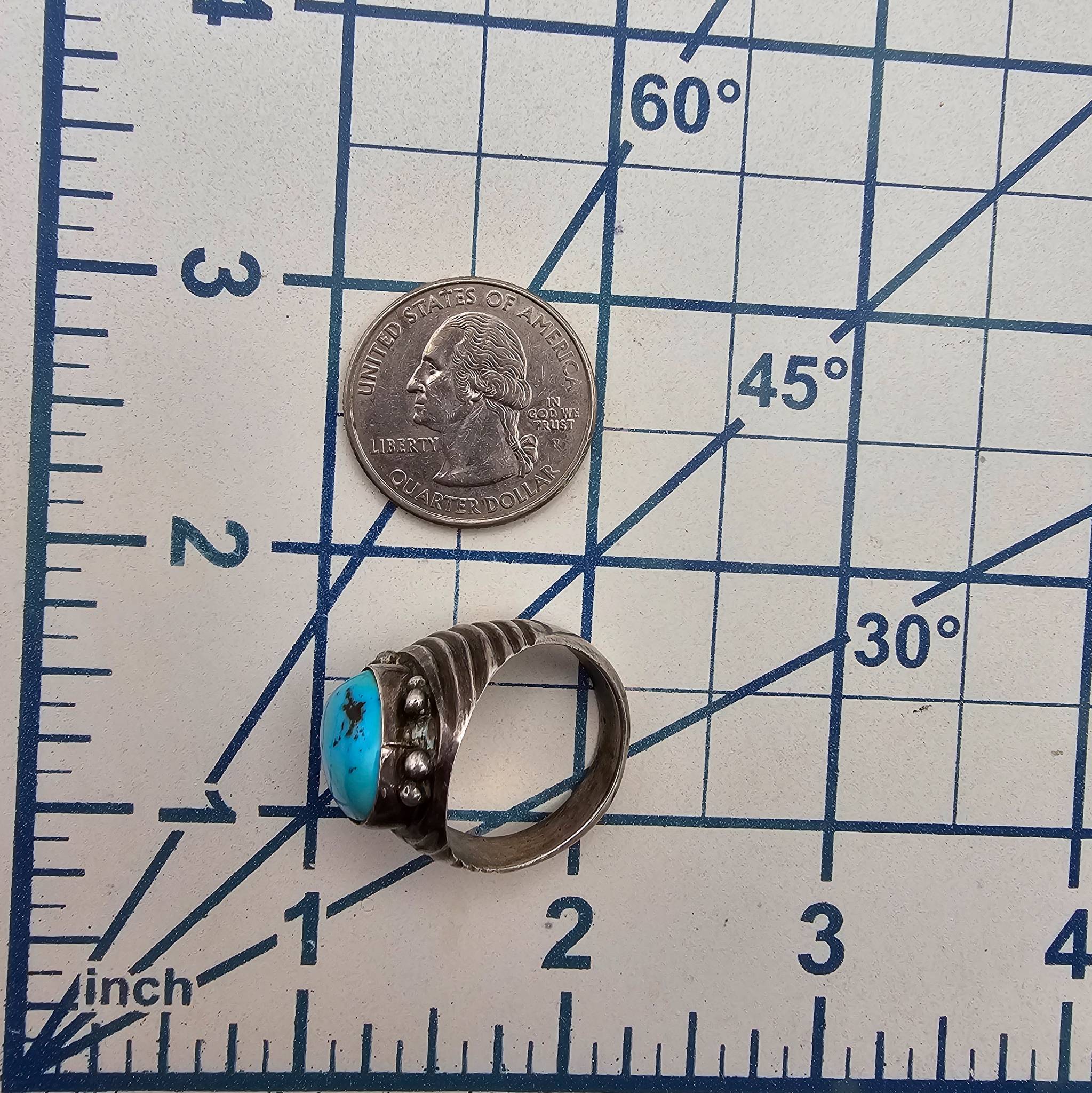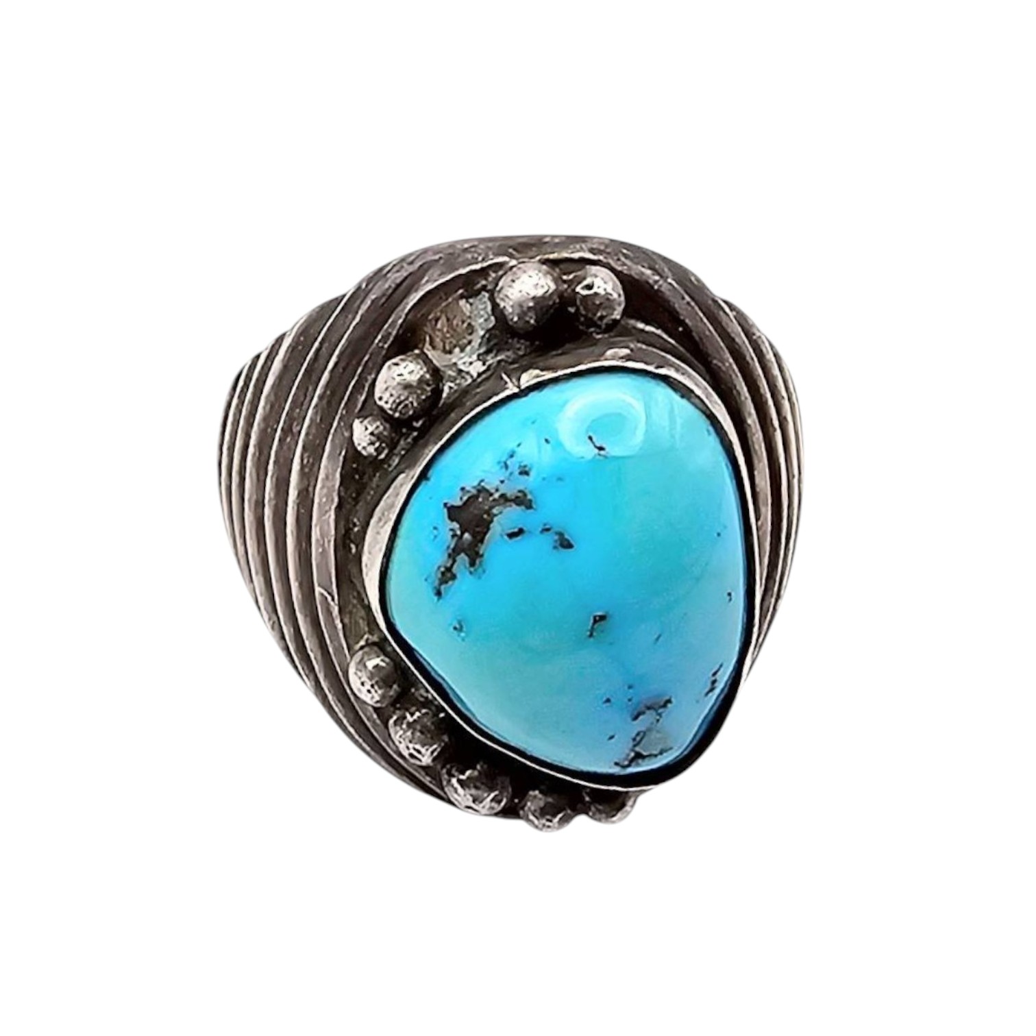 Sterling silver ring with a turquoise stone, signed ‘BKM’ on the inner band. The ring features a layered design with silver details around the turquoise stone. It is a size 9.5 and weighs approximately 13.1 grams.