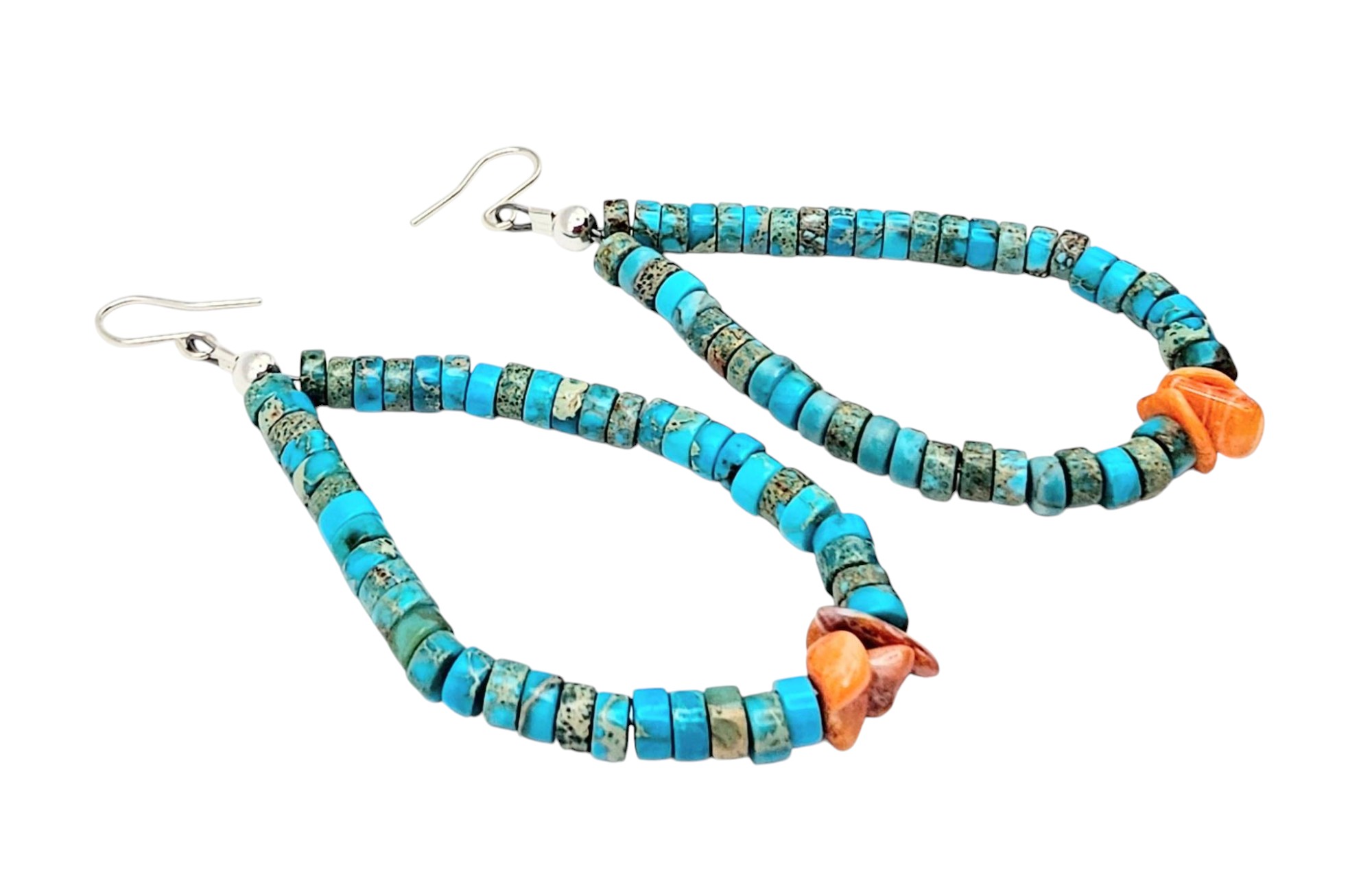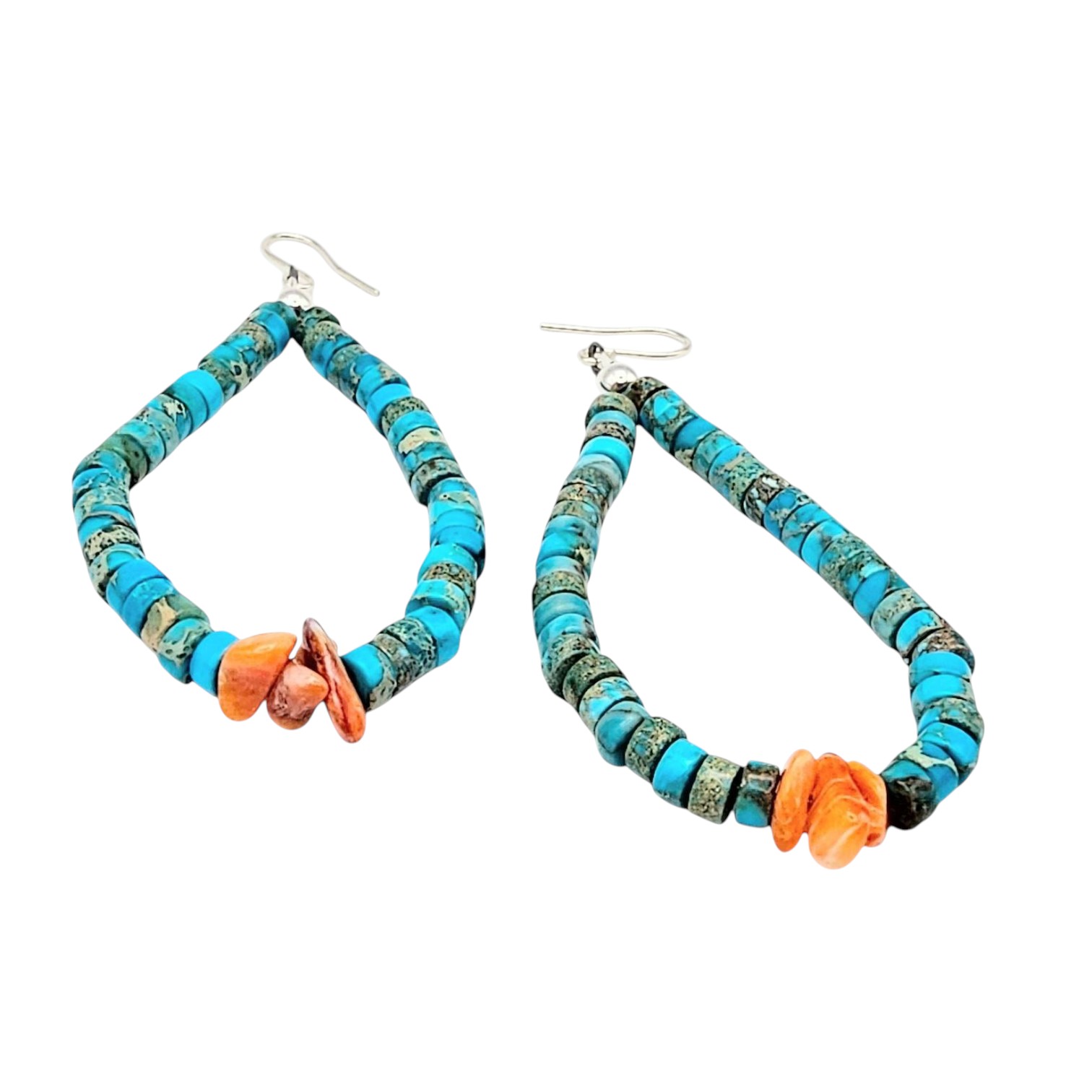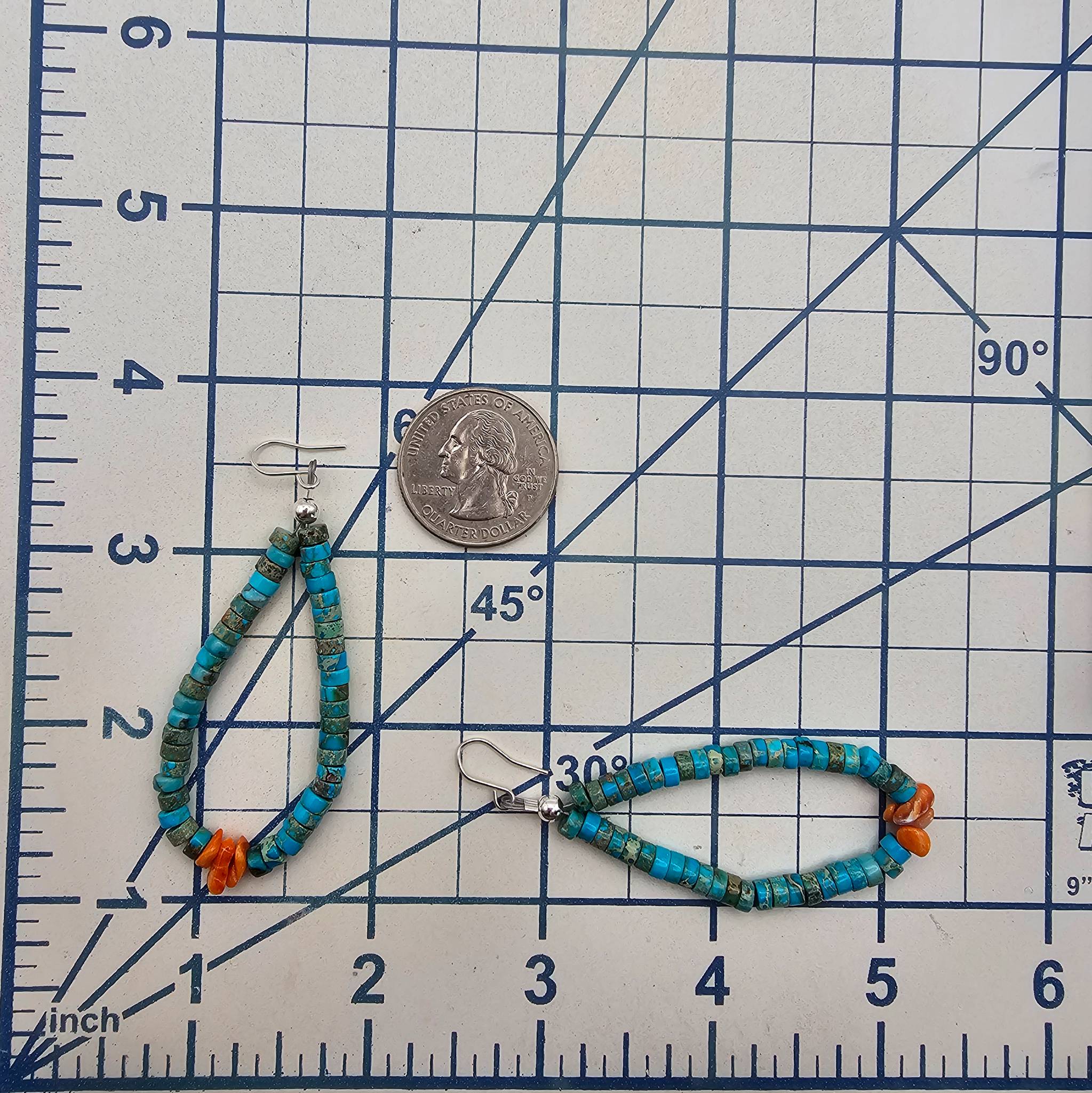 Sterling silver earrings featuring Kingman turquoise and spiny oyster beads. The earrings are designed in a teardrop shape with vibrant turquoise and contrasting orange spiny oyster elements. The total weight is approximately 7.6 grams as shown on scale. Includes attached hooks for wear. Approximate size reference is shown with a ruler.