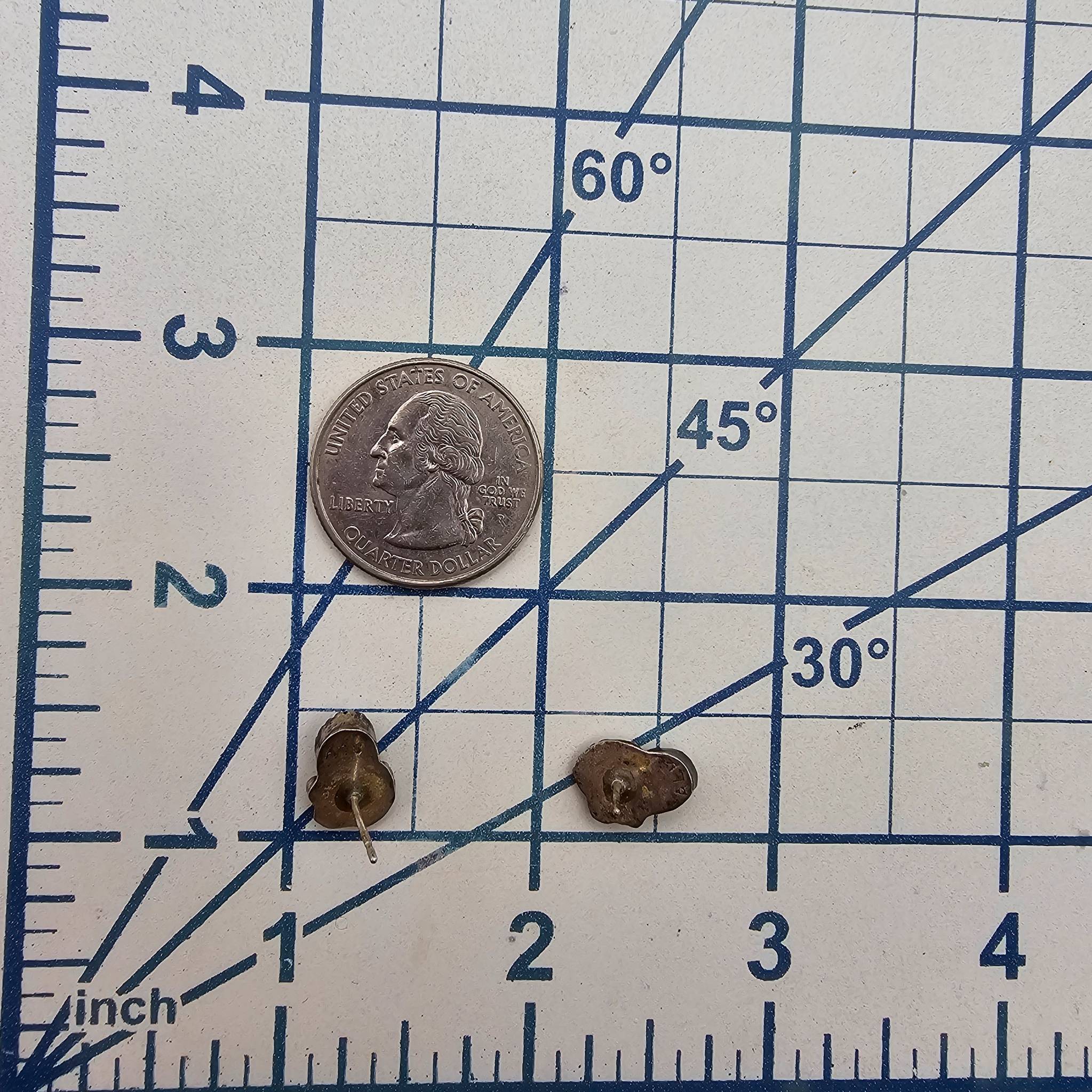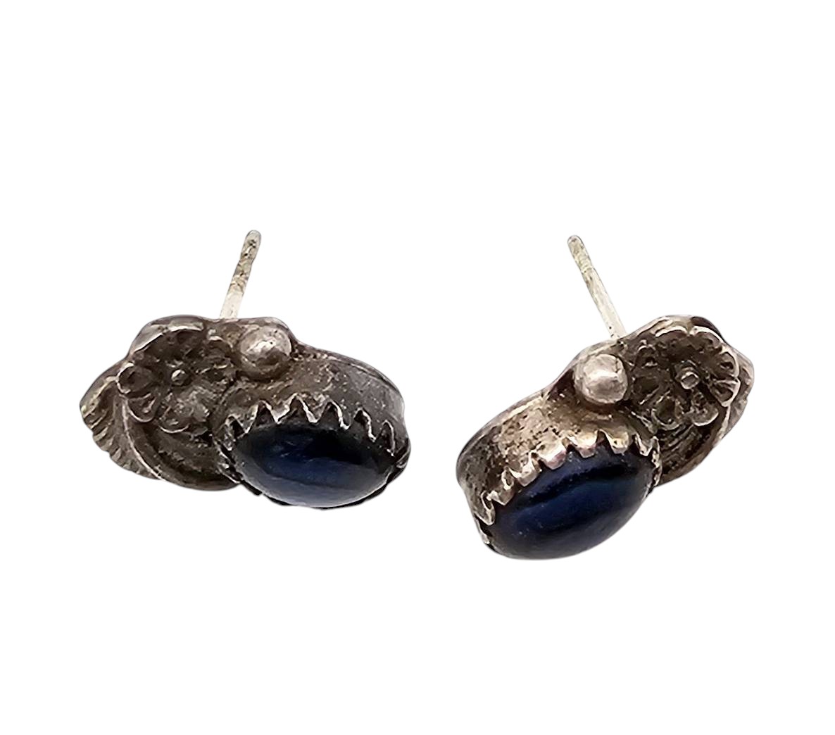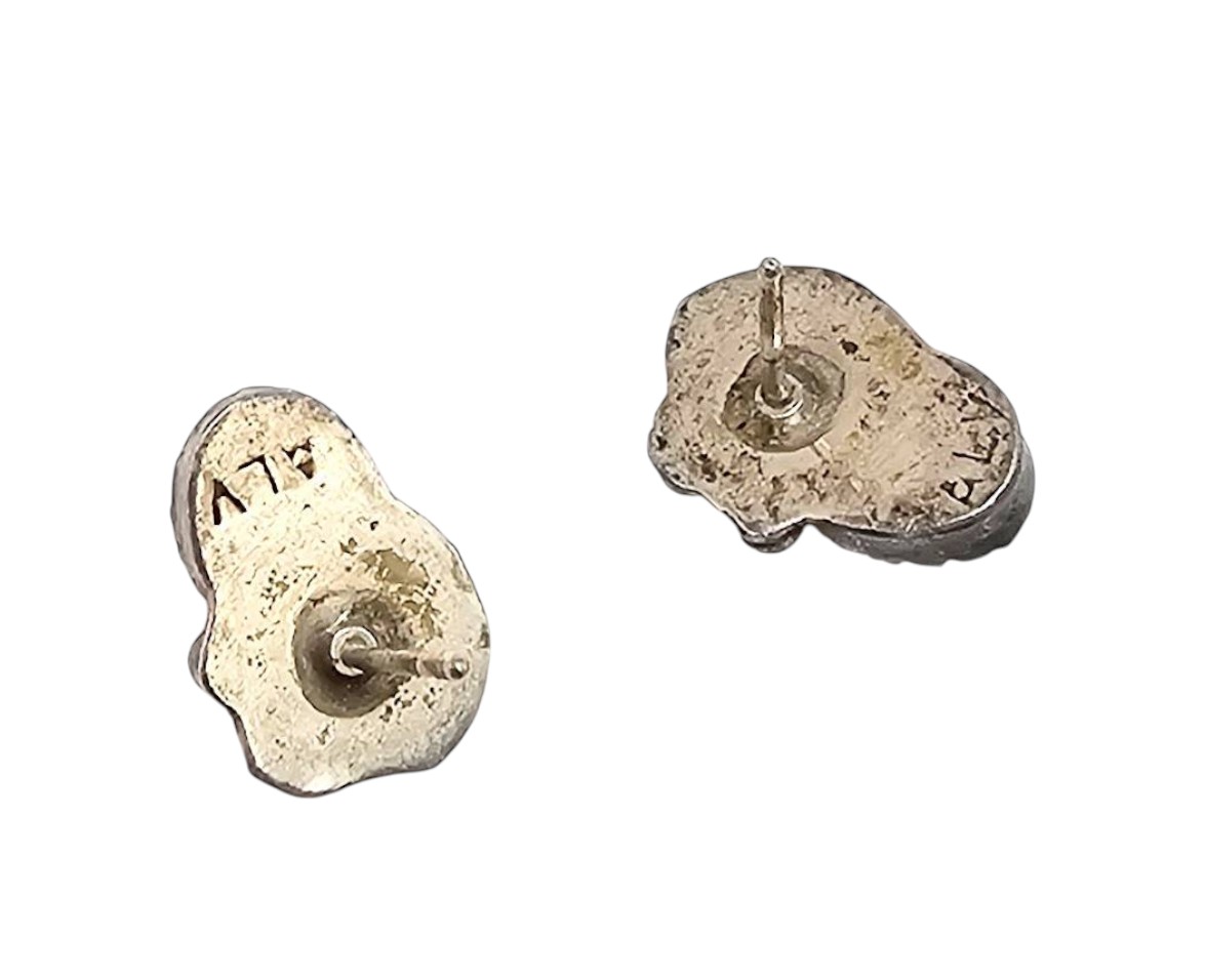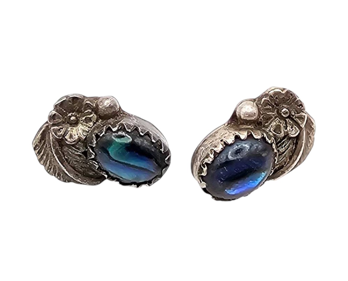Post-back earrings signed ‘ALV,’ crafted from sterling silver and featuring abalone inlay. The earrings are adorned with floral and leaf motifs, showcasing intricate craftsmanship. Weighing 1.9 grams in total, their dimensions are shown relative to a quarter and a ruler for scale. Excellent potential for collectors of Native or artisan jewelry.