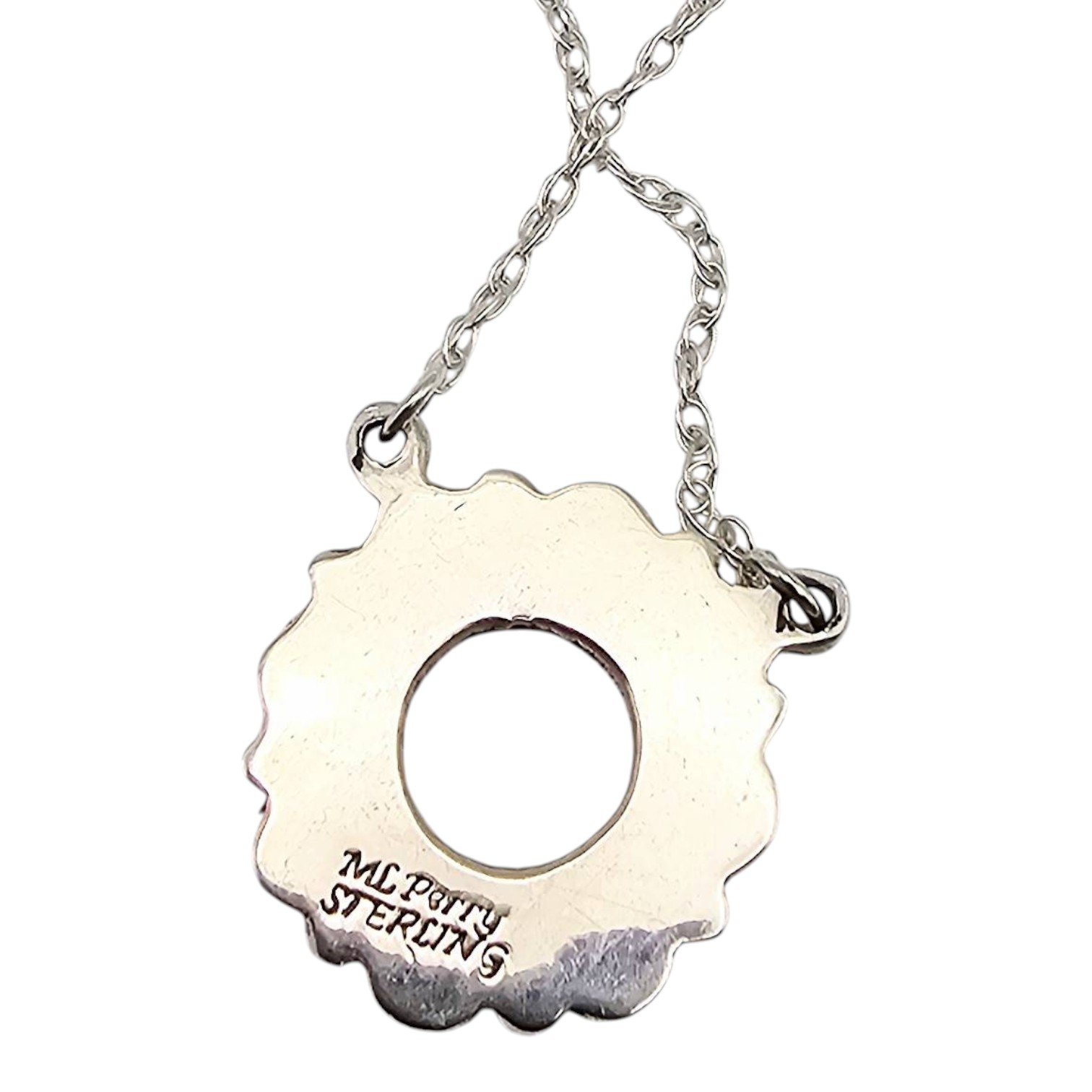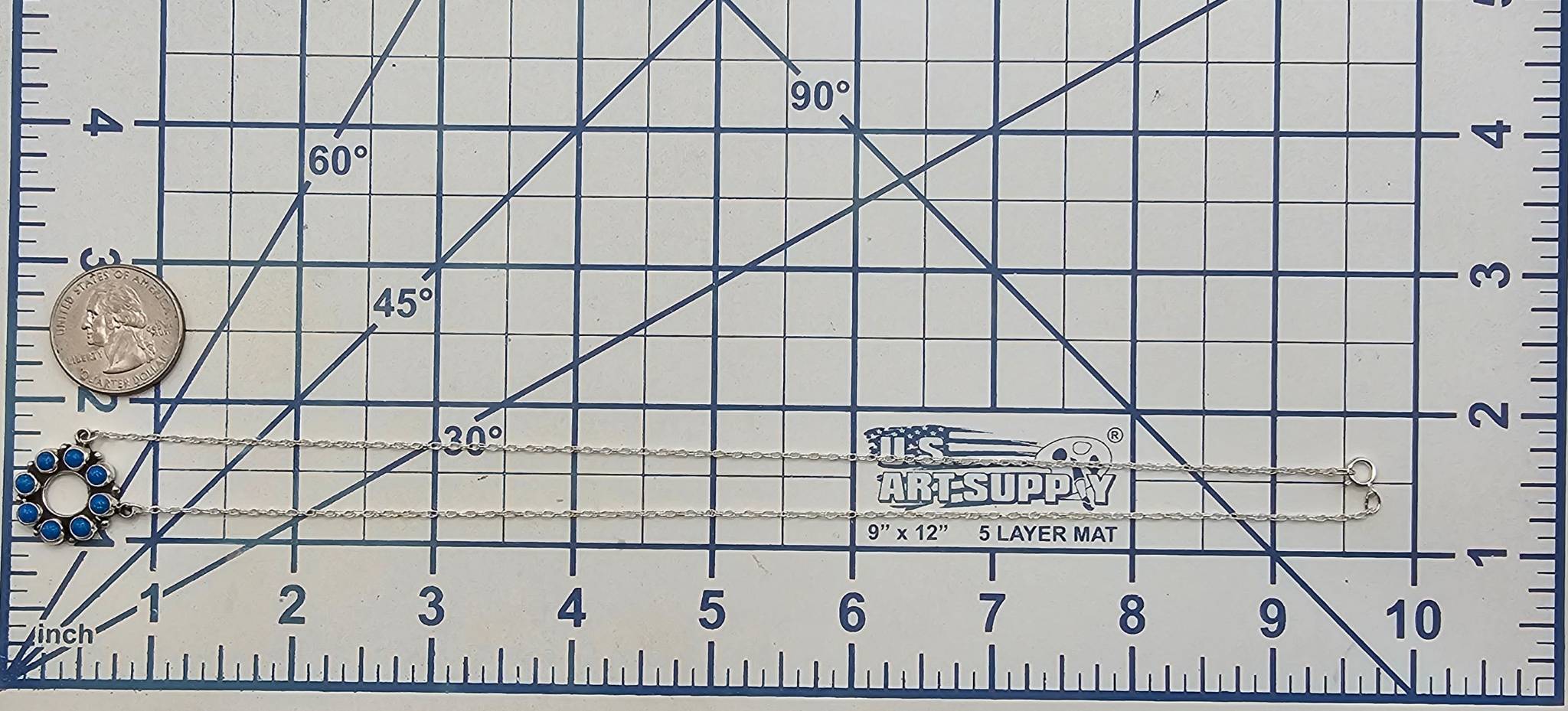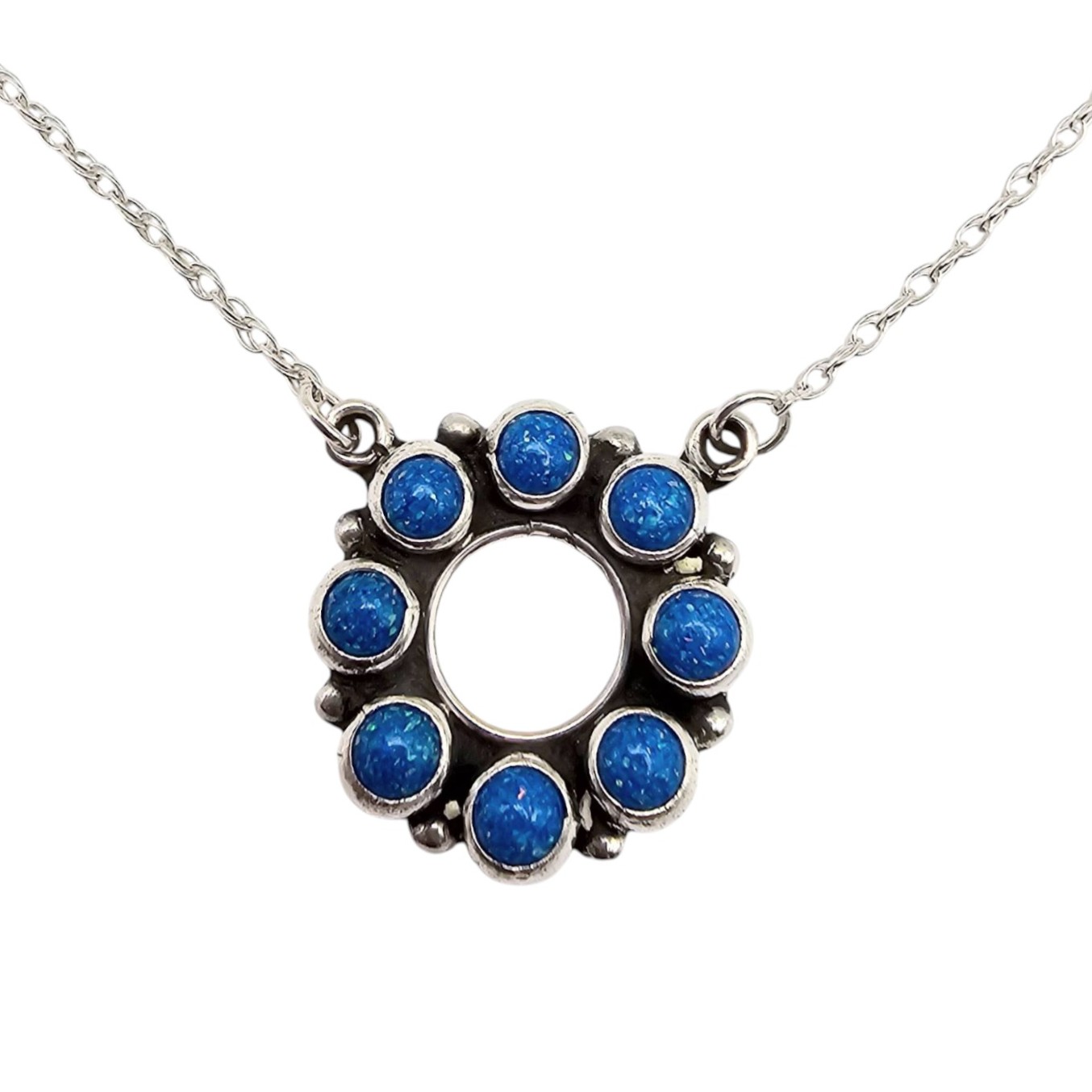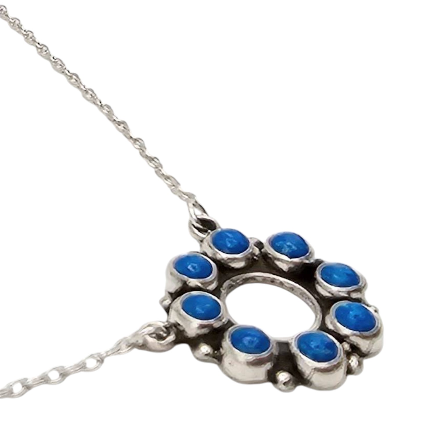 Sterling silver Navajo necklace by Loretta Delgarito featuring a pendant with 8 round blue opal stones arranged in a circular design. The pendant is marked ‘Sterling’ and includes the maker’s mark ‘LC Patti.’ The necklace weighs approximately 3.4g as shown. Chain and pendant combined length measures approximately 16 inches.