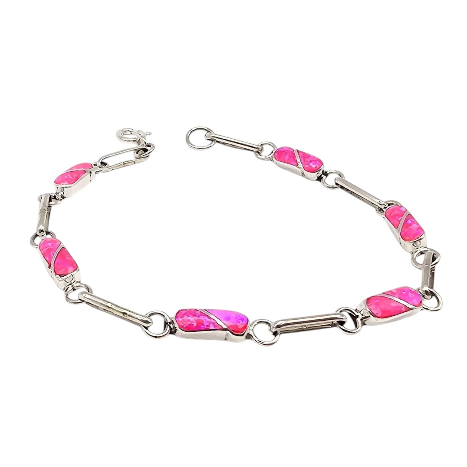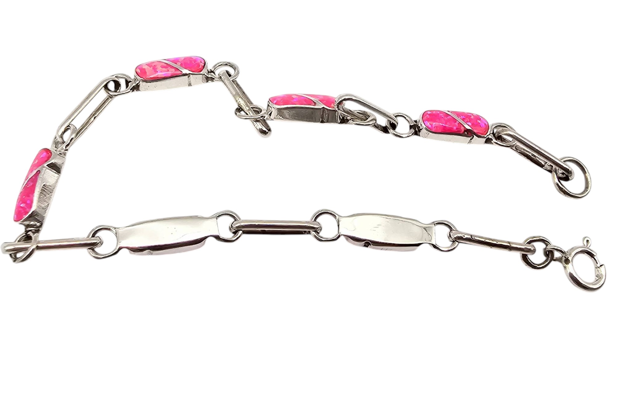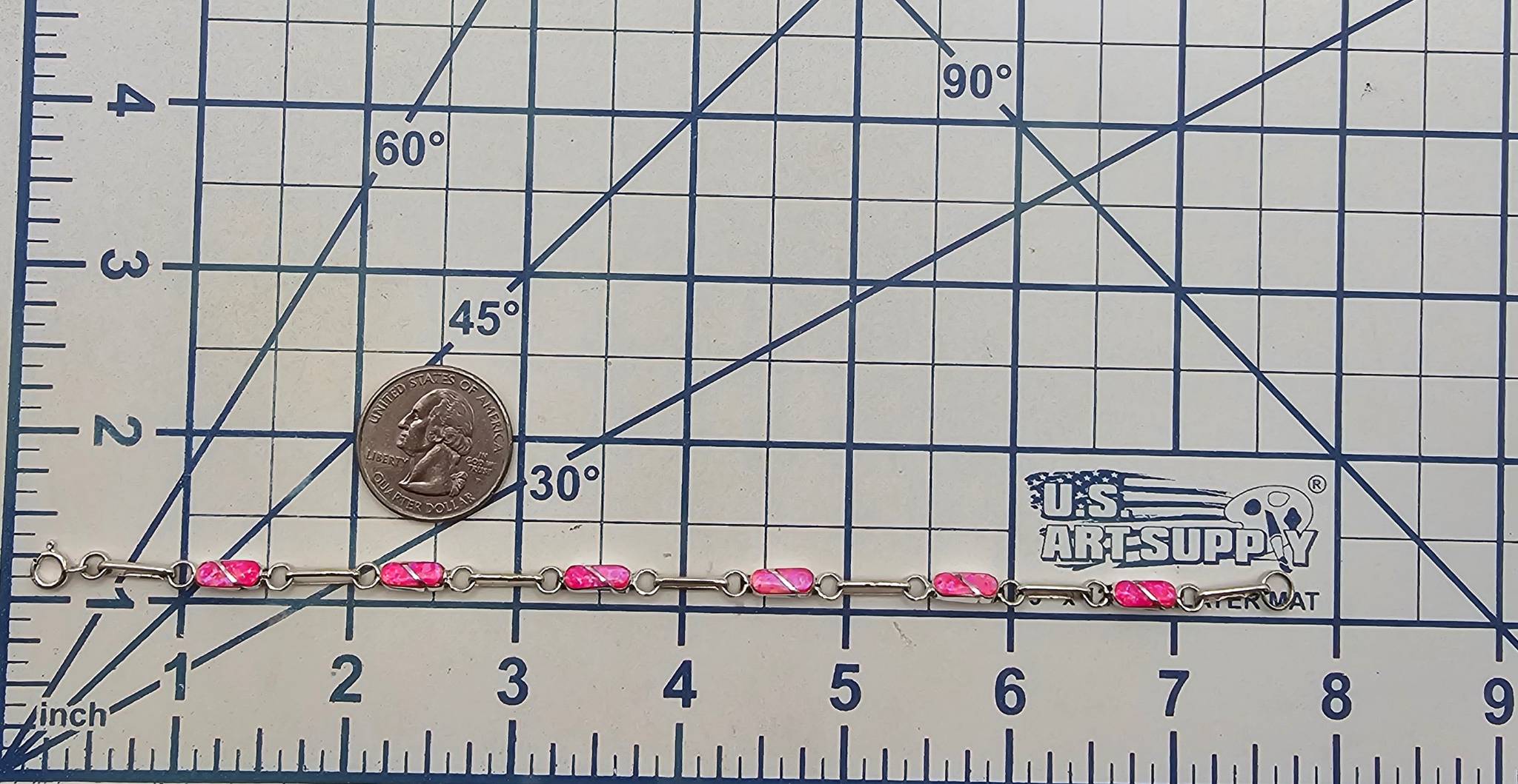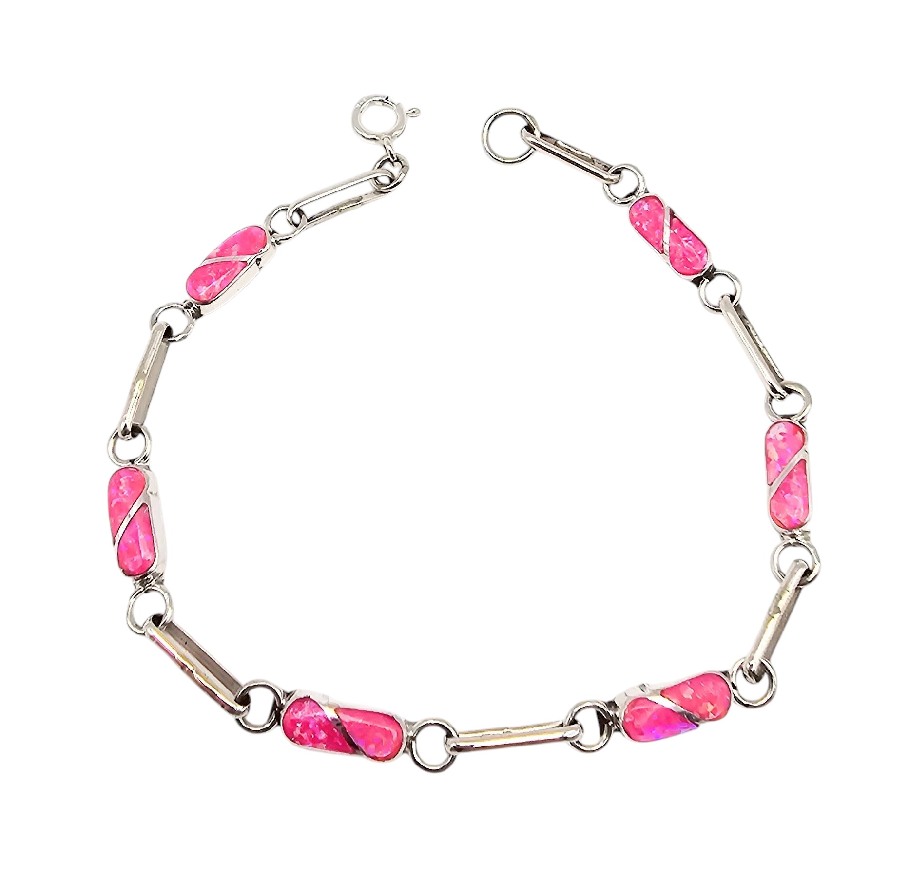 Sterling silver Zuni link bracelet by artisan Gina Dosedo. Features intricate pink opal inlay designs throughout its length and measures approximately 8 inches long. The bracelet weighs 4.5 grams and includes a secure spring ring clasp for closure. Well-crafted and lightweight, suitable for various occasions.