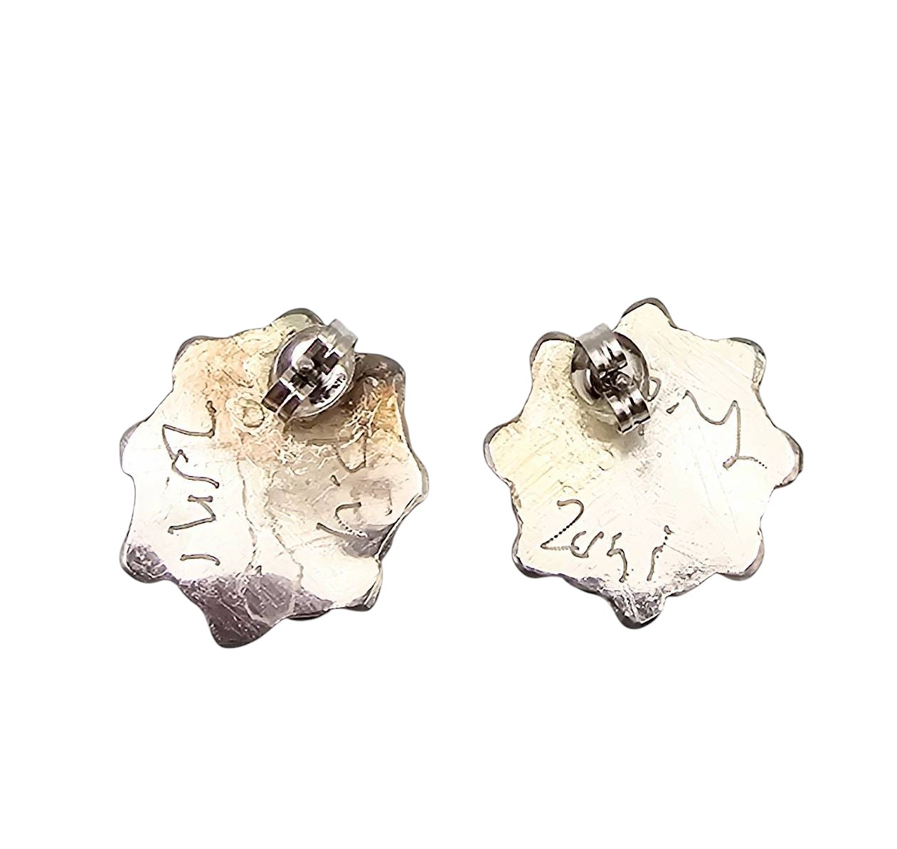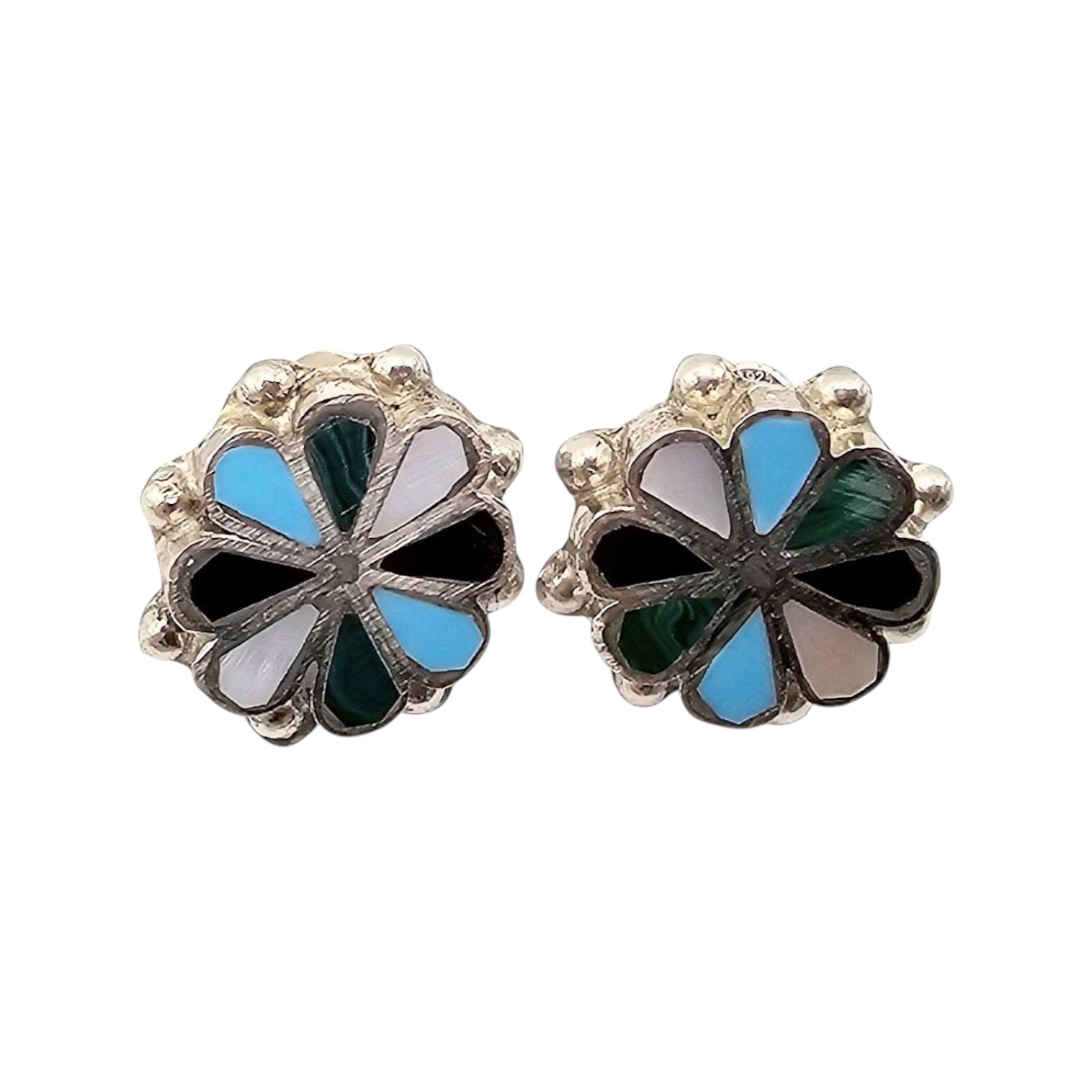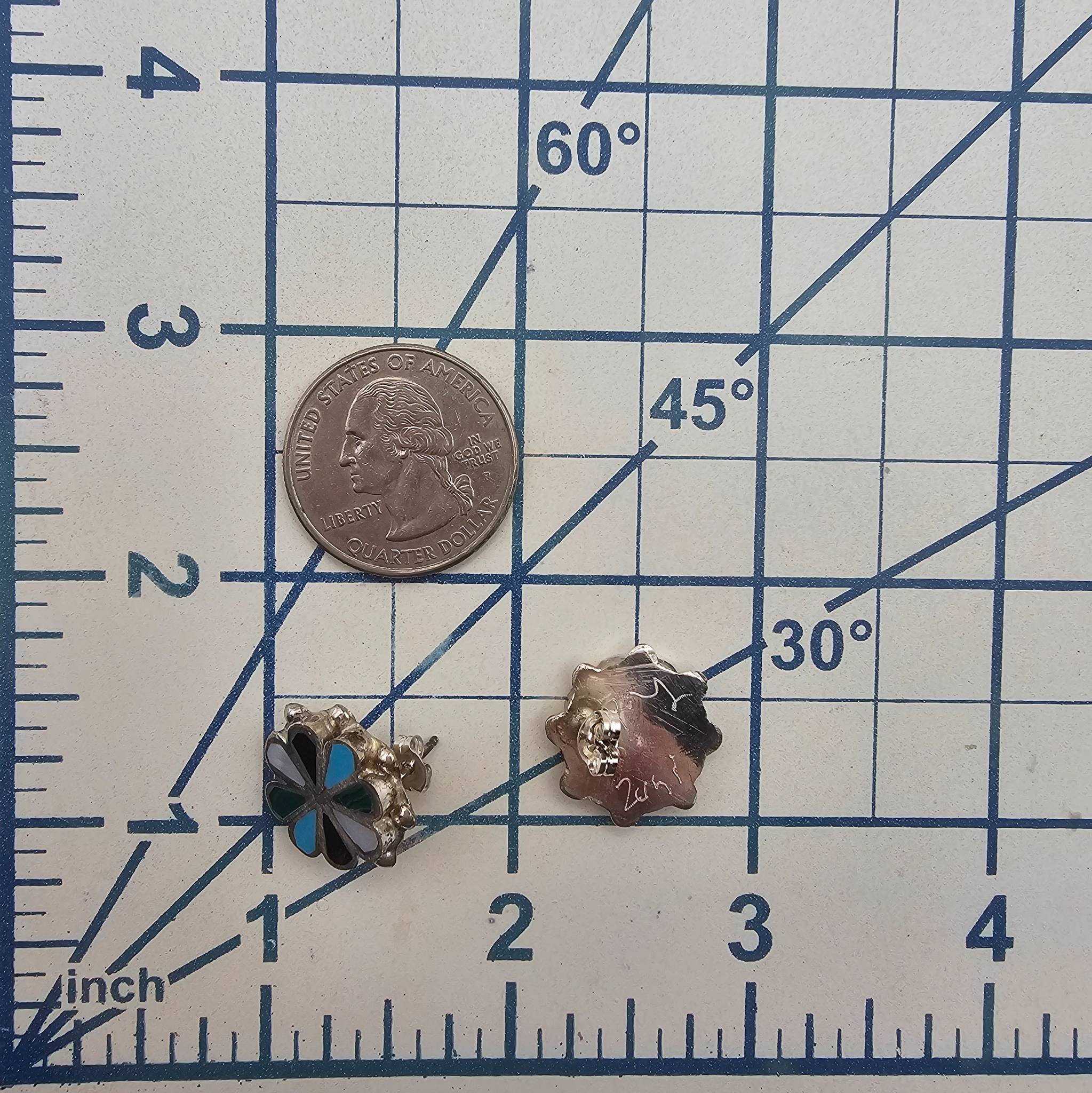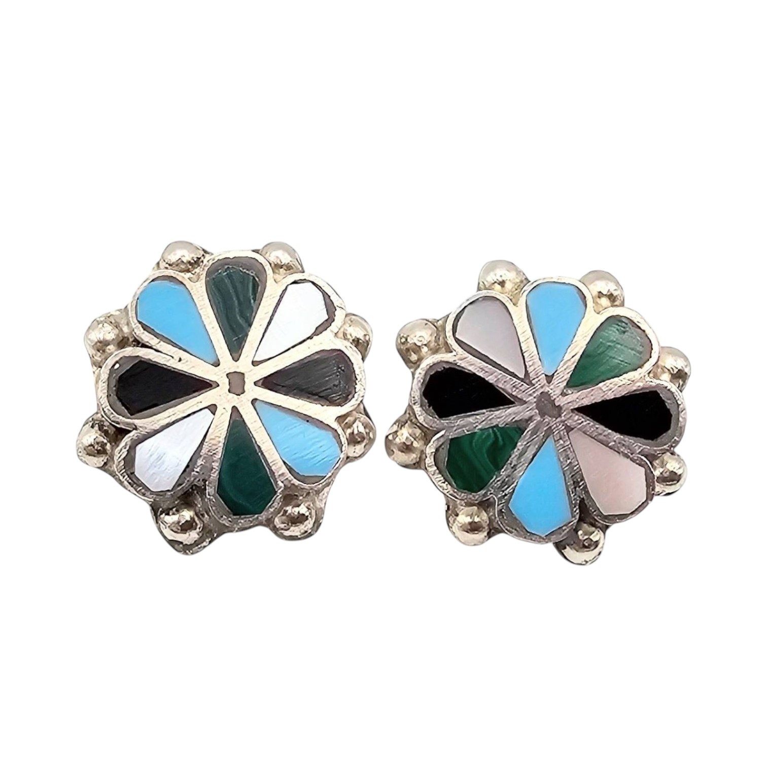Handmade Zuni earrings crafted by Carmichael Haloo. Composed of sterling silver and inlaid with multi-colored stones other of pearl,onyx,turquoise, and malachite. Weighs 6.4 grams in total. Signed ‘Zuni’ on the back. The earrings feature a flower-like design with post backs. Excellent craftsmanship.