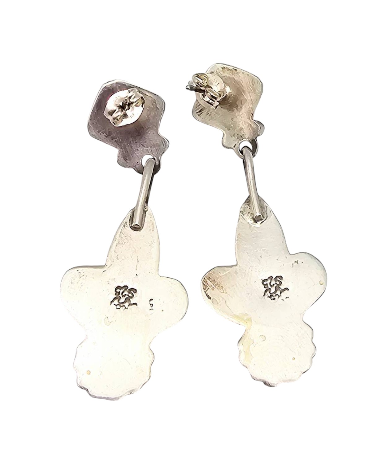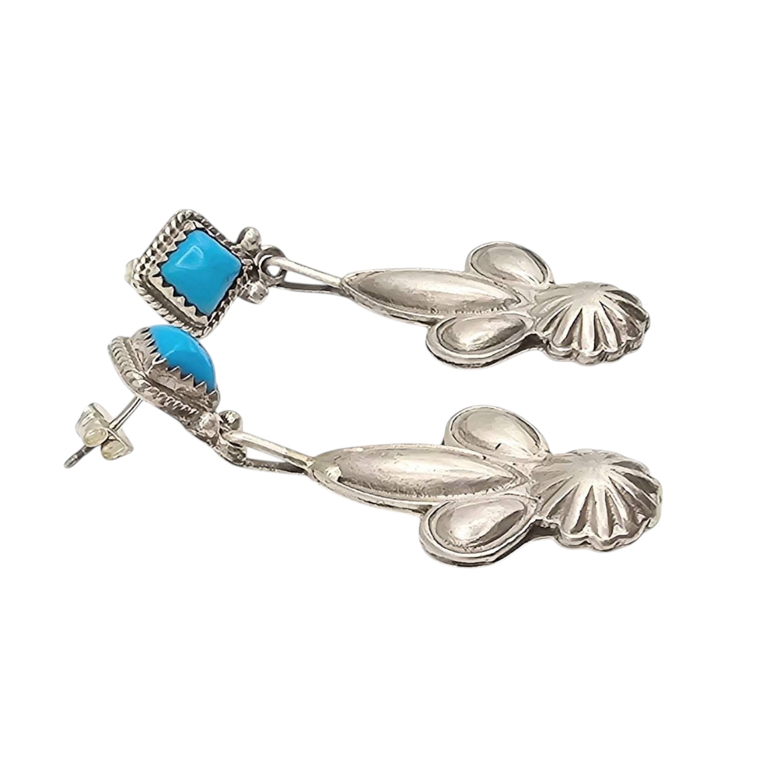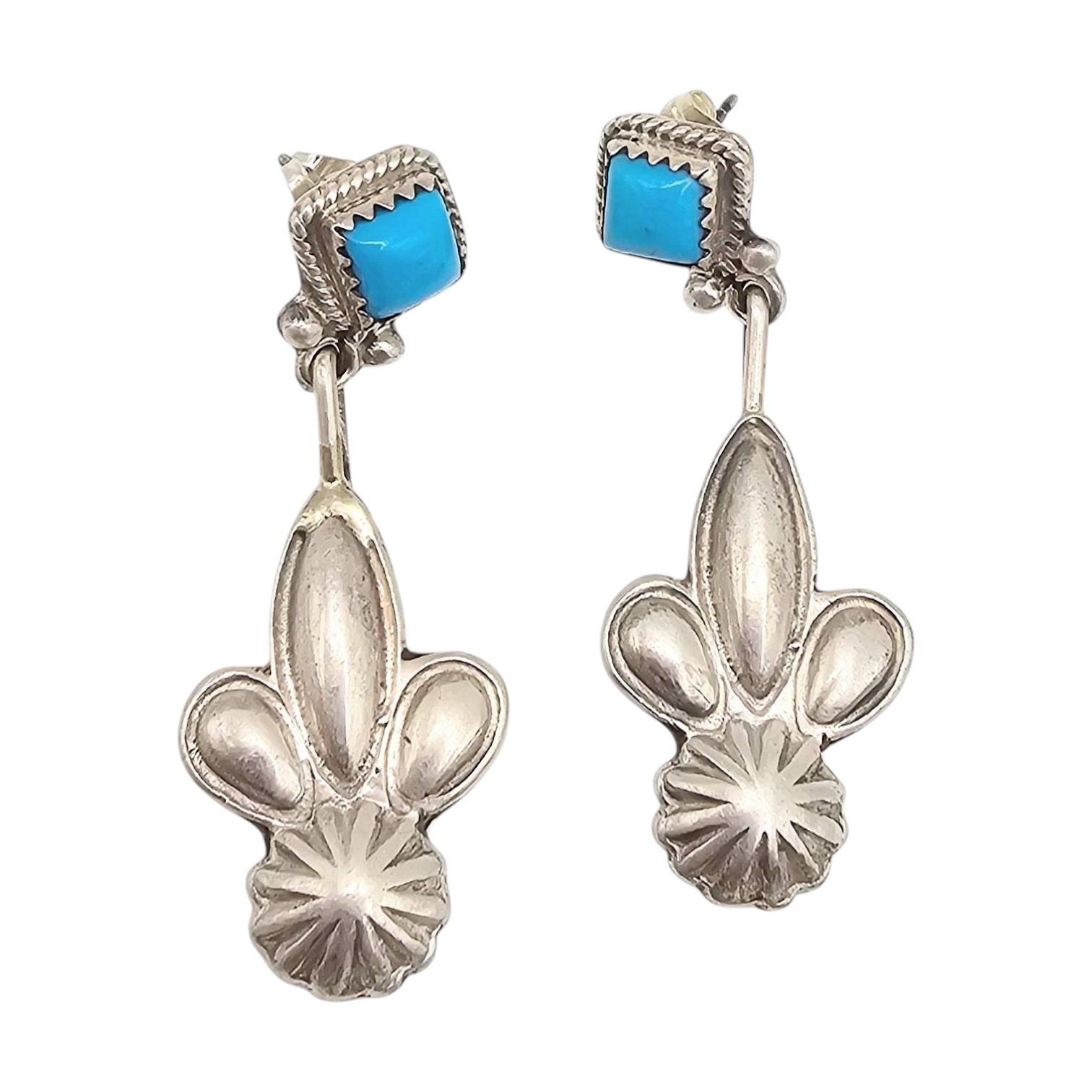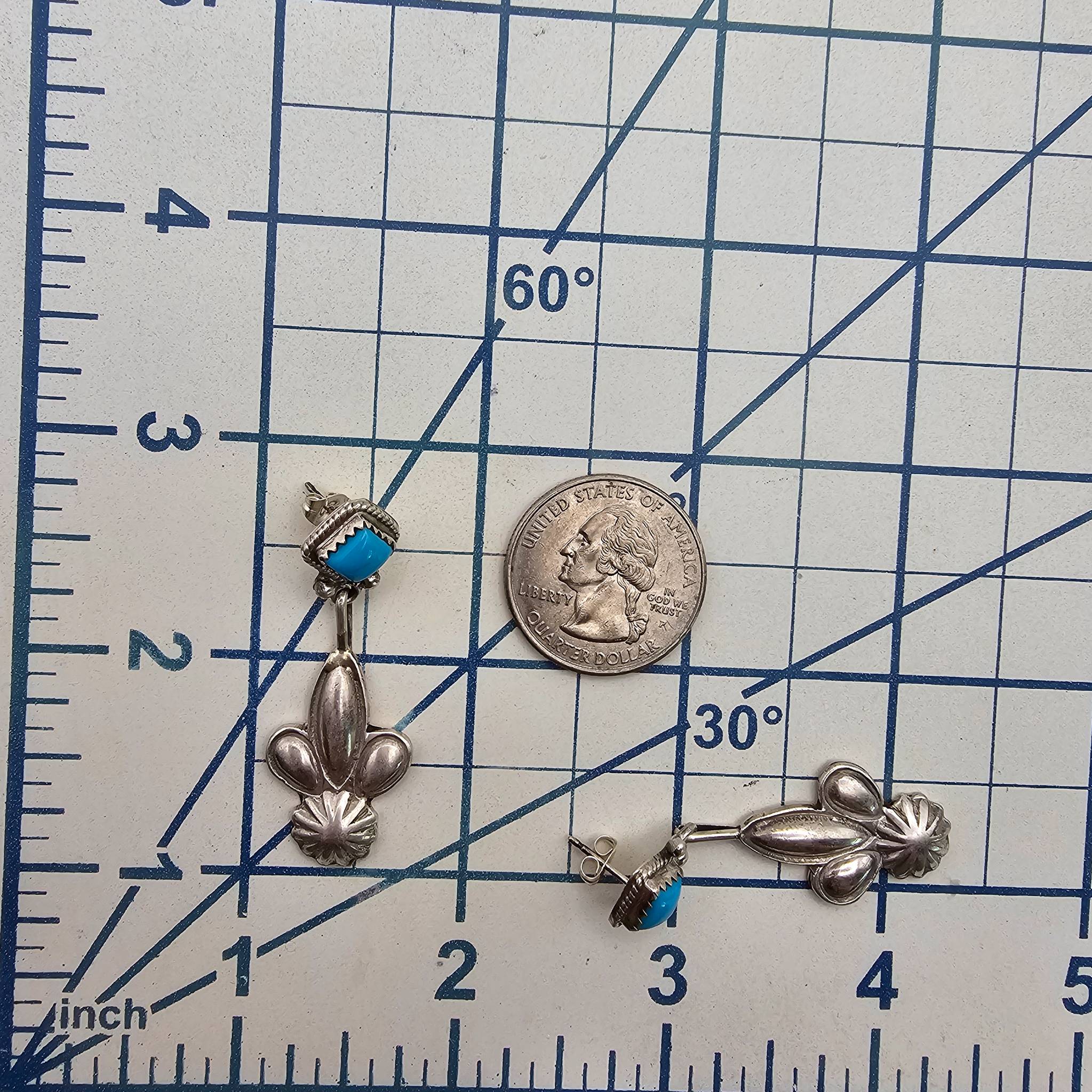 Navajo sterling silver drop earrings by Verley Betone featuring Kingman turquoise stones. The earrings weigh 9.8g combined. Each measures approximately 2 inches in length. The turquoise is set in a square bezel with intricate silver detailing at the bottom. Secure post-back closures.