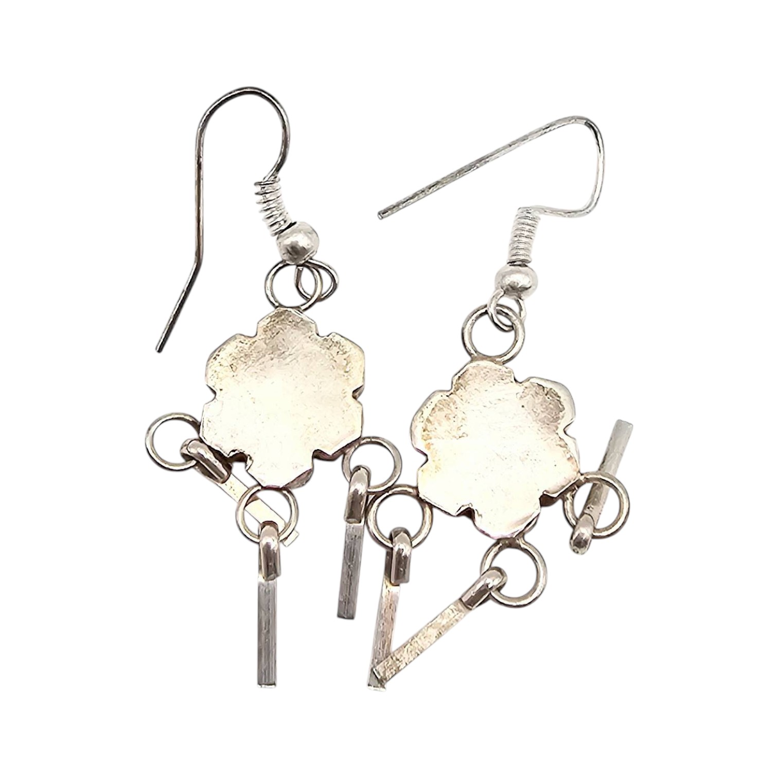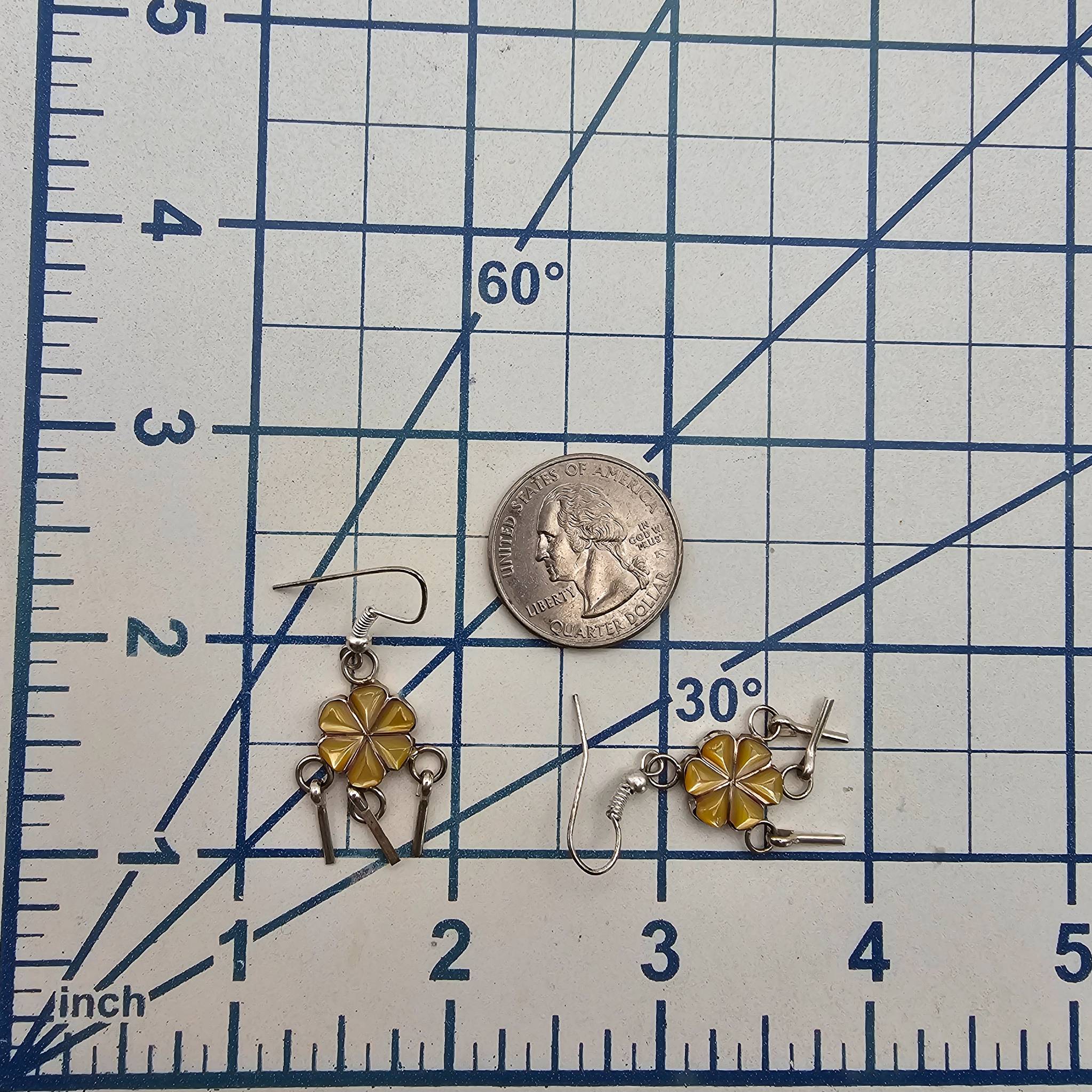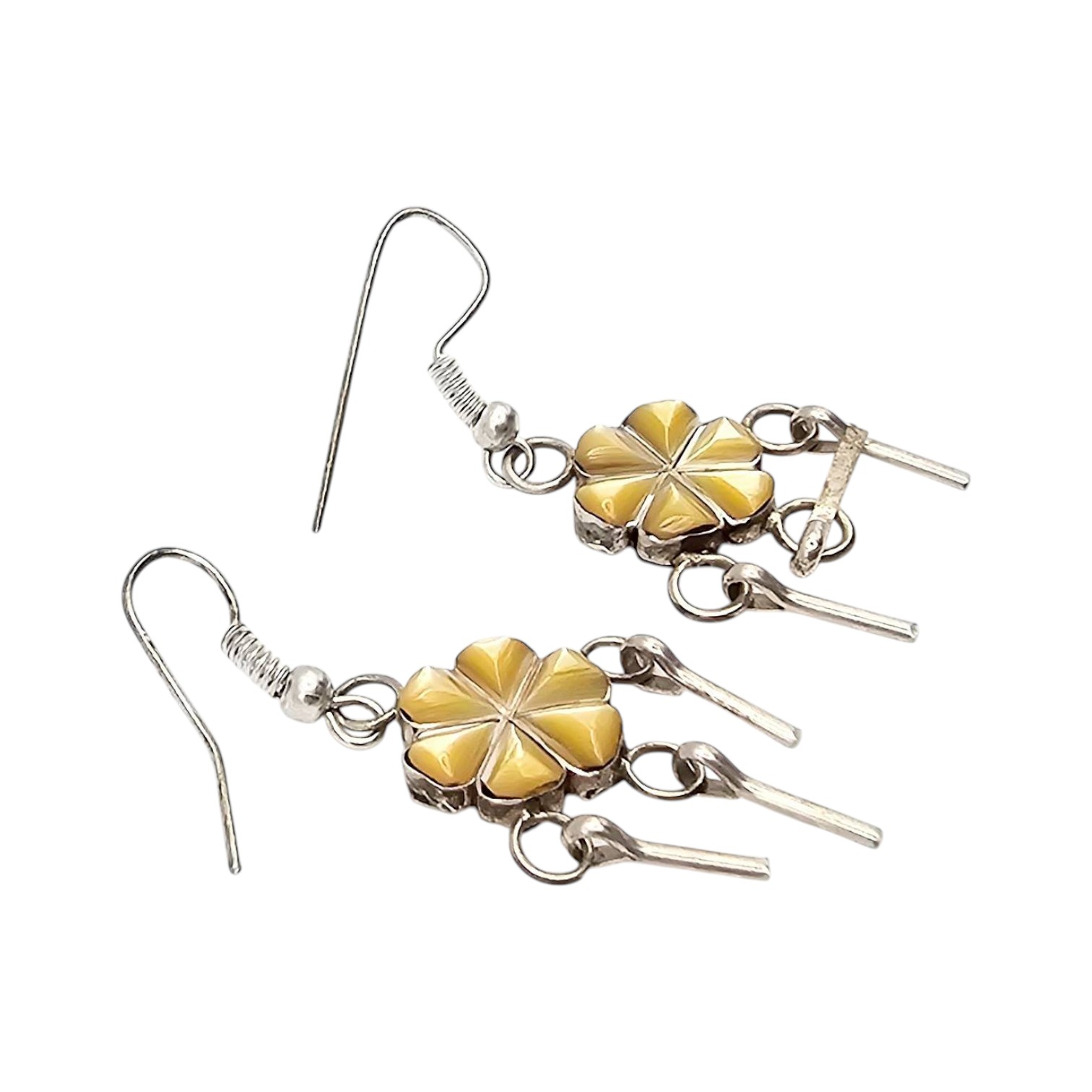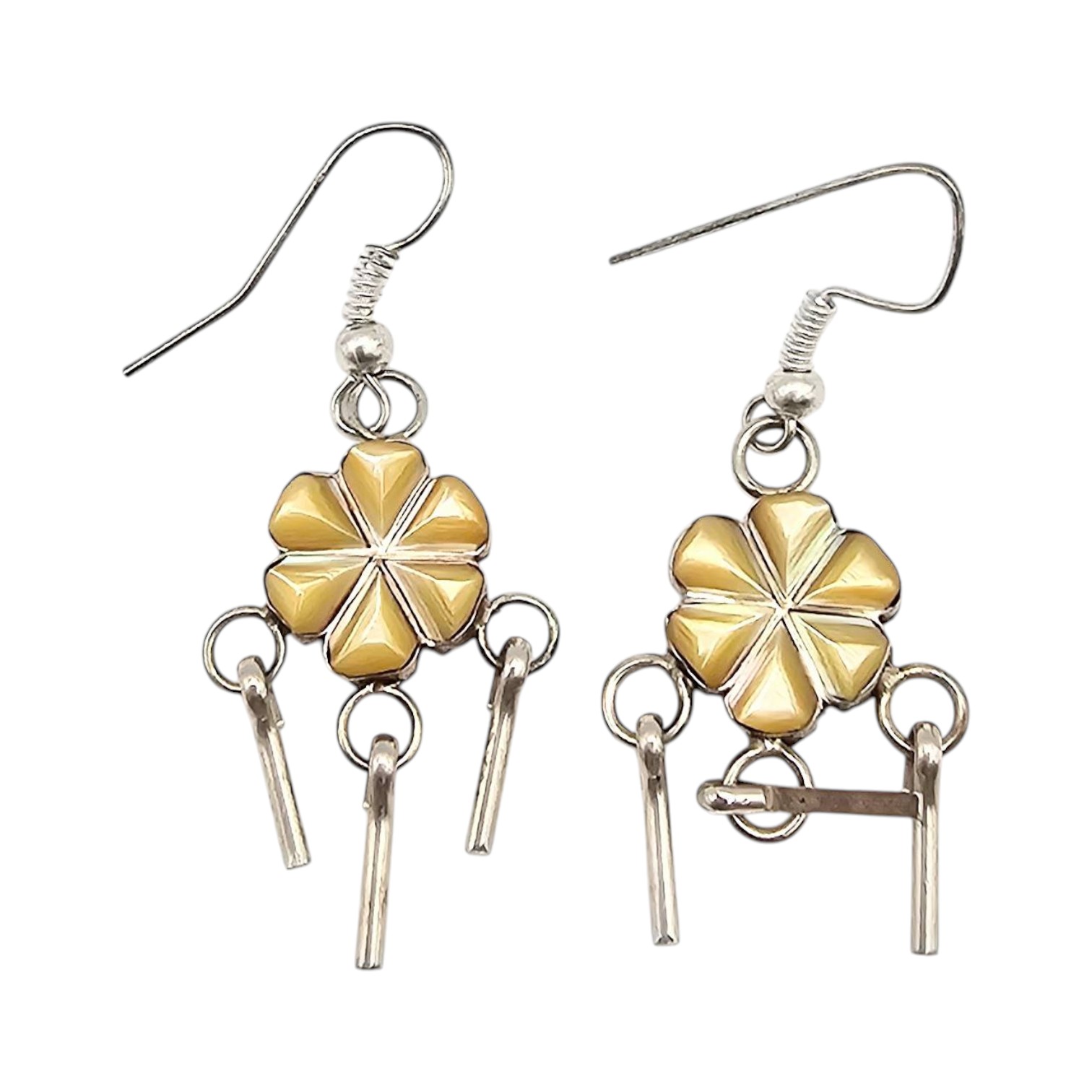 Handmade sterling silver earrings crafted by Pauline Lonjose, a Zuni artisan. Each earring features a yellow flower design with three dangling silver accents. Weighing approximately 3.4 grams total, they measure roughly 1.5 inches in length. The earrings are marked as Zuni handmade and made from sterling silver.