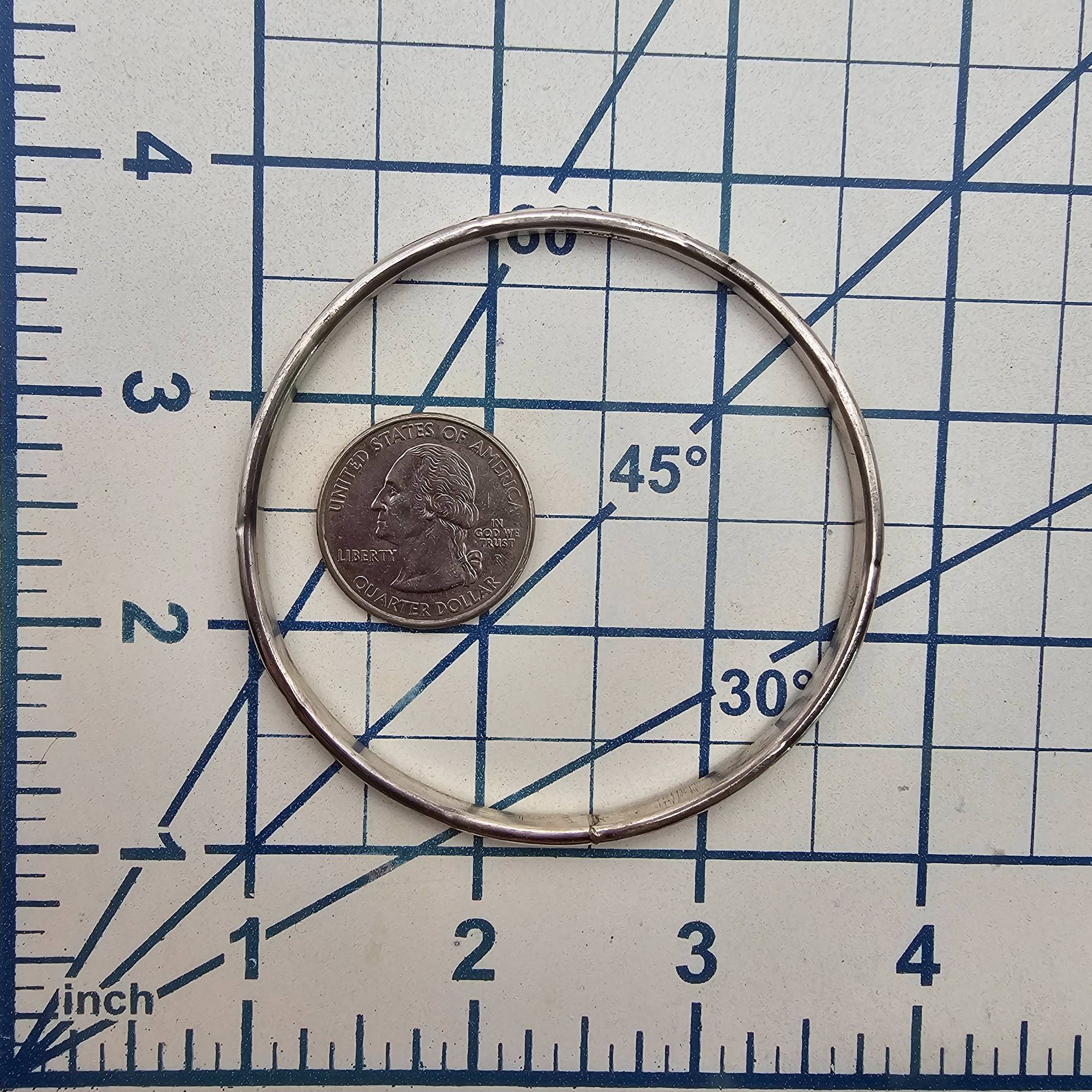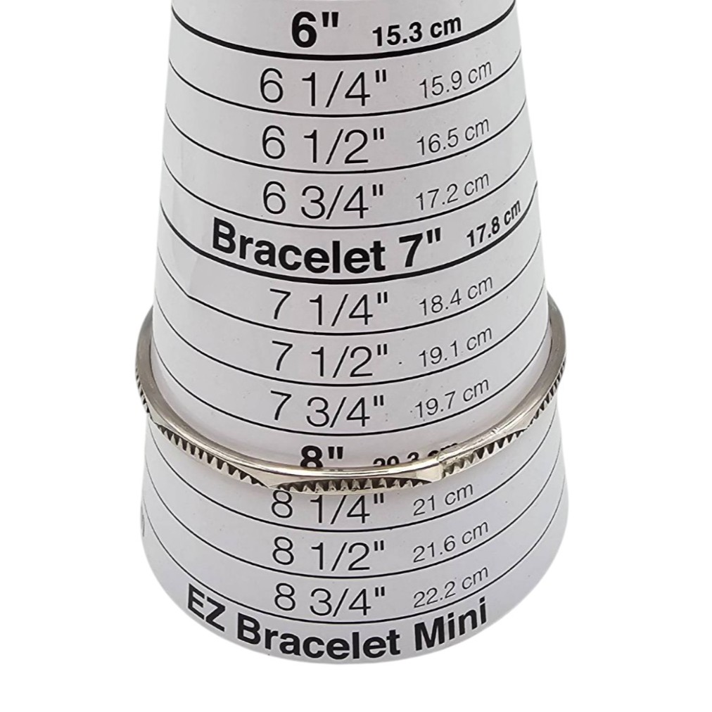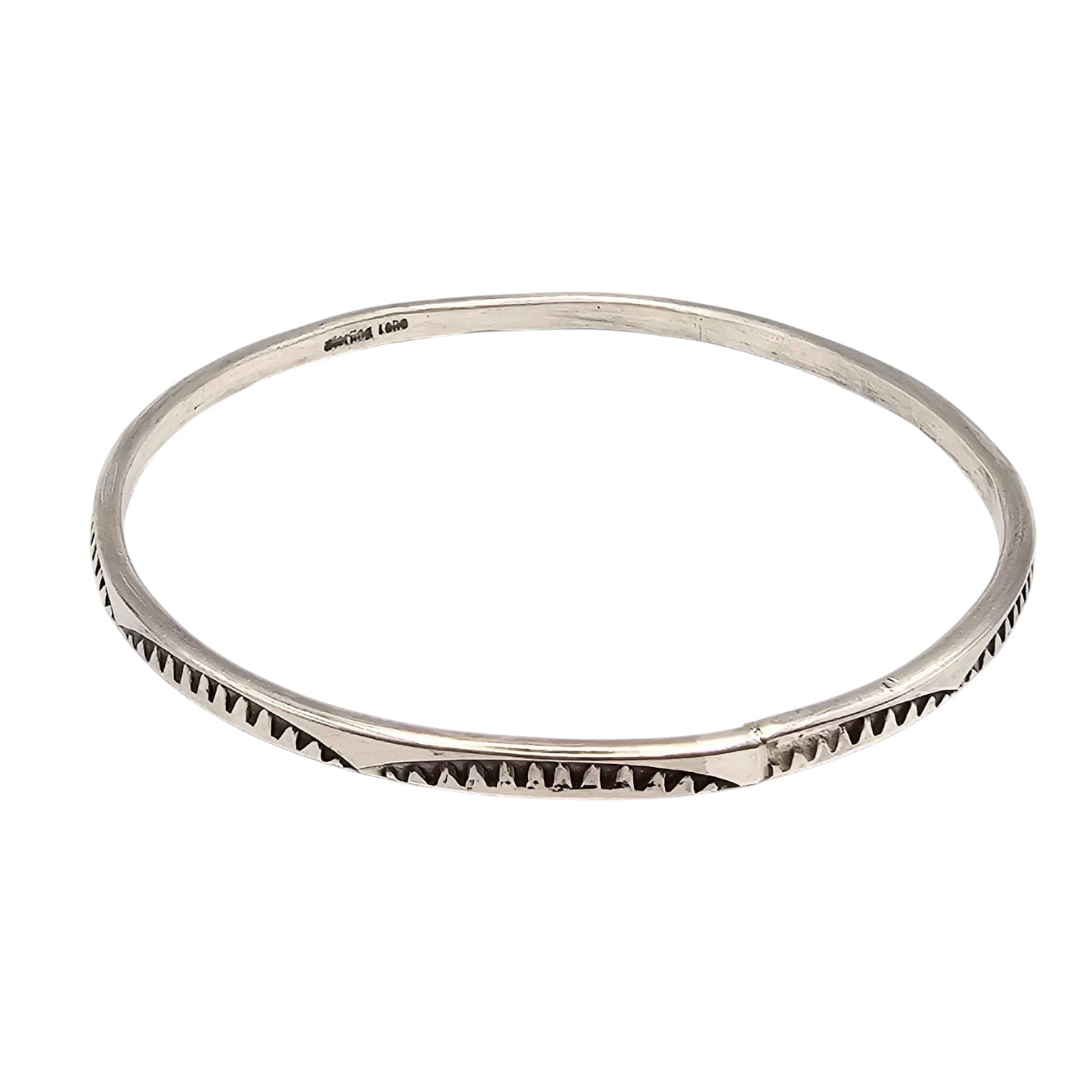 Sterling silver bangle bracelet handcrafted by Navajo artisan Blaine Tahe. The bracelet features a stamped pattern design and measures approximately 7 inches in inner circumference. It weighs 16.5 grams and is stamped with the artist’s hallmark, ‘Blaine Tahe.’