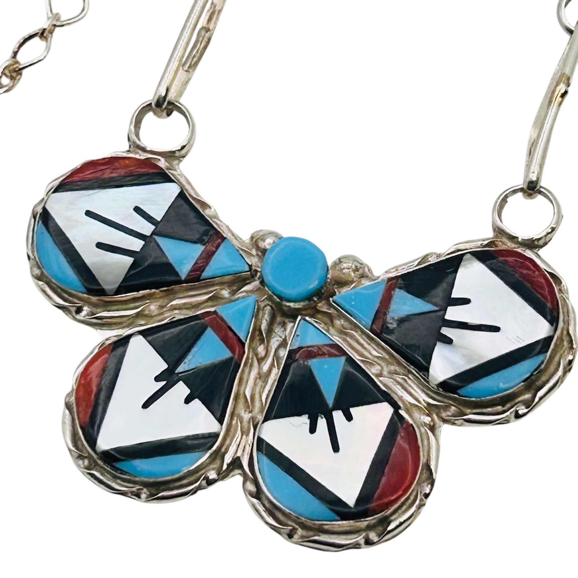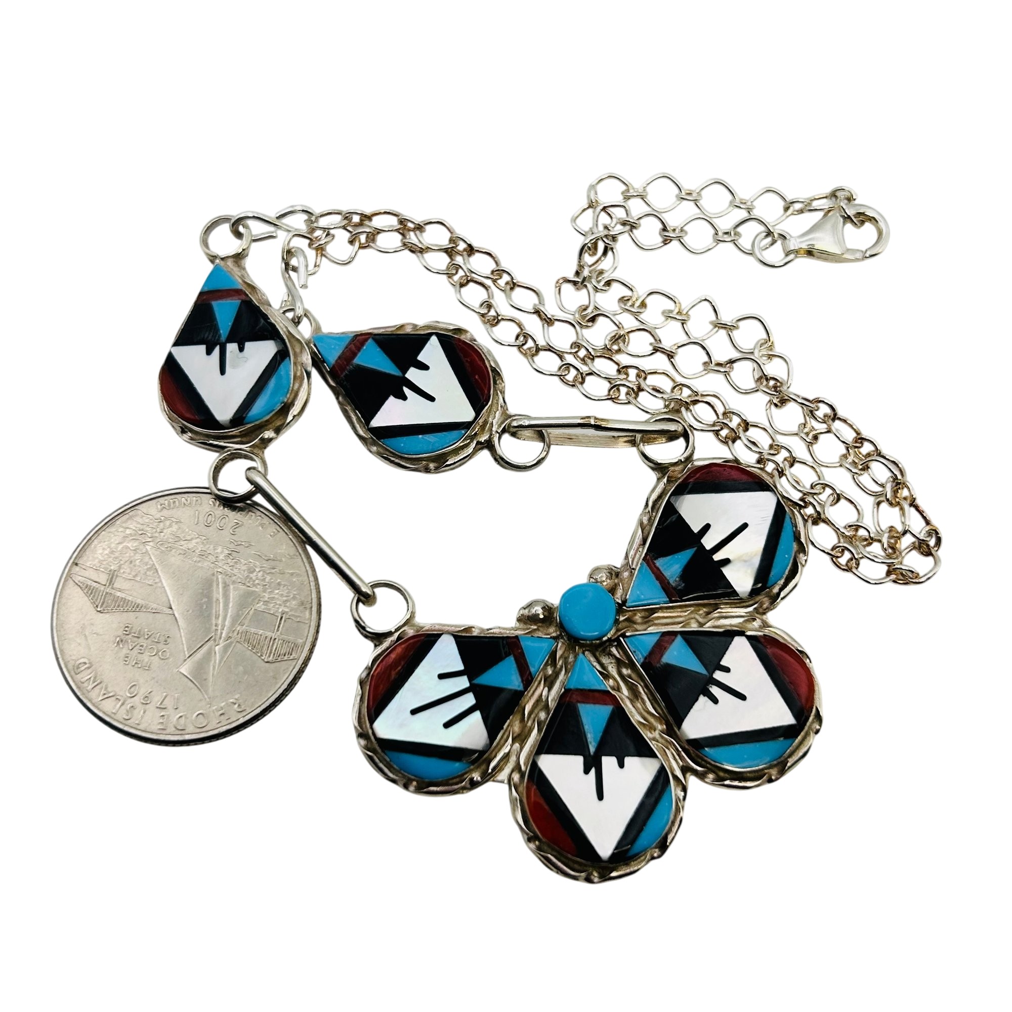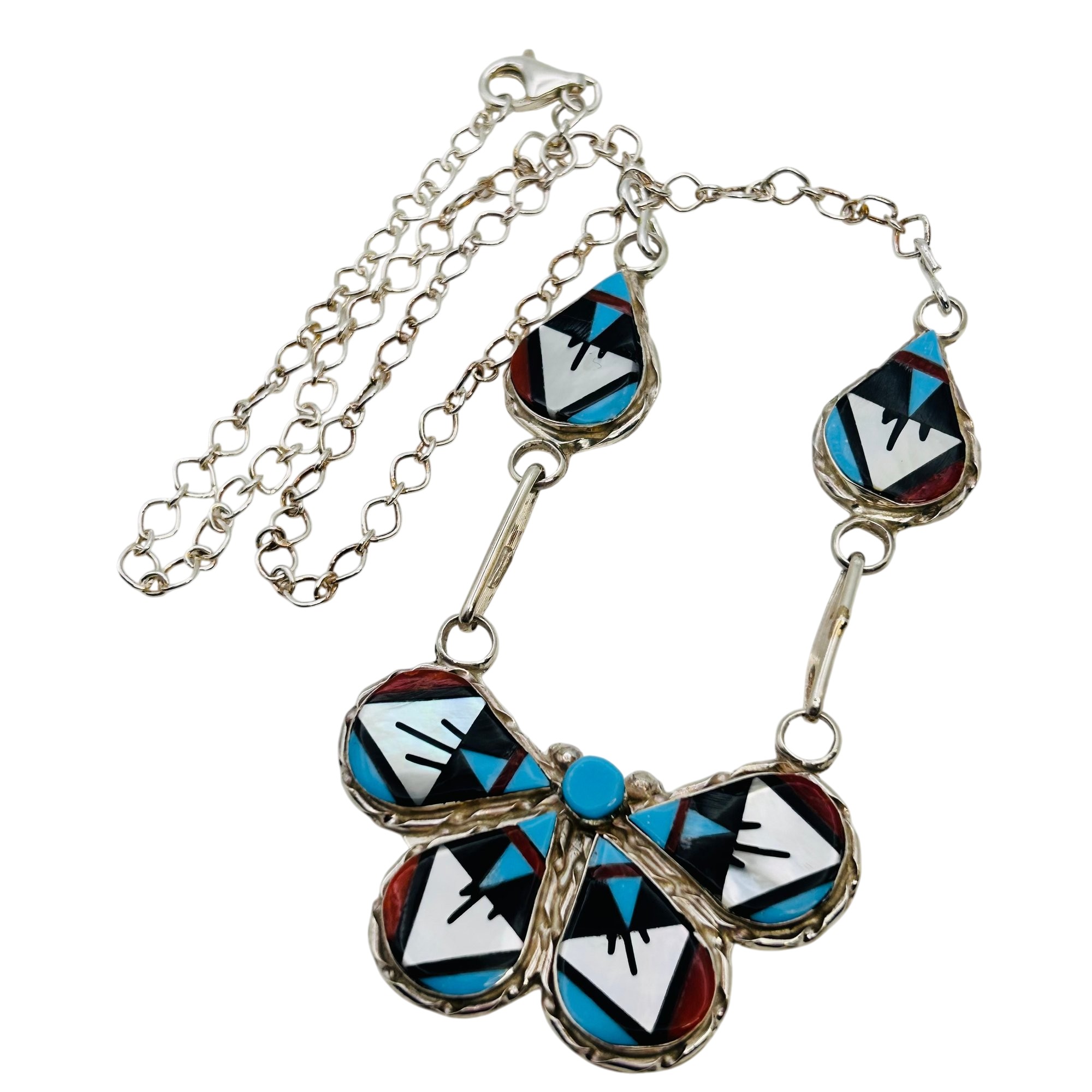 Carol Niha Zuni Sterling tear drop inlay mother of pearl onyx turquoise and coral Necklace 18 inch 18.64 grams.