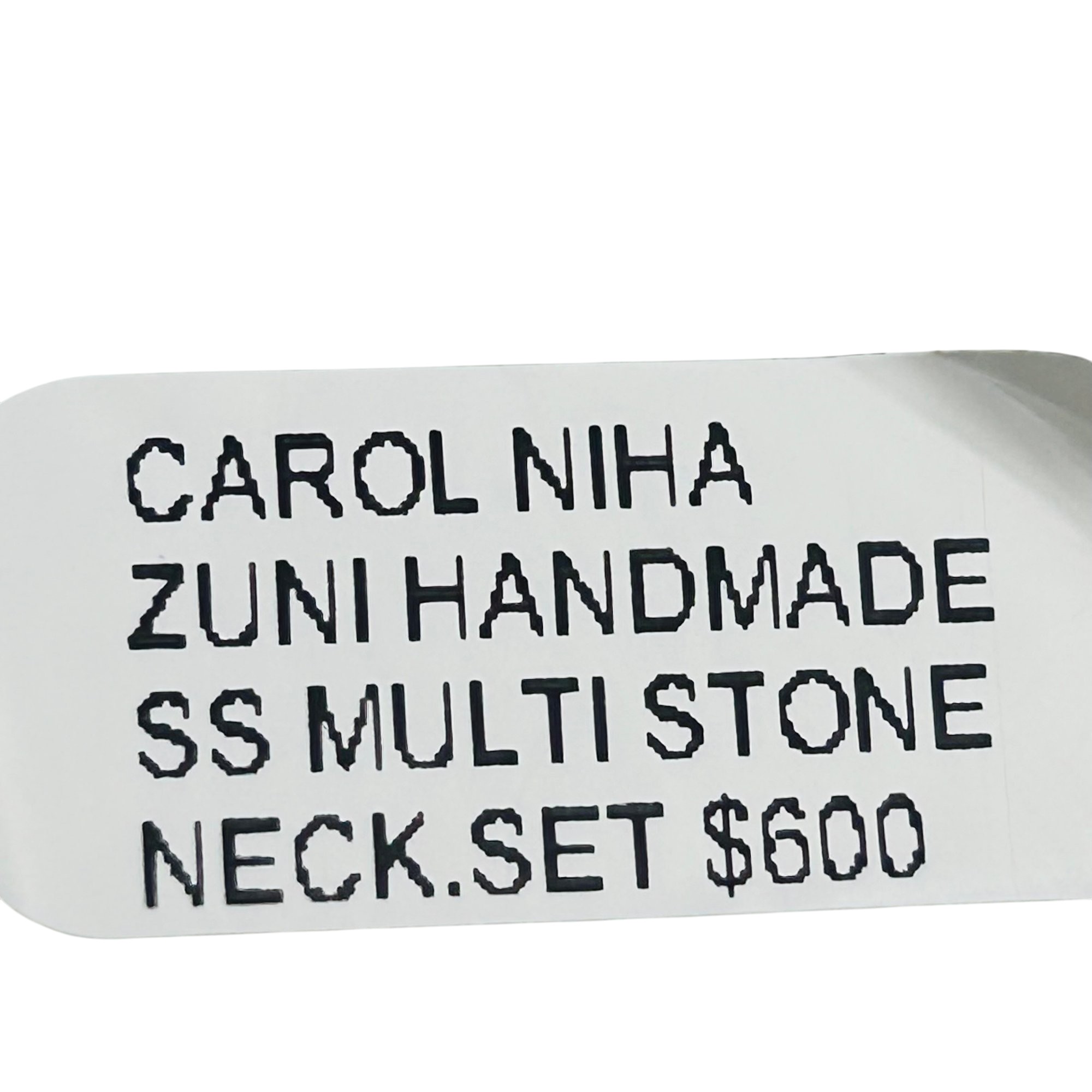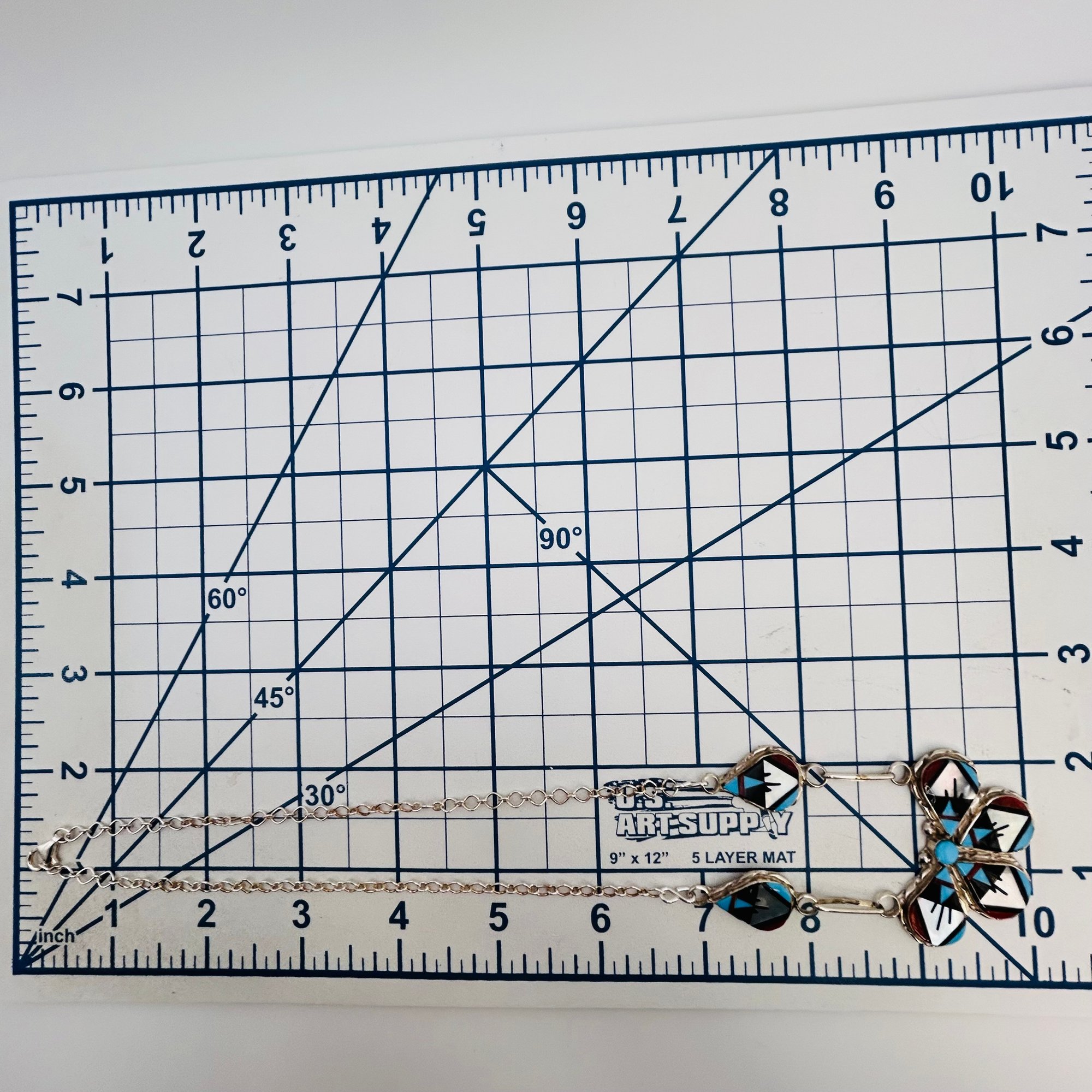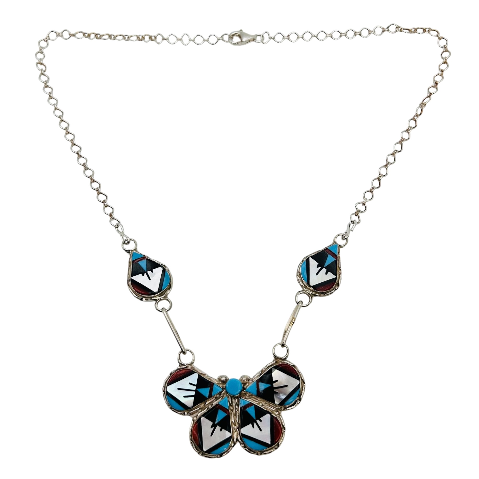 Carol Niha Zuni Sterling tear drop inlay mother of pearl onyx turquoise and coral Necklace 18 inch 18.64 grams.