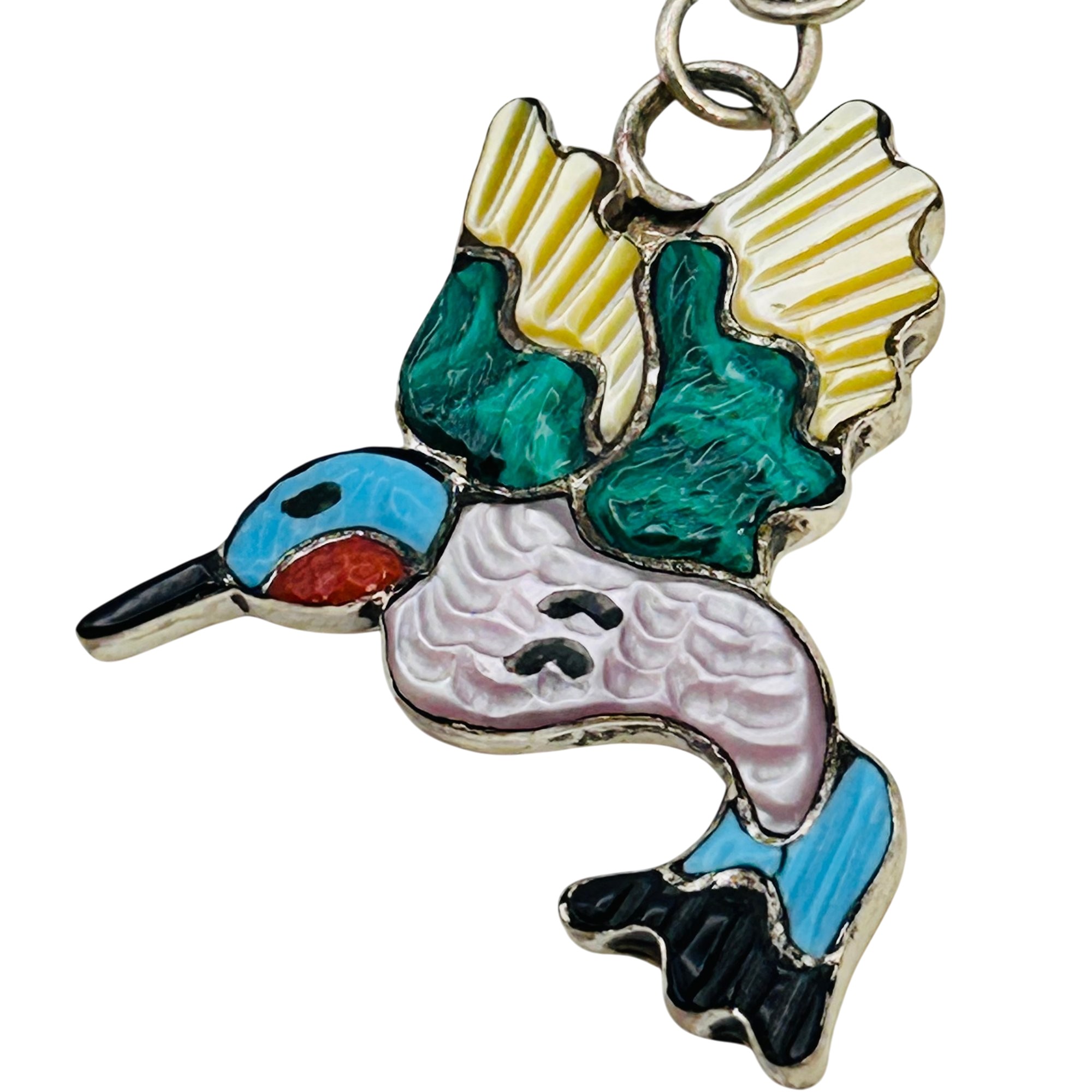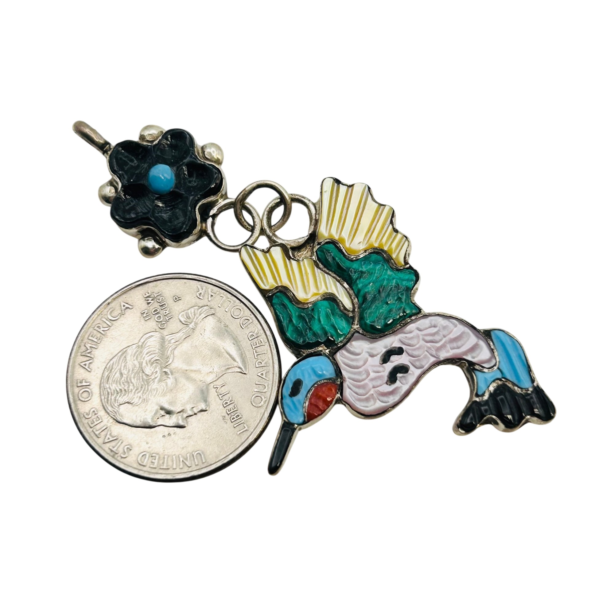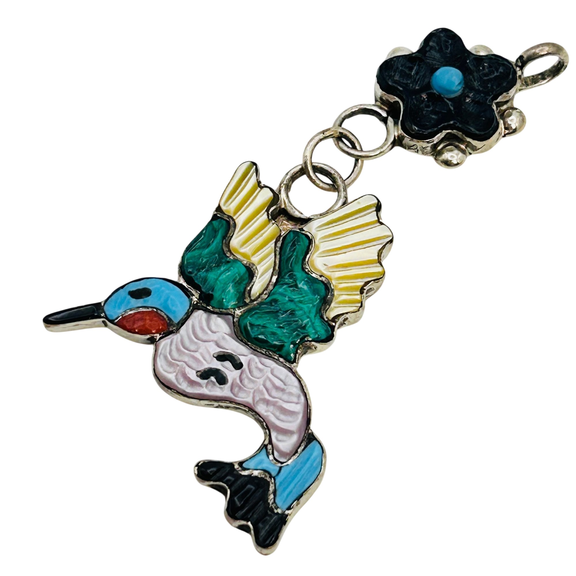 Tamara Pinto Zuni Sterling Multi Color turquoise onyx malachite coral mother of pearl hummingbird and flower Pendant 6.95 grams