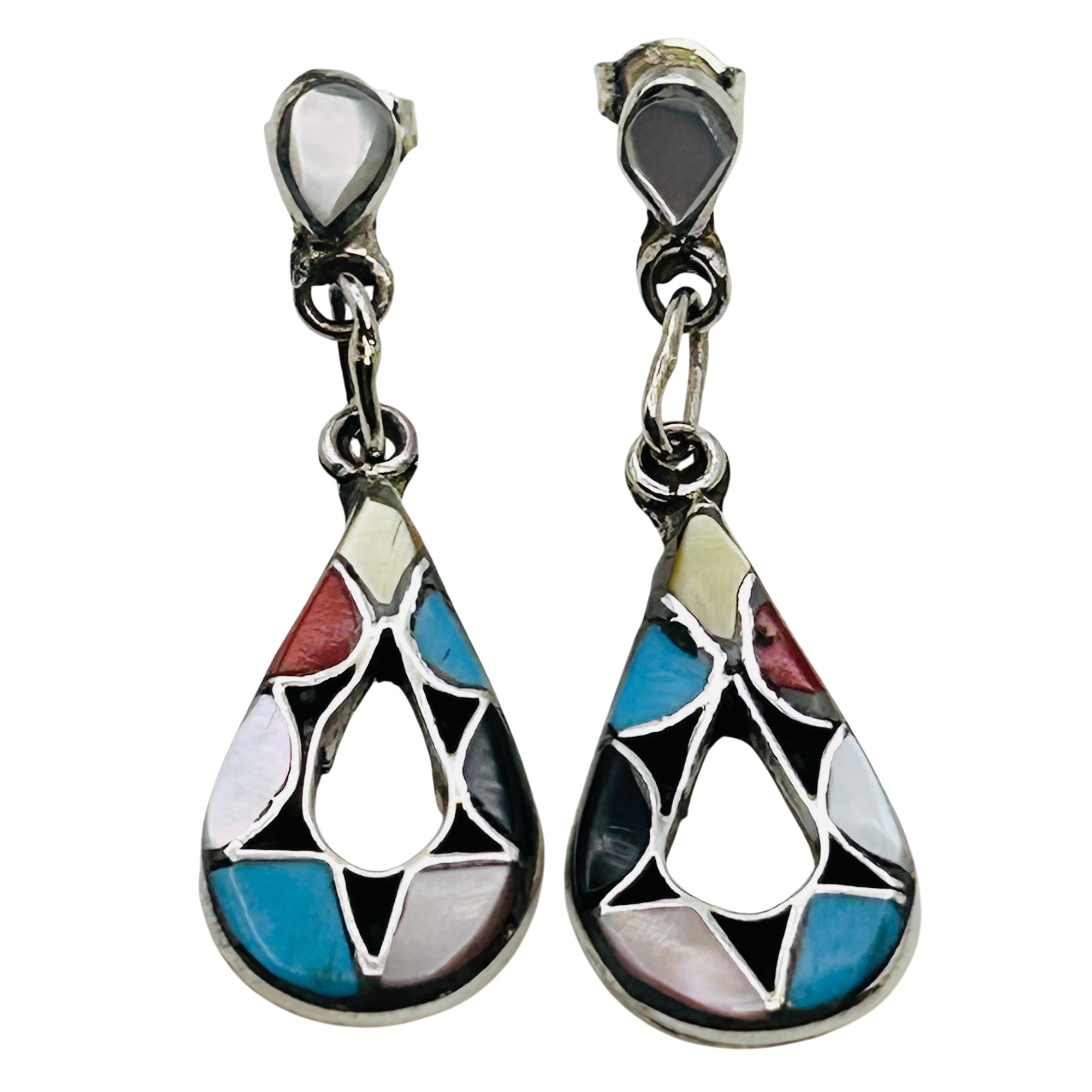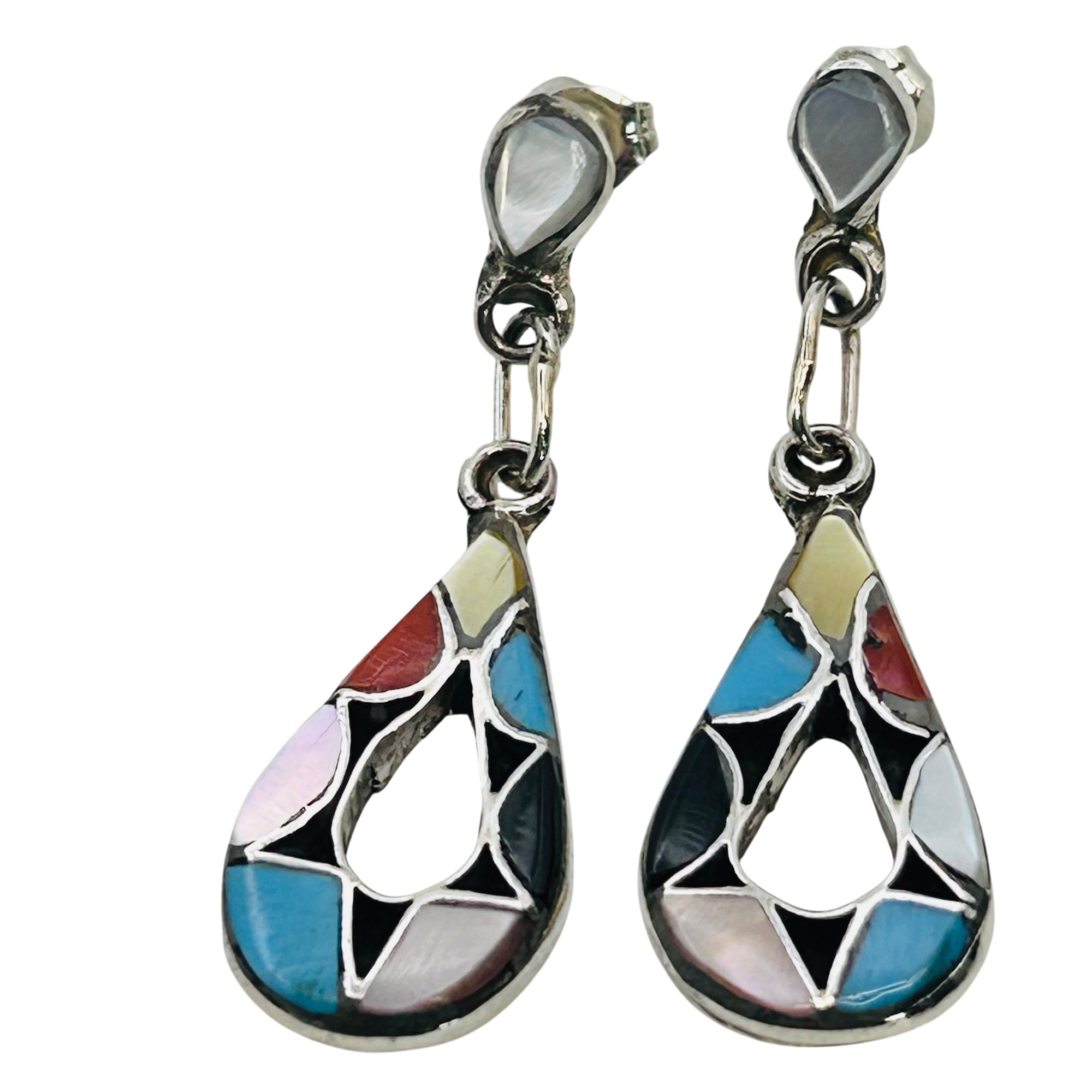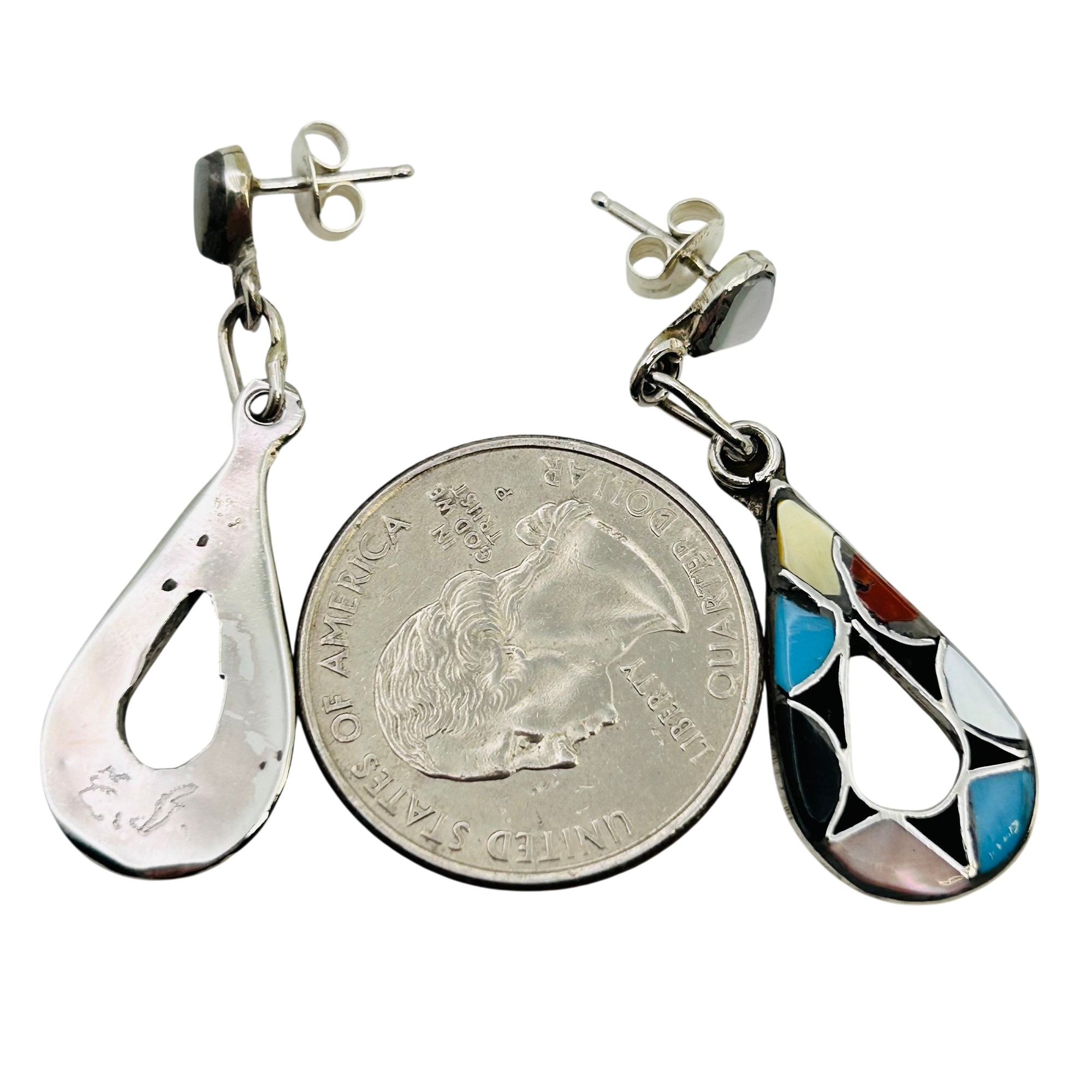 Emma Bowakaty Zuni Sterling Multi Stone mother of pearl turquoise coral onyx pushback dangle Earring 4.34 grams