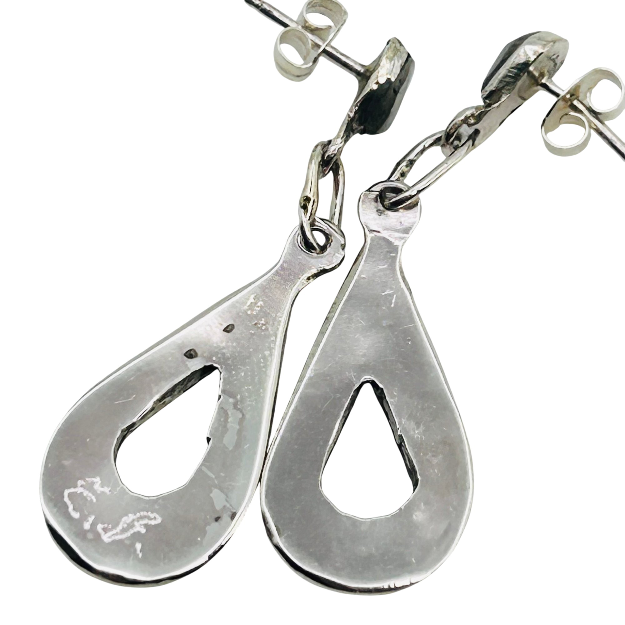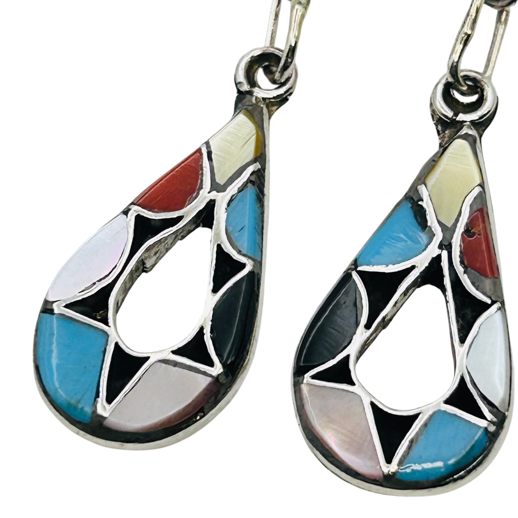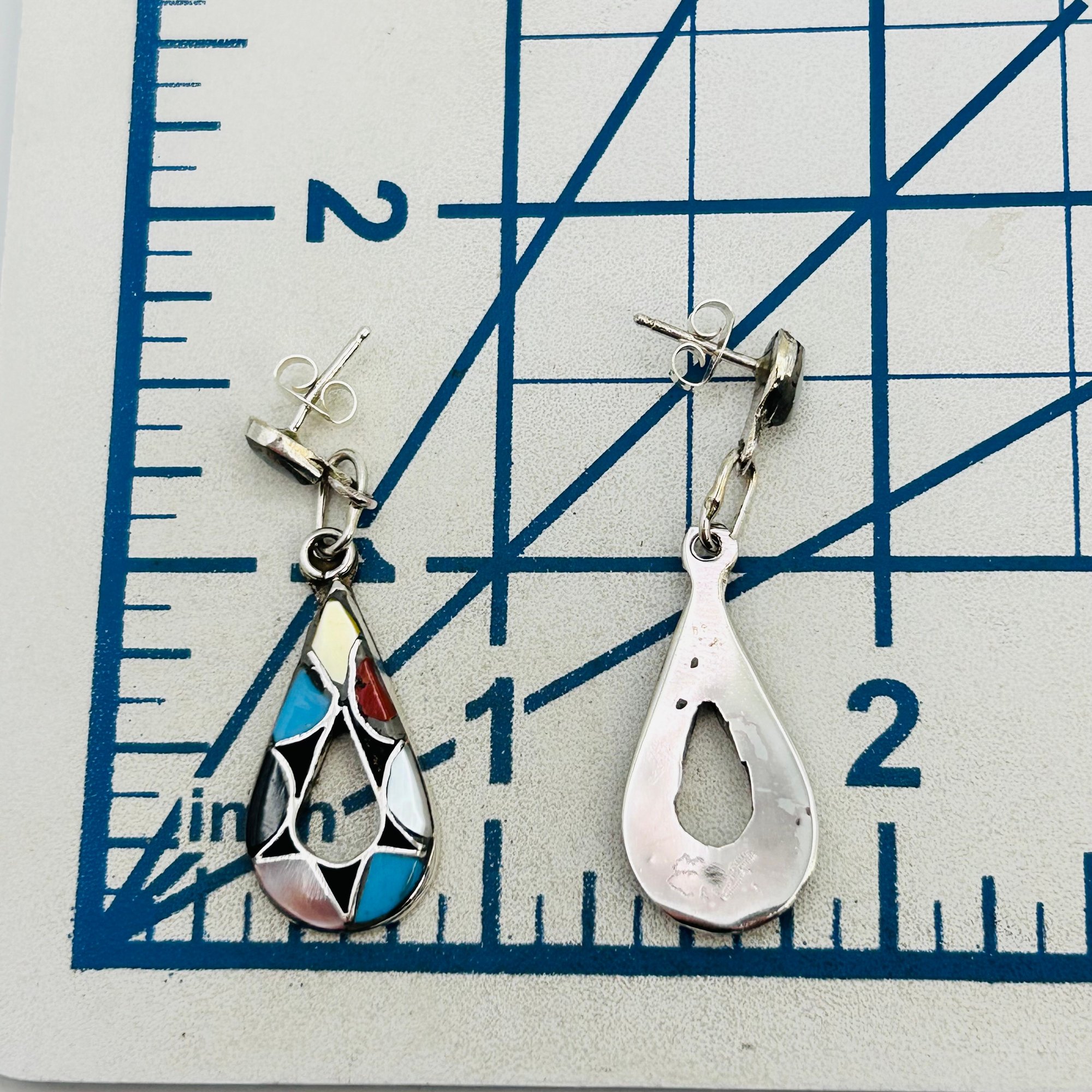 Emma Bowakaty Zuni Sterling Multi Stone mother of pearl turquoise coral onyx pushback dangle Earring 4.34 grams