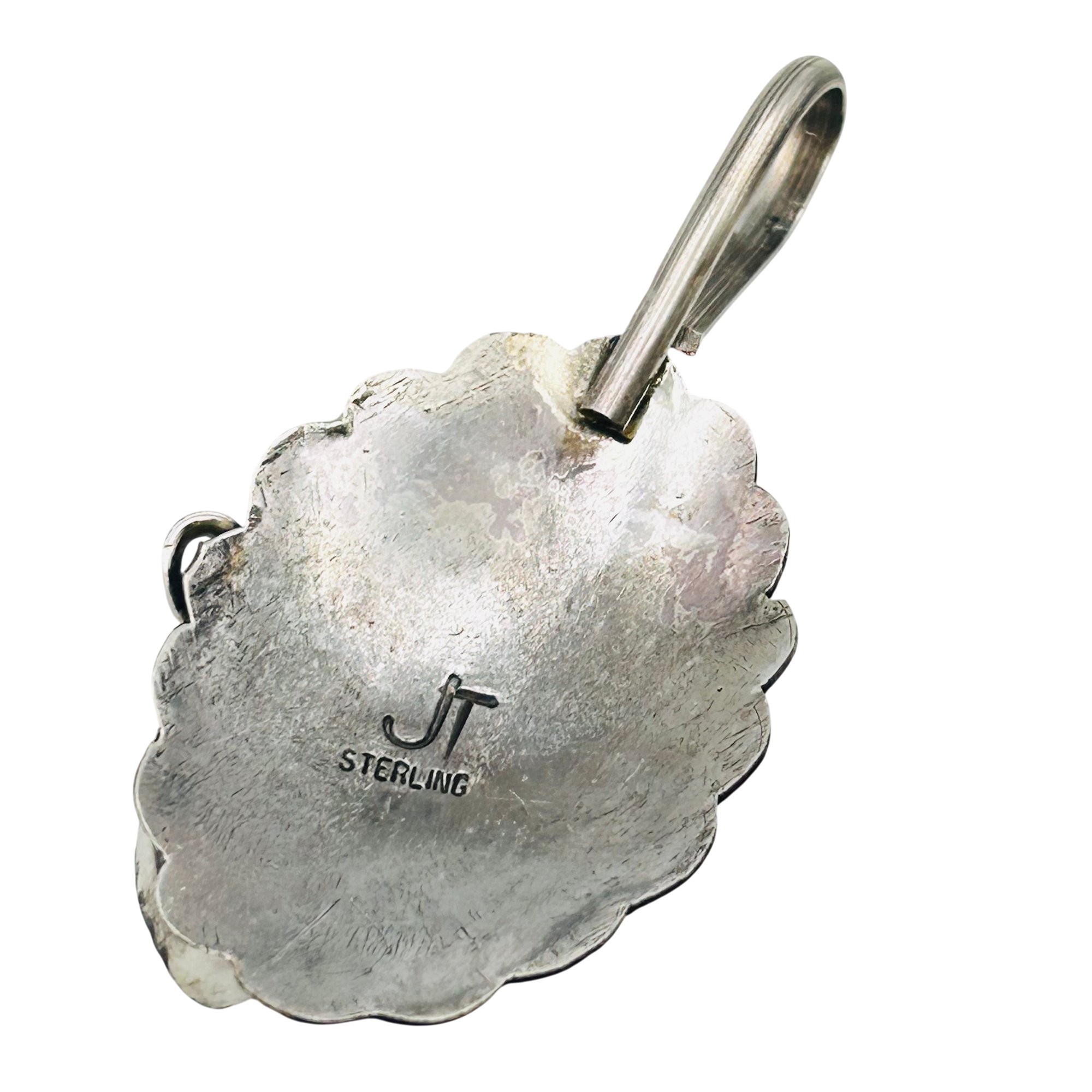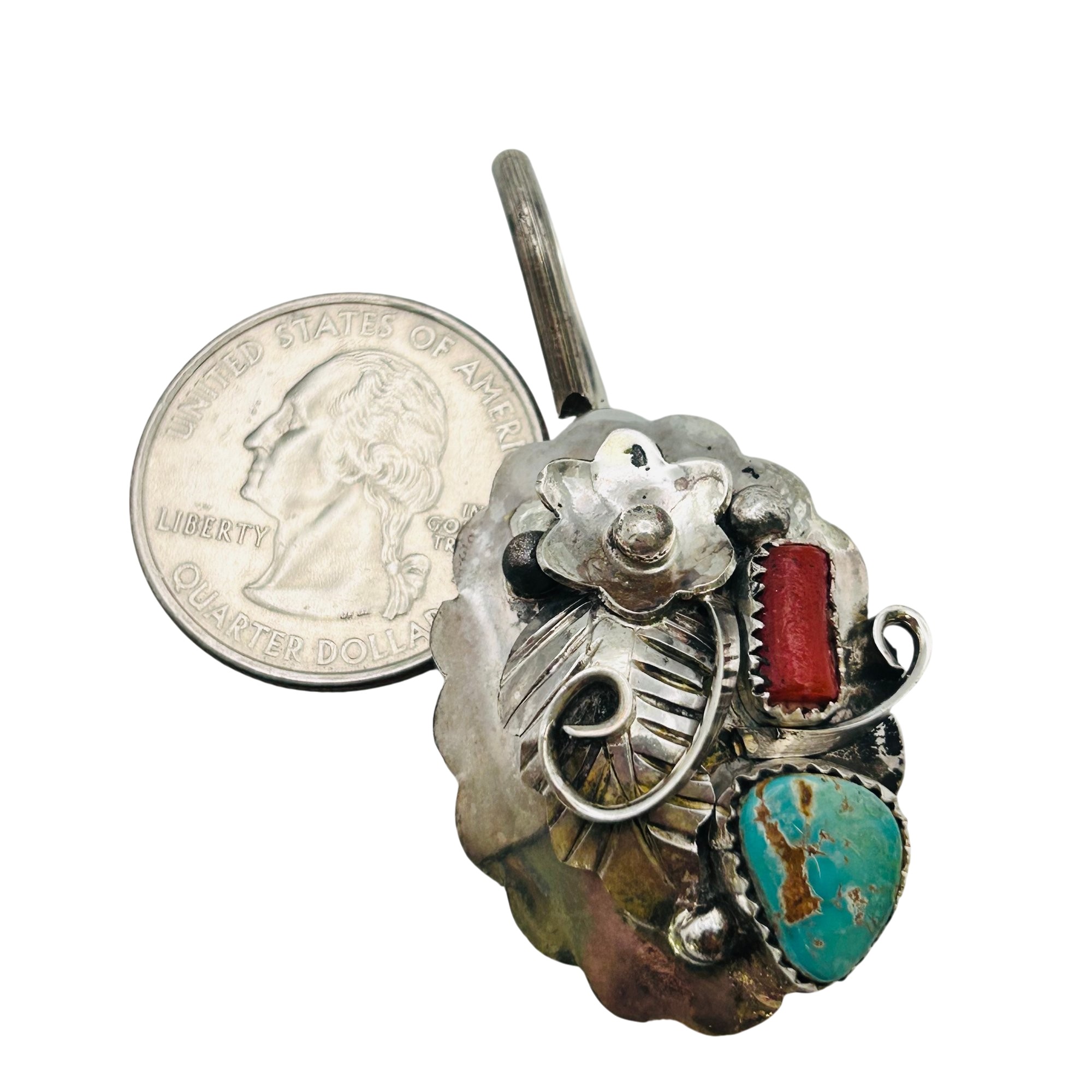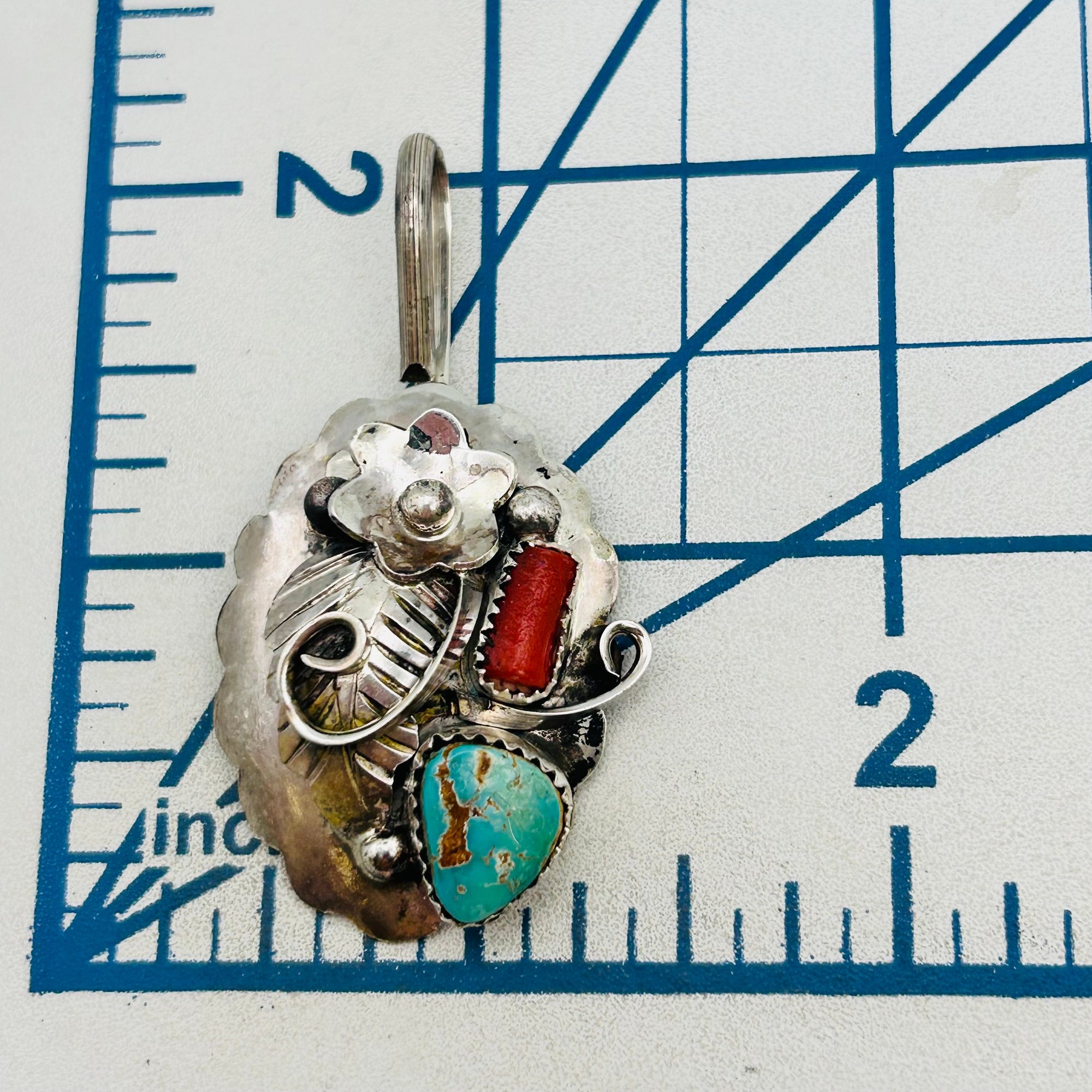 Jerry Thompson Navajo Sterling Turquoise Coral flower and leaf detail Pendant 8.03 grams
