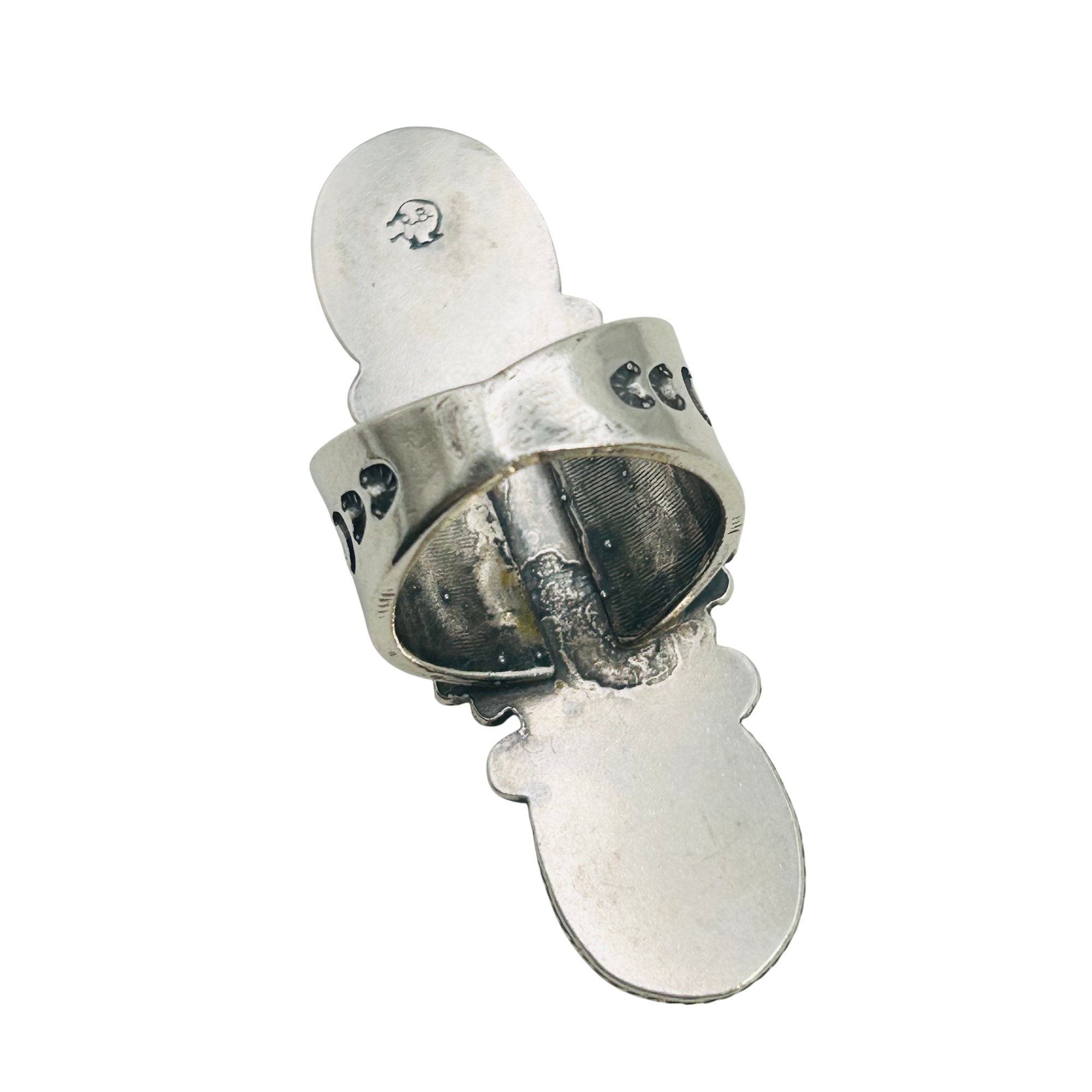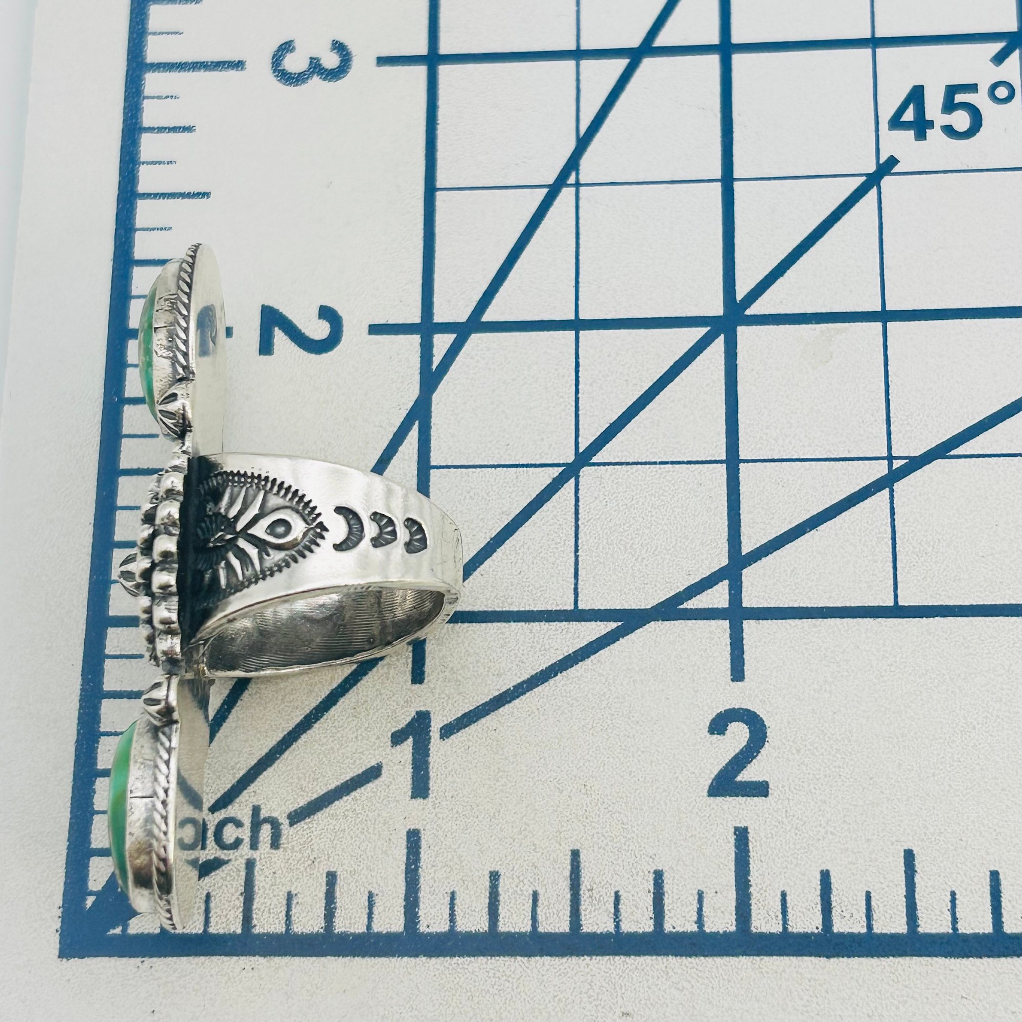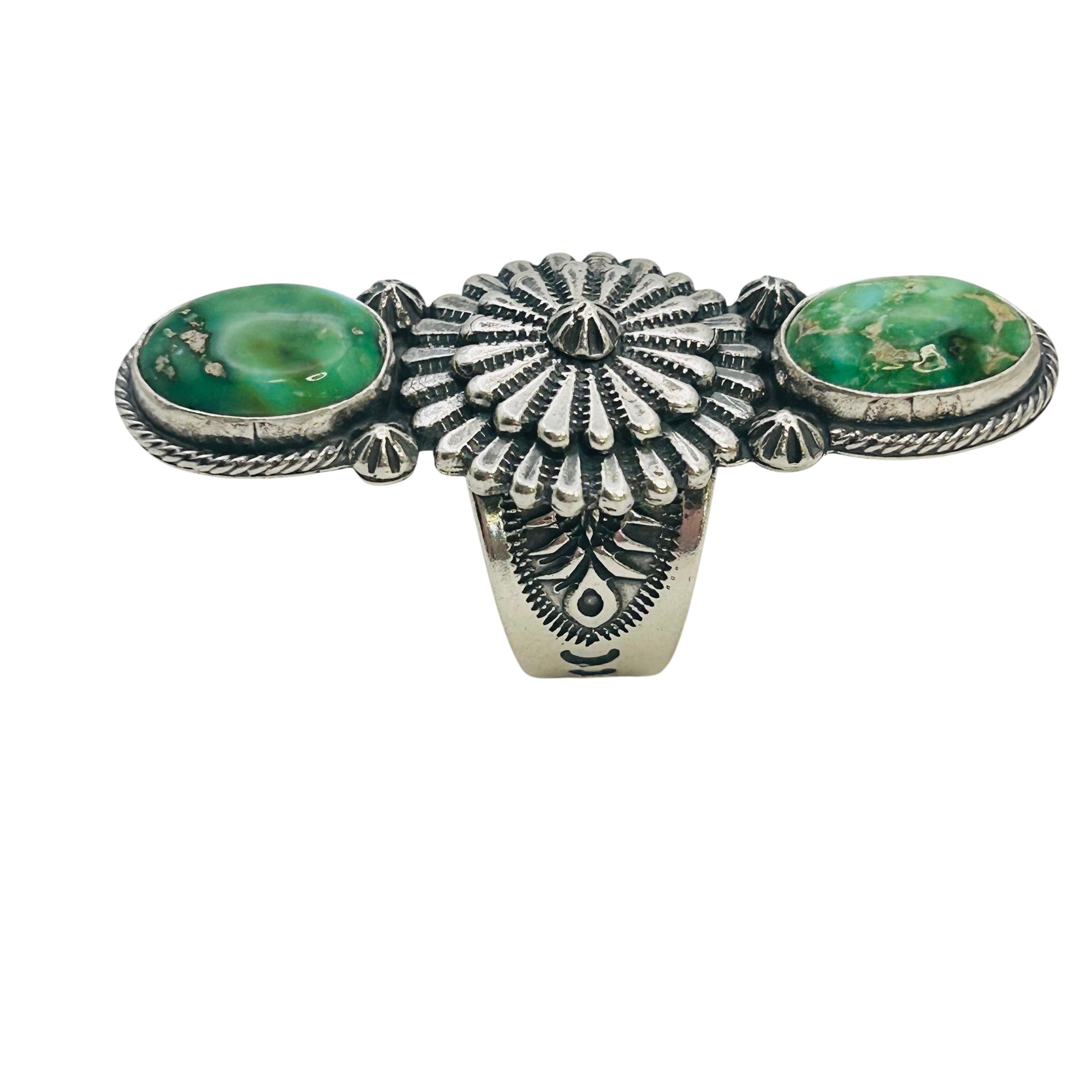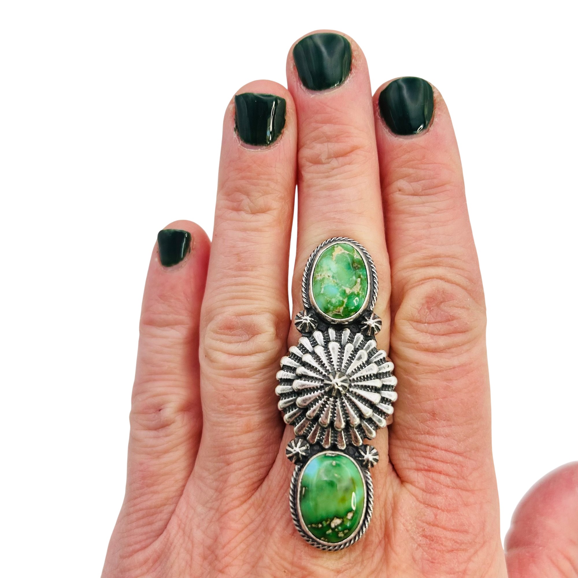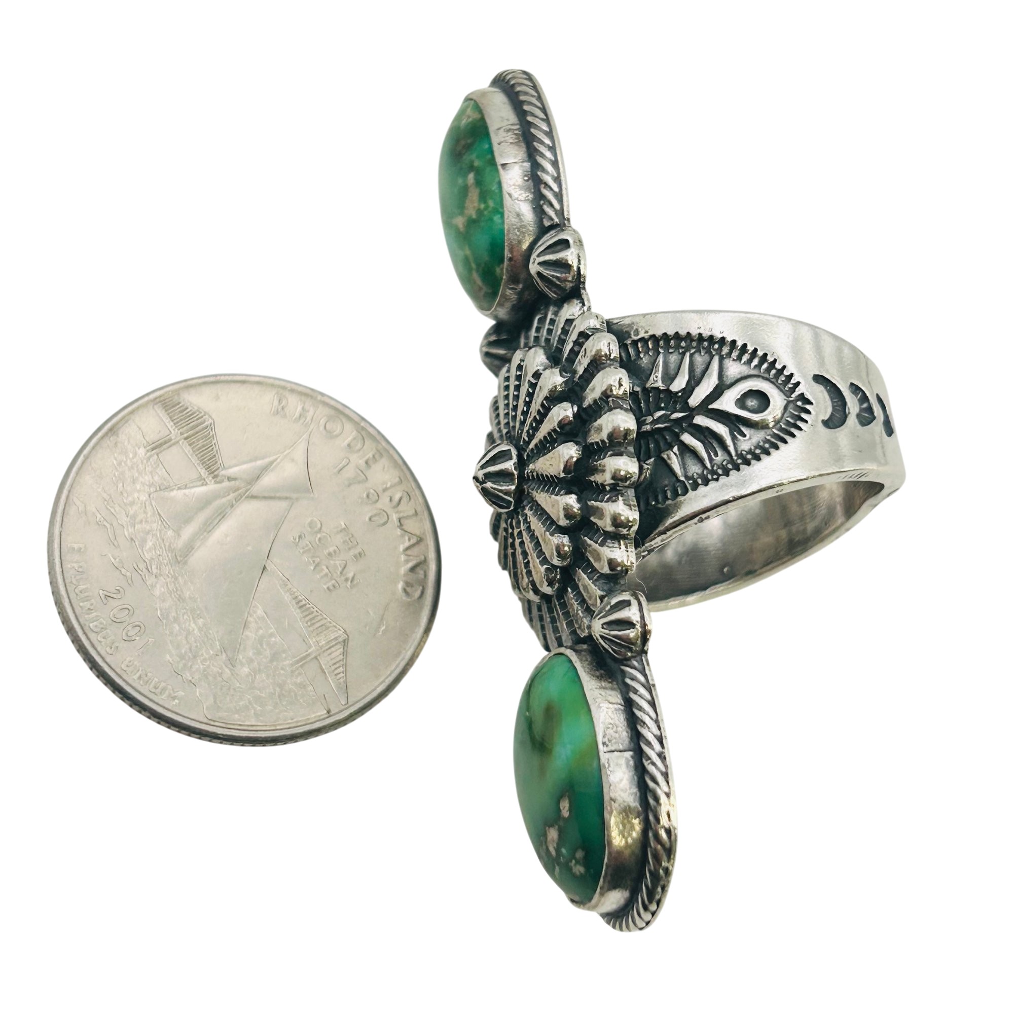 Sam Yellowhair Navajo Sterling Sonoran Gold Turquoise 2 stone statement ring Sz 7.5 22.49 grams