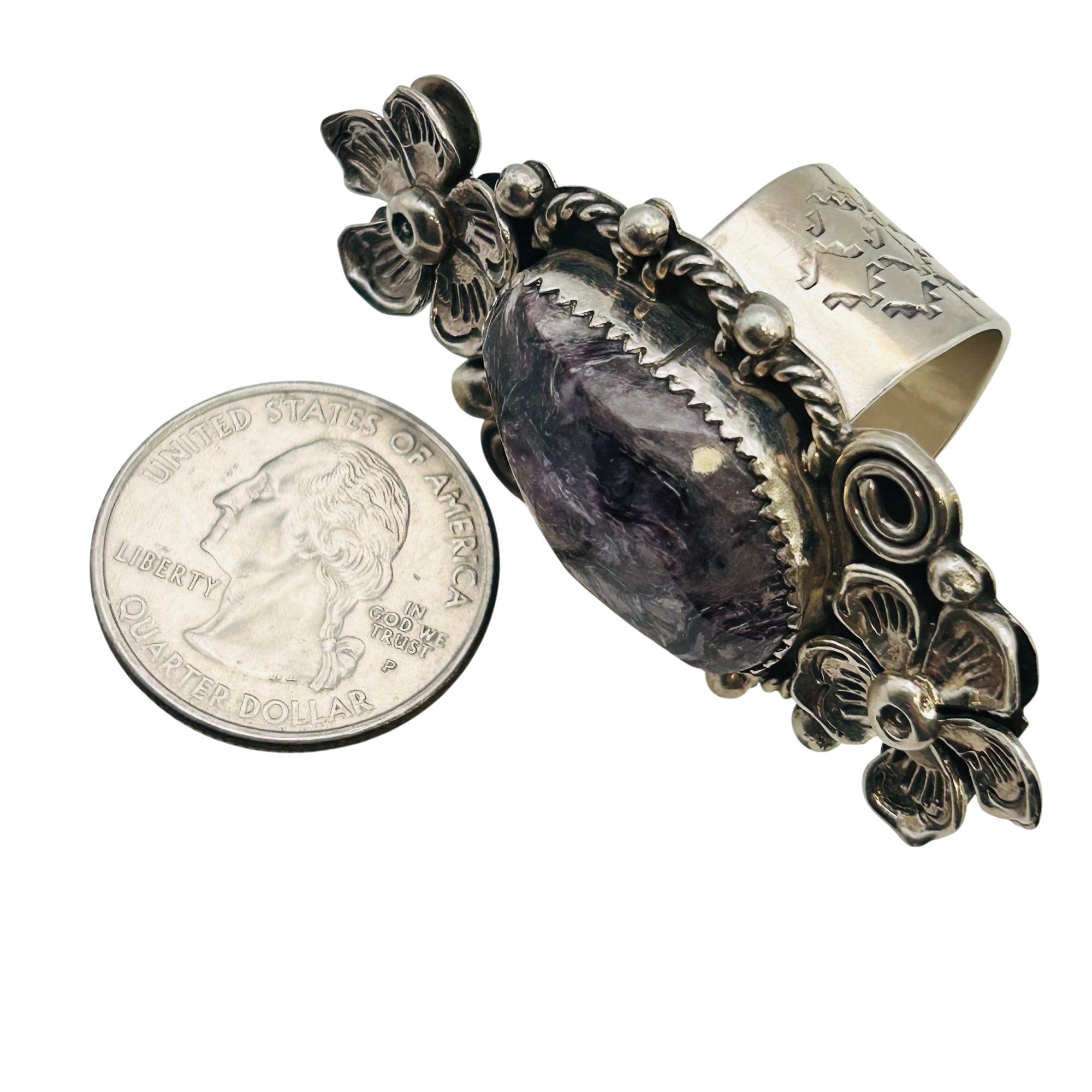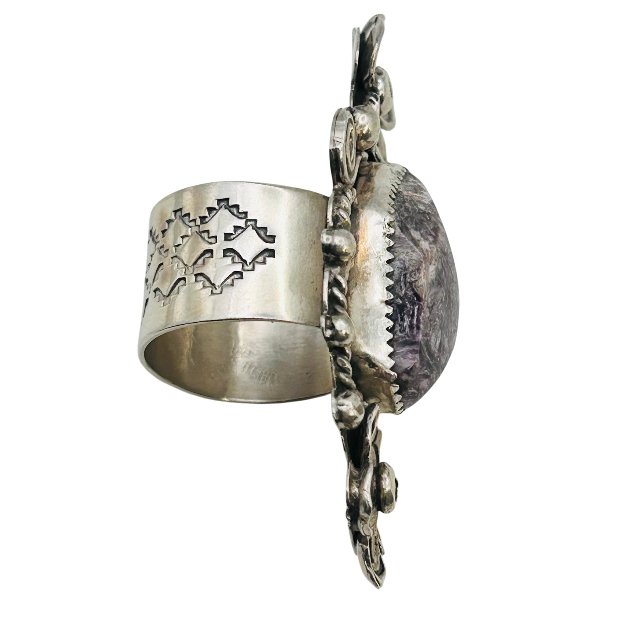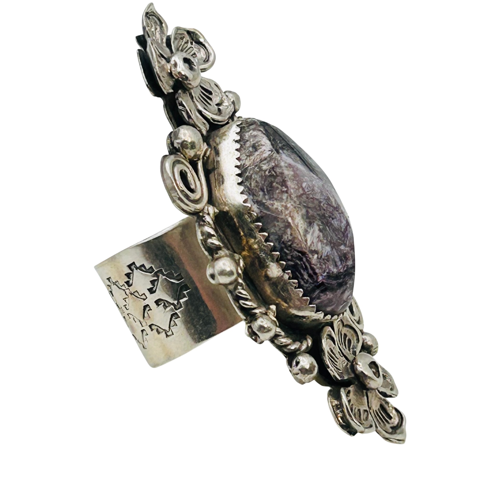 Delvin Brown Navajo Purple Stone Ring flower embellishment stamped wide band SZ. 8.5 20.18 grams
