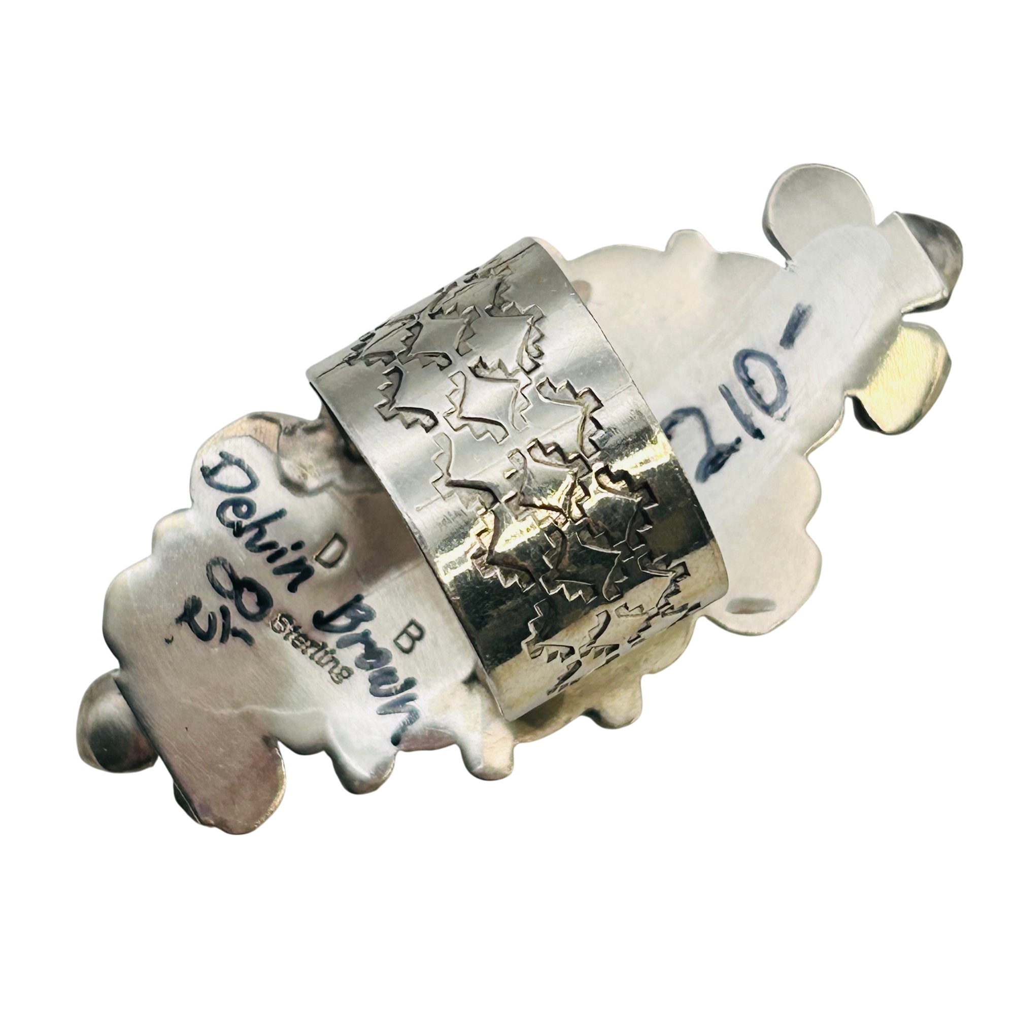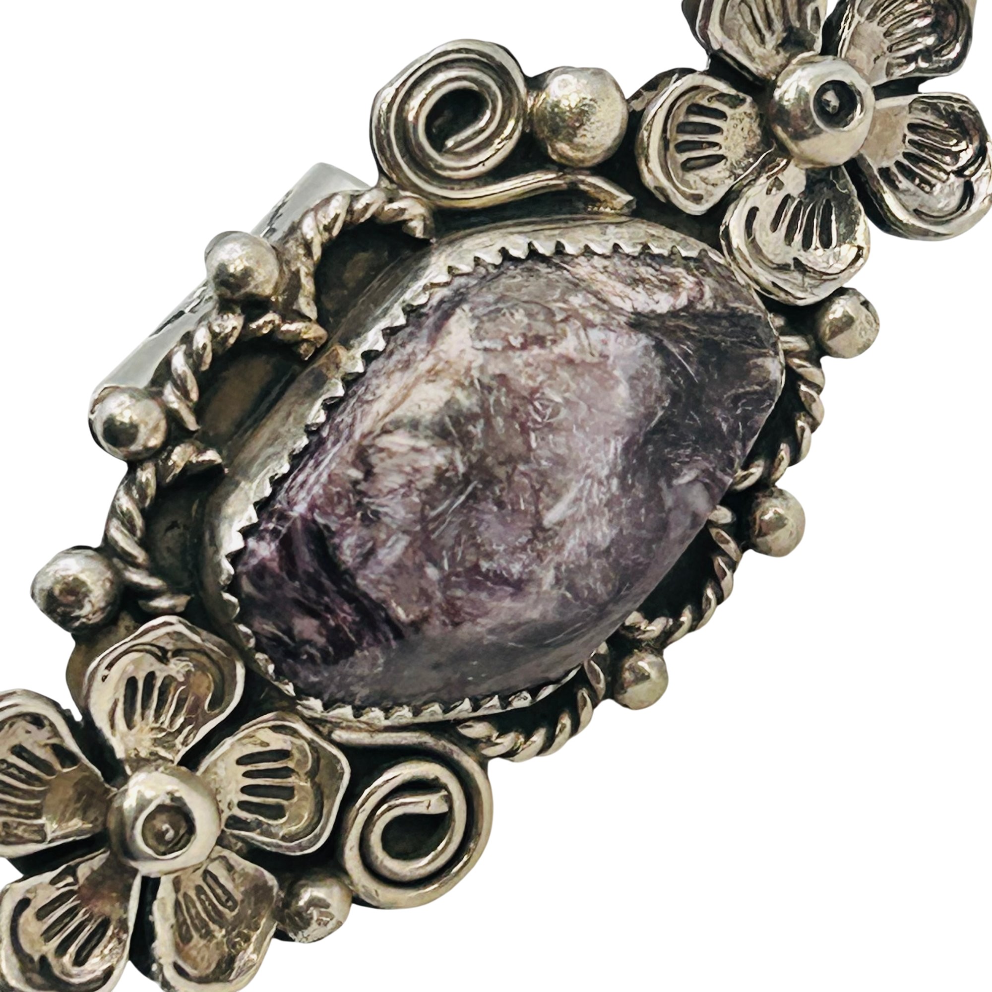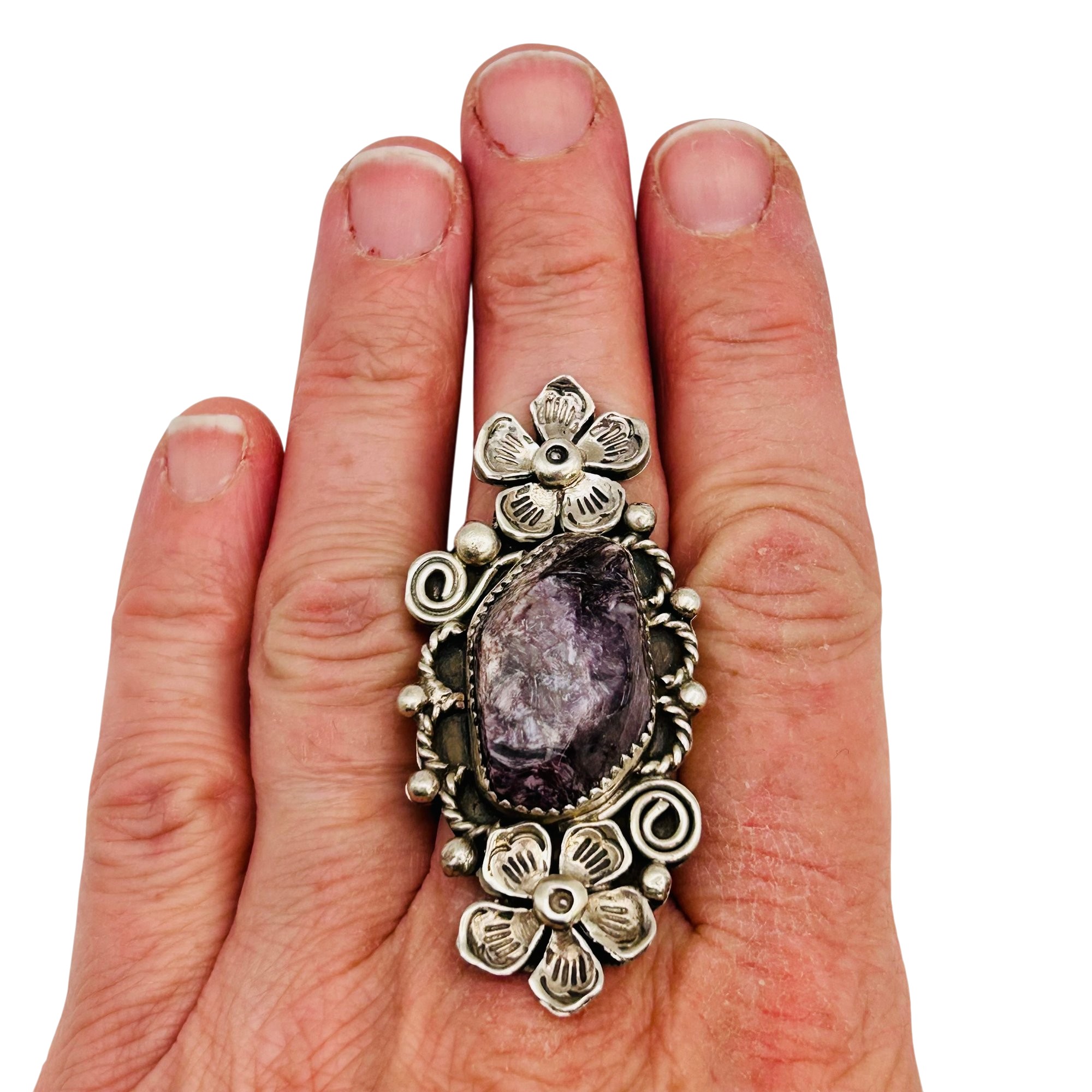Delvin Brown Navajo Purple Stone Ring flower embellishment stamped wide band SZ. 8.5 20.18 grams