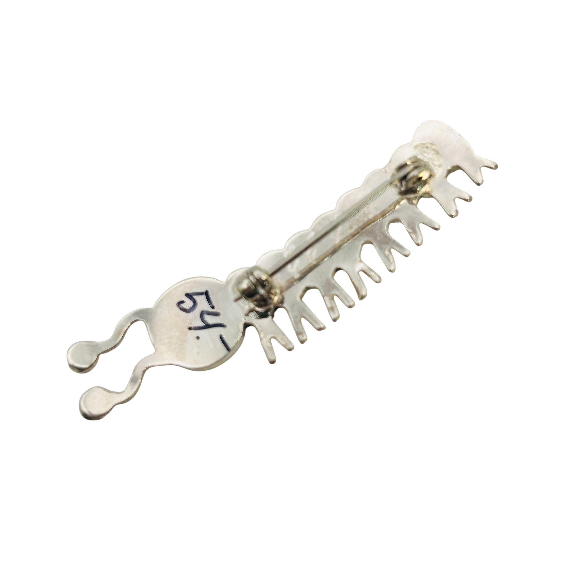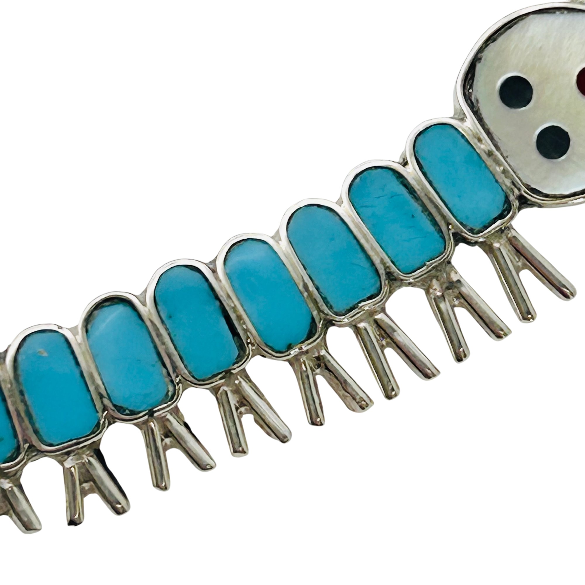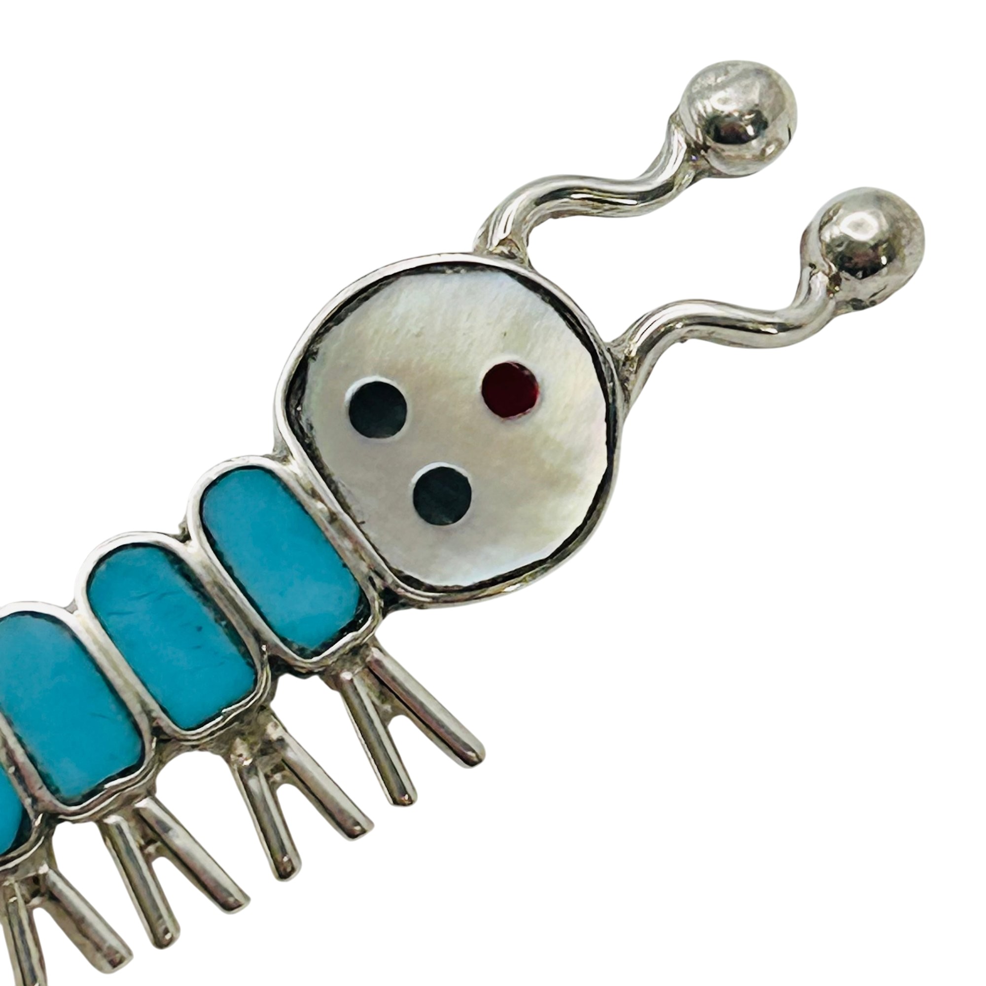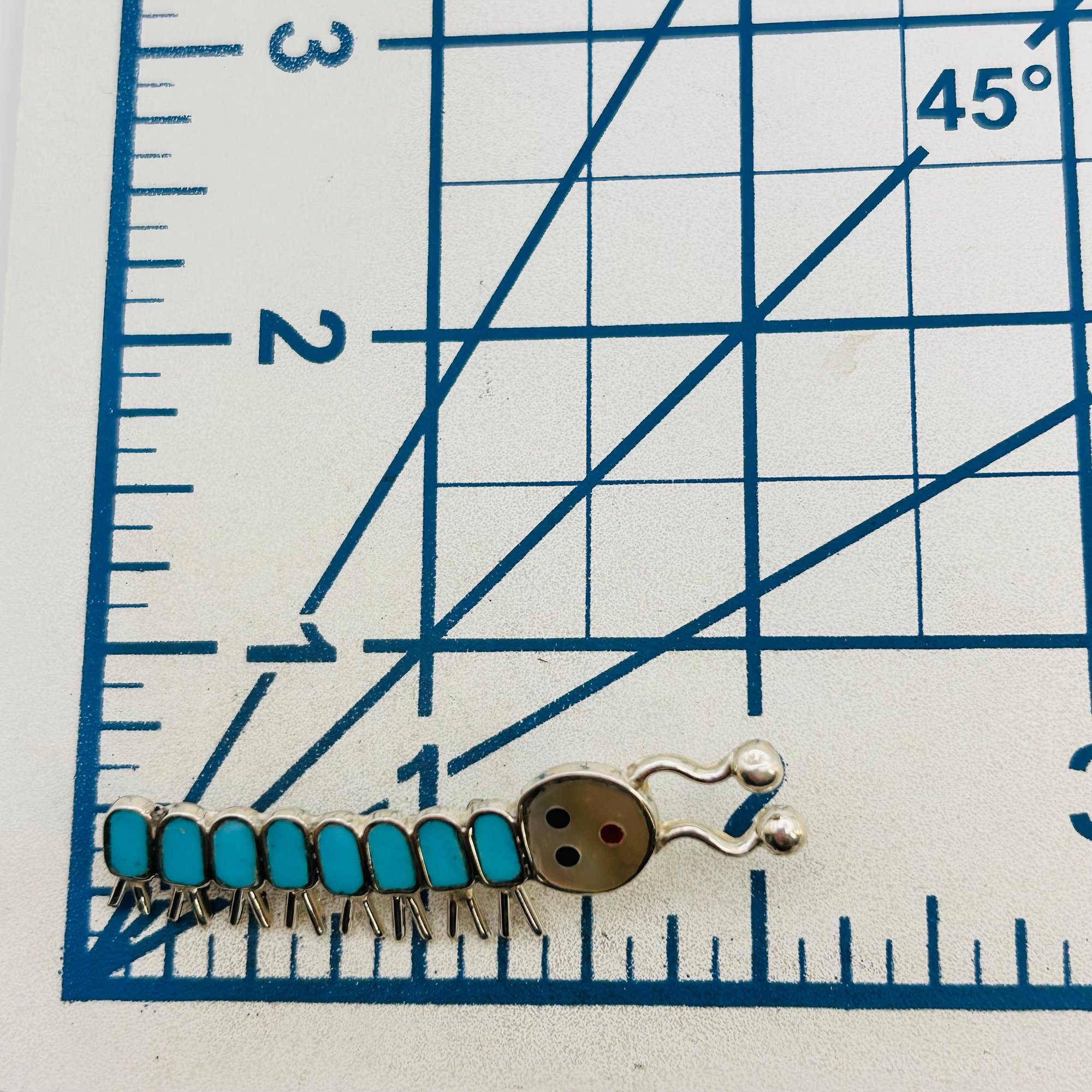Emma Edaakie Zuni Sterling Multi Stone Turquoise Mother of Pearl and Coral Caterpillar Pin 4.14 grams